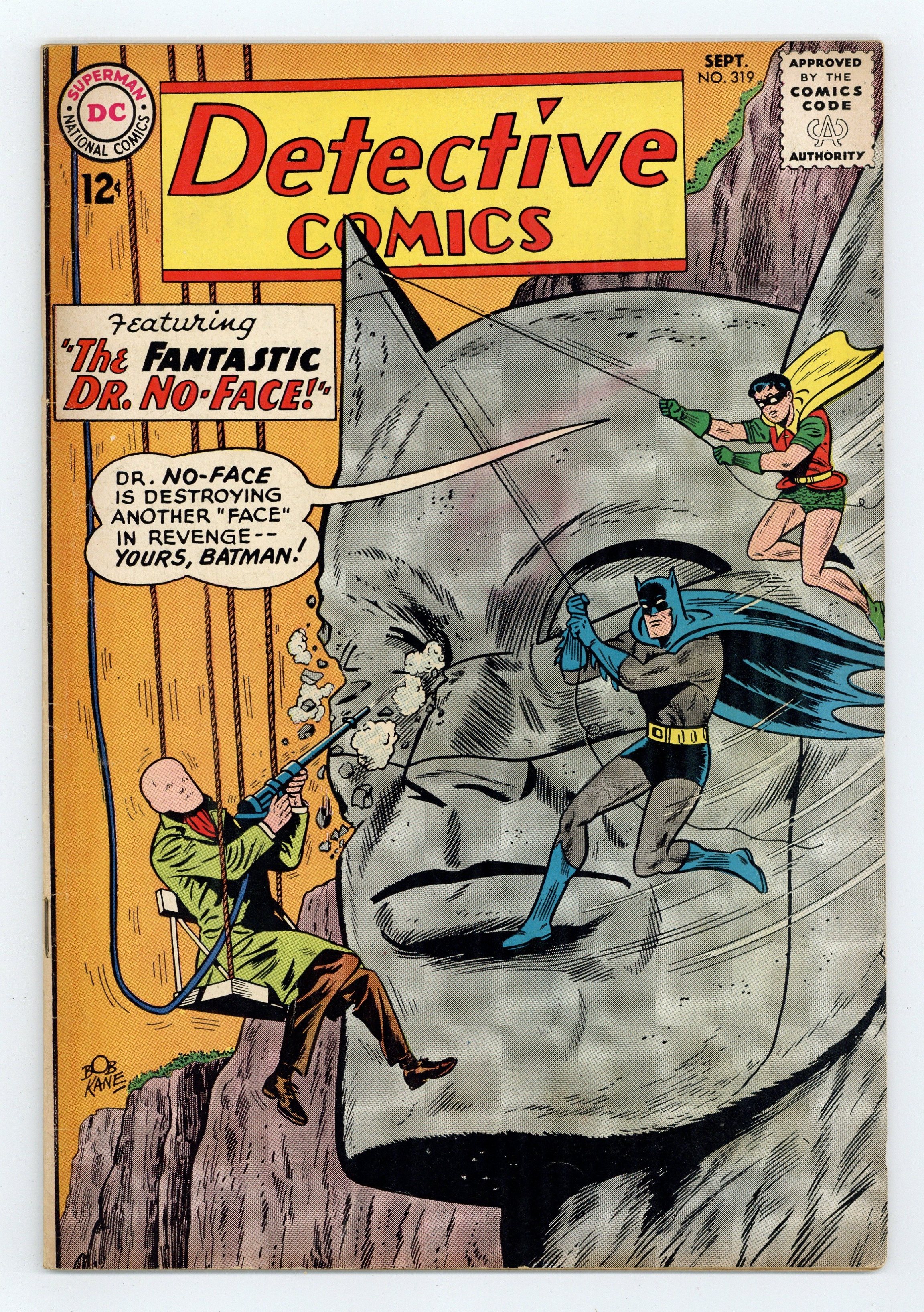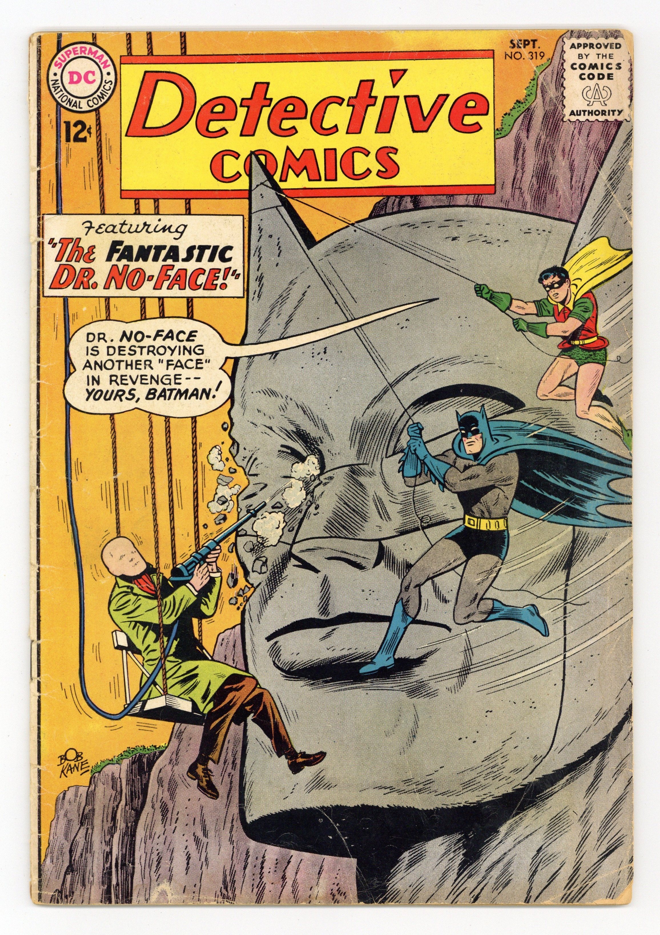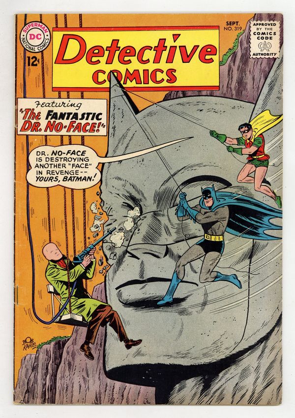 Cover art by Sheldon Moldoff. "The Fantastic Dr. No-Face" starring Batman and Robin, script by Dave Wood, pencils by Sheldon Moldoff, inks by Charles Paris; Doctor Paul Dent becomes a faceless criminal, after a serious accident with a machine he created in order to erase scars from skin tissue; Adopting the alias of Dr. No-Face, he begins a crime spree whose motif is mutilating representations of faces; Batman and Robin capture him, not knowing that such is part of No-Faces plan; However, after a quick investigation of the particular modus operandi, the Dynamic Duo learn that No Face is in fact the criminal known as Bart Regan, who was impersonating Dent during the experiment and after he lost his facial features, he decided to start the crime spree in order to frame Dent while he was exonerated. The Money Detectives article. "J'onn J'onzz--Wizard of 1463" starring John Jones Manhunter from Mars, art by Joe Certa; Manhunter goes on vacation and finds himself lost in the past. Casey the Cop humor page by Henry Boltinoff. 36 pgs., full color. Cover price $0.12.