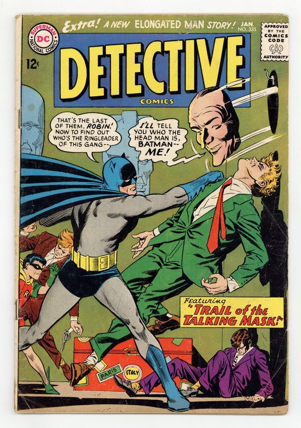 Written by Gardner Fox. Art by Carmine Infantino and Joe Giella. Cover by Carmine Infantino and Joe Giella. Trail of the Talking Mask!; Hugh Rankin almost gets himself killed trying to stop the Make-Up Man on his own; Batman and Robin take over. Written by Gardner Fox. Art by Carmine Infantino and Sid Greene. Break Up the Bottle-Neck Gang!; Elongated Man story featuring kids dressed as Flash, Batman, and Green Lantern. Salute to Courage public service announcement by Jack Schiff, art by Sheldon Moldoff. Missive from letter hack Guy Lillian III. 36 pages, full color. $0.12. Cover price $0.12.