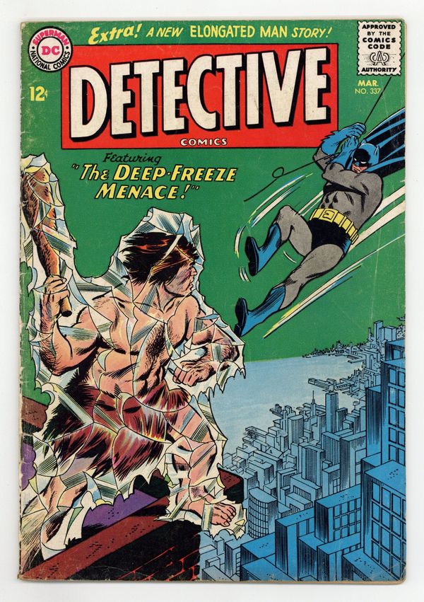 Written by Gardner Fox. Art by Carmine Infantino and Joe Giella. Cover by Carmine Infantino and Joe Giella. Deep-Freeze Menace!; Batman and Robin battle a caveman named Klag, who has various super-human abilities, including flight, super strength, and the ability to spray gas from his icy armor. Written by Gardner Fox. Art by Carmine Infantino and Sid Greene. Case of the 20 Grand Pay-Off! starring Ralph Elongated Man Dibny and his wife, Sue Dibny. Friends Across the Seas public service announcement by Jack Schiff, art by Sheldon Moldoff. Letter to the editor from comics writer Mike Friedrich and letter hack Guy Lillian III. The FBI Crime Laboratory article by Julius Schwartz, art by Morris Waldinger and Tom Nicolosi. 36 pages, full color. $0.12. Cover price $0.12.