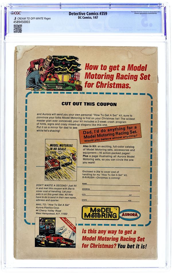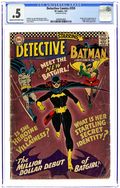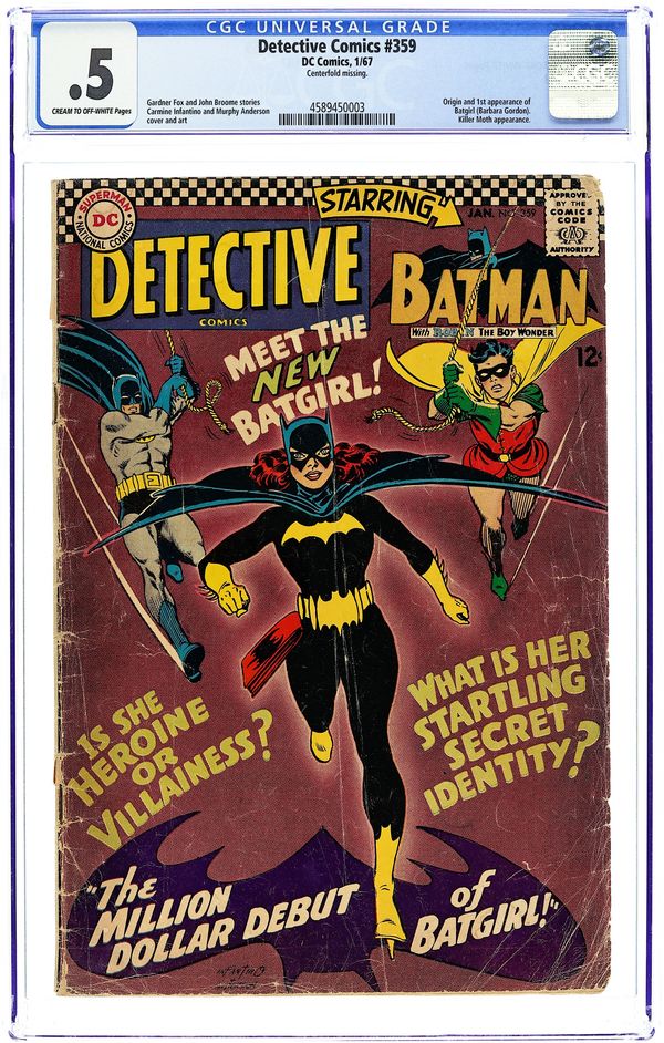 Written by Gardner Fox. Art by Carmine Infantino and Sid Greene. Cover by Carmine Infantino and Murphy Anderson. 1st appearance of the new Batgirl (Barbara Gordon) in The Million Dollar Debut of Batgirl!; Batgirl goes to a costume party dressed as Batgirl; she sees Killer Moth attack Bruce Wayne. Written by Gardner Fox. Art by Murphy Anderson. Riddle of the Sleepytime Taxi!; Ralph Elongated Man Dibny and Sue fall asleep in the back seat of a taxi while going to a costume party; Ralph discovers that crooks criminals are putting passengers to sleep to copy secret documents. Cap's Hobby Hints activity page by Henry Boltinoff. Letter to the editor from comics writer Mark Evanier. 36 pages, full color. $0.12. Cover price $0.12.