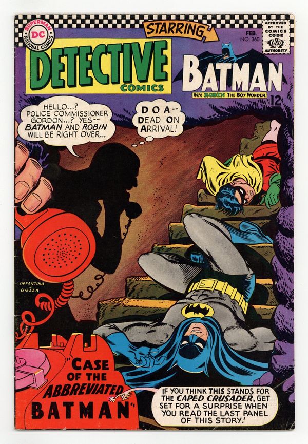 Cover by Carmine Infantino and Joe Giella. Written by Gardner Fox. Art by Sheldon Moldoff (ghosting for Bob Kane) and Joe Giella. The Case of the Abbreviated Batman!; After capturing Gunshy Barton, Batman sends him and his gang to jail, where Gunshy learns shorthand and teaches to his gang, making his crimes easier to pull off without getting caught. Written by Gardner Fox. Art by Murphy Anderson. London Caper of the Rockers and Mods!; Ralph Elongated Man Dibny goes to London and sees Big Ben running backwards; a gang of teenage Mods are responsible. Billy humor page by Henry Boltinoff. Statement of ownership--average print run 617,000; average paid circulation 404,339. 36 pgs. Cover price $0.12.