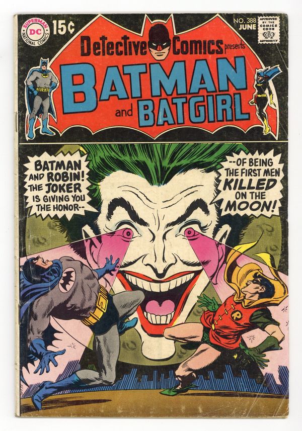 $49.00First 15-cent cover-price. Cover by Irv Novick. "Public Luna-Tic Number One!," script by John Broome, pencils by Bob Brown, inks by Joe Giella; The Joker steals an anti-gravity device and uses it to facilitate his robberies and to trap Batman and Robin. "Surprise! This'll Kill You!," script by Frank Robbins, pencils by Gil Kane, inks by Murphy Anderson; A fake Batman appears in this Batgirl story, as well as a costume party with people dressed as Superman, the Flash, and Green Lantern. Letters of comment from comics writers Tony Isabella and Donald F. McGregor. 36 pgs., full color. $0.15. Cover price $0.15.