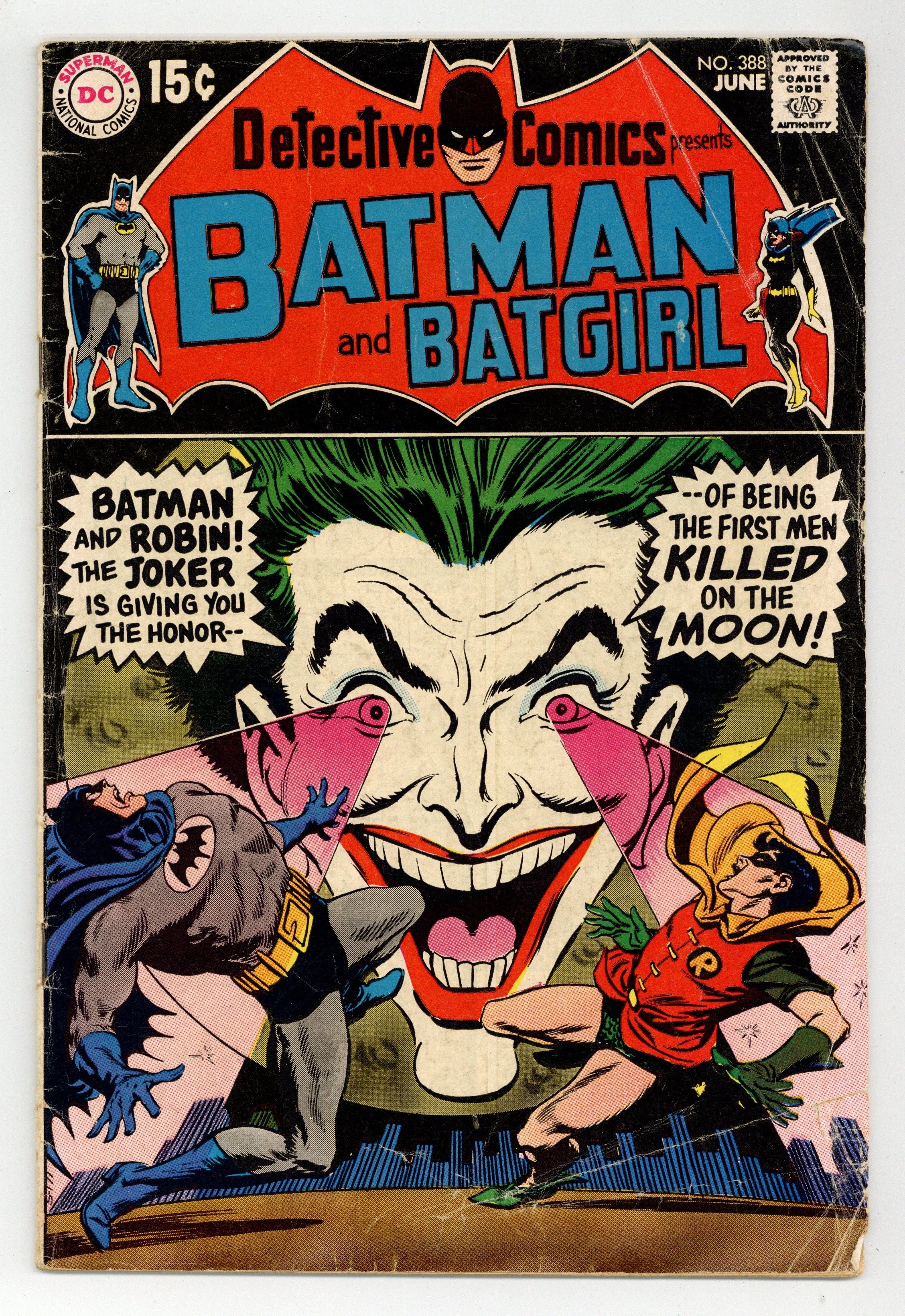 $55.00First 15-cent cover-price. Cover by Irv Novick. "Public Luna-Tic Number One!," script by John Broome, pencils by Bob Brown, inks by Joe Giella; The Joker steals an anti-gravity device and uses it to facilitate his robberies and to trap Batman and Robin. "Surprise! This'll Kill You!," script by Frank Robbins, pencils by Gil Kane, inks by Murphy Anderson; A fake Batman appears in this Batgirl story, as well as a costume party with people dressed as Superman, the Flash, and Green Lantern. Letters of comment from comics writers Tony Isabella and Donald F. McGregor. 36 pgs., full color. $0.15. Cover price $0.15.