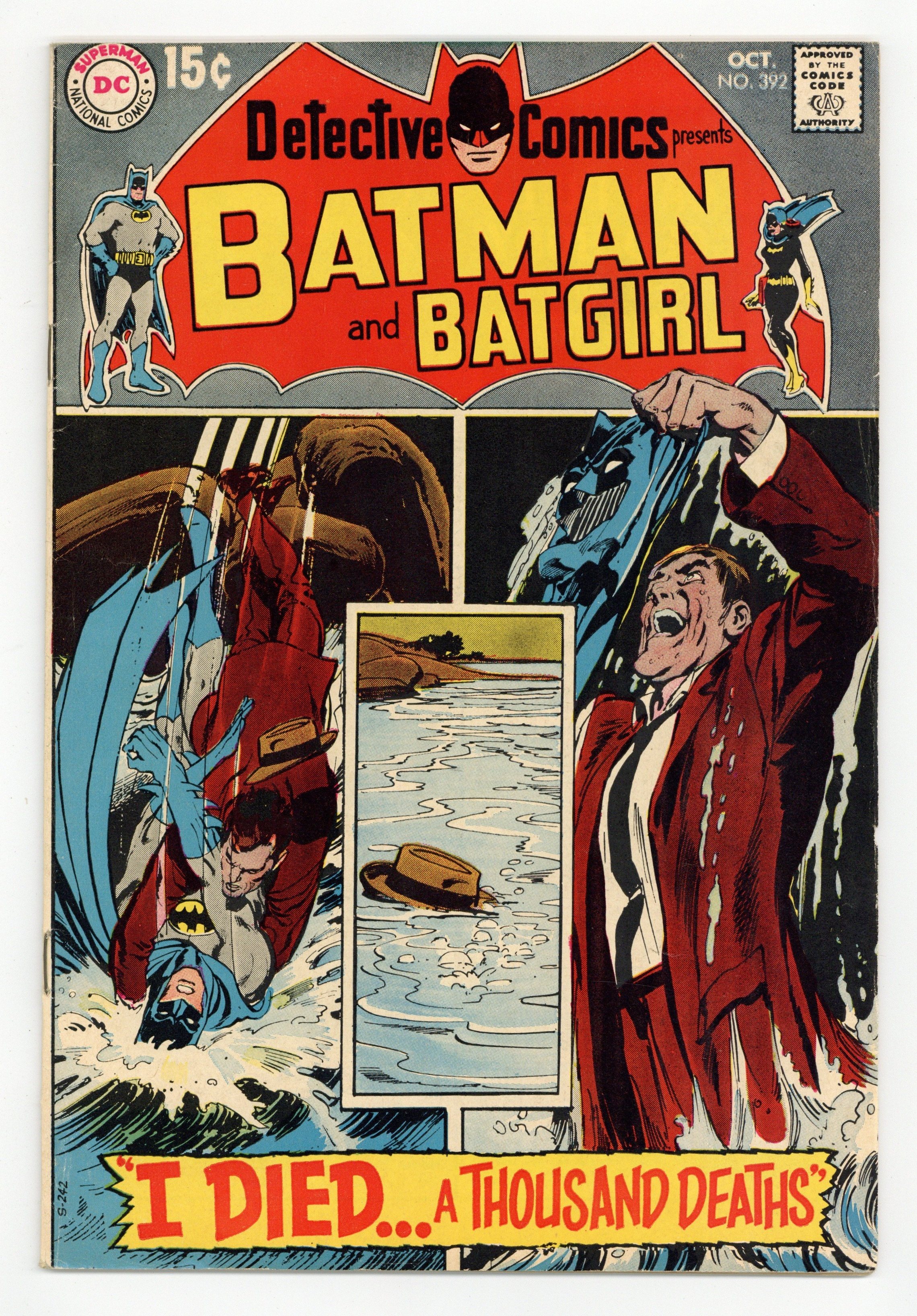Cover by Neal Adams. "I Died... A Thousand Deaths!," script by Frank Robbins, pencils by Bob Brown, inks by Joe Giella; Batman appears to have been killed in a watery fight with gangster Angles Moore, but Moore and his boss Scap Scarpel are plagued by ghostly reminders of Batman everywhere they go. Super Goof! one-page story by John Costanza. "A Clue... Seven-Foot Tall!," script by Frank Robbins, pencils by Gil Kane, inks by Murphy Anderson; On her way to work Barbara Gordon spots a spectator of a mugging in Gotham Park; Later when this individual shows up at the library, he introduces himself as criminologist Jason Bard; Finding his background in criminology interesting she goes with him back to the scene of the crime where he points out that the mugger must have been seven feet tall. 36 pgs., full color. $0.15. Cover price $0.15.
