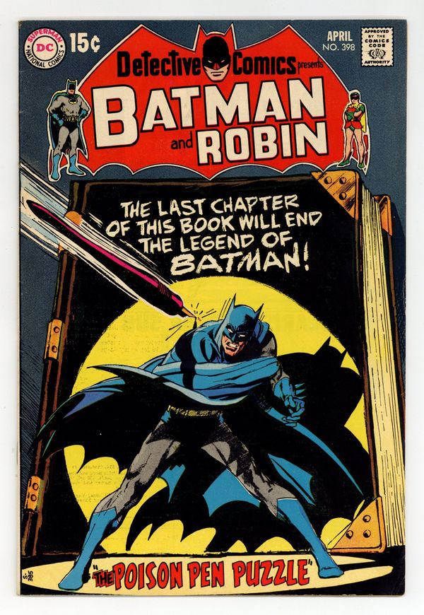 Cover by Neal Adams. "The Poison-Pen Puzzle!," script by Frank Robbins, pencils by Bob Brown, inks by Joe Giella; On a trip to Hollywood to check out a movie studio on whose board he now sits, Bruce Wayne must become Batman to solve the mystery of a novelist slain by a literally poisoned pen. Fingerprint Facts page. "Moon-Struck," script by Frank Robbins, pencils by Gil Kane, inks by Vince Colletta; While attending a science lecture as Dick Grayson, Robin sees a lunar rock turn another student green; Is it strange radiation from the moon, or a prank? Letter to the editor from Mike Barr. 36 pgs., full color. $0.15. Cover price $0.15.