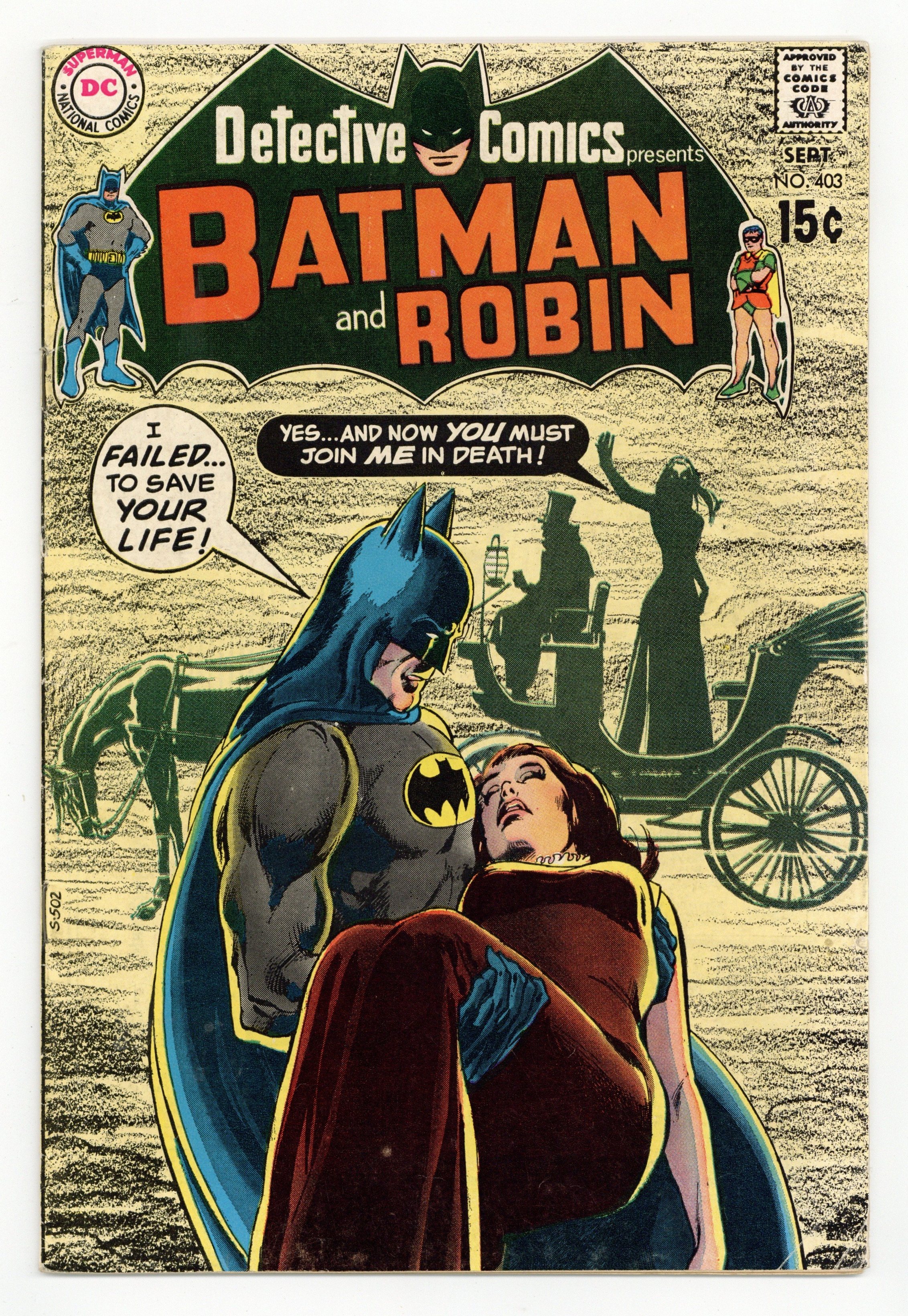 Cover by Neal Adams. "You Die By Mourning!," script by Frank Robbins, pencils by Bob Brown, Carmine Infantino (splash page only), inks by Frank Giacoia; Bruce Waynes V.I.P. office is visited by a mysterious woman who claims before running out that her husband will be murdered by morning, and Batman investigates. "Break-Out!," script by Mike Friedrich, pencils by Gil Kane, inks by Vince Colletta; Robin helps the police track down the escaped juvenile delinquents. Letter from comics writer Mike Barr. 36 pgs., full color. $0.15. Cover price $0.15.
