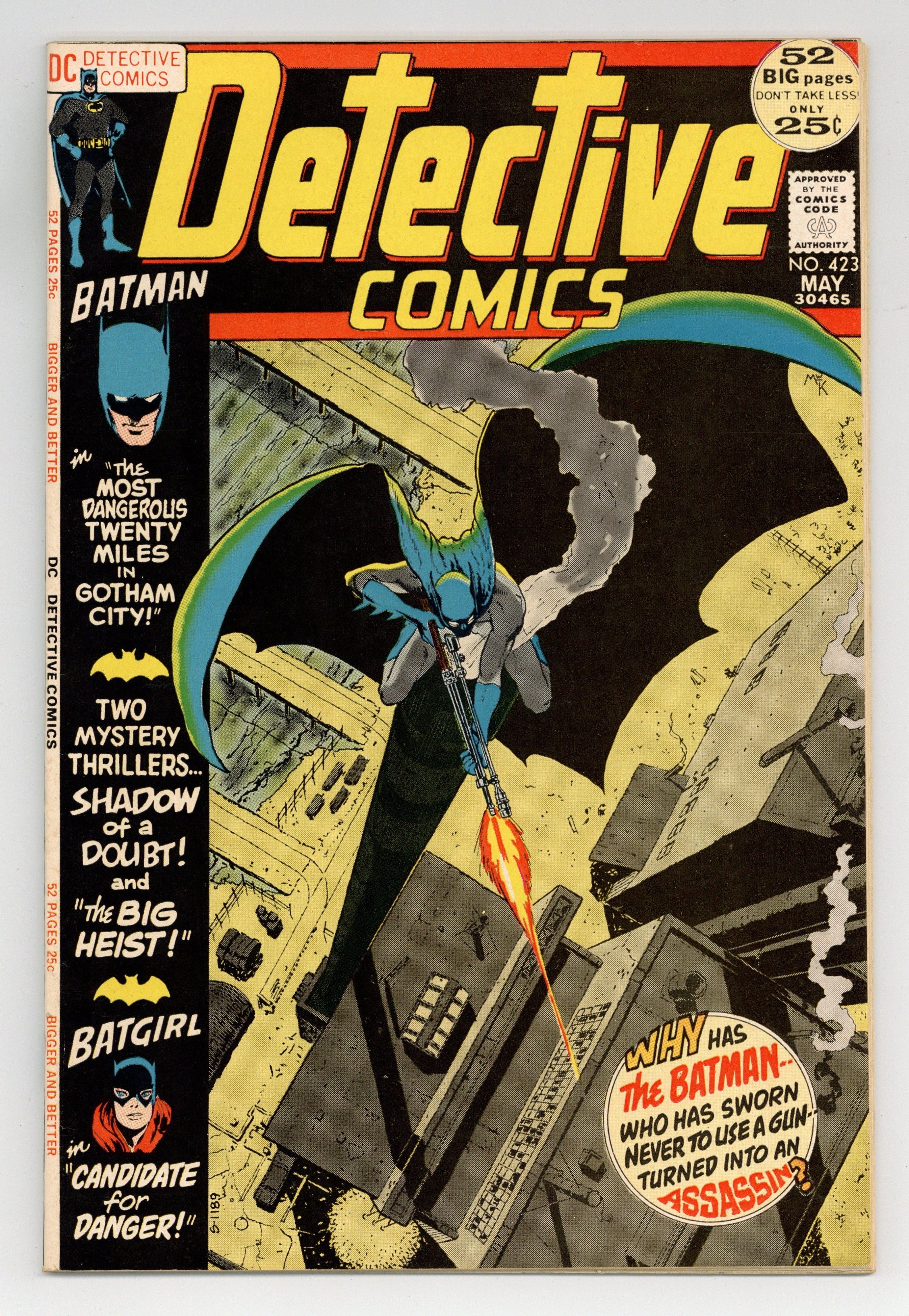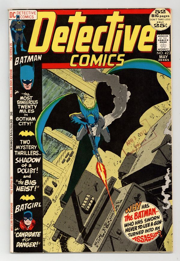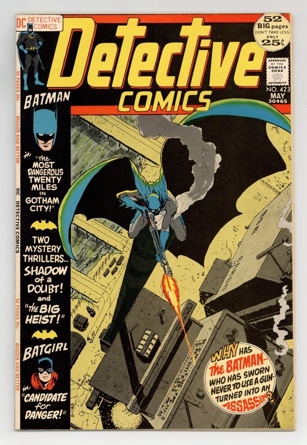 52-page giant issue. Cover by Mike Kaluta. "The Most Dangerous Twenty Miles in Gotham City," script by Frank Robbins, pencils by Bob Brown, inks by Dick Giordano; Batman helps foolproof a way to transfer a Communist spy to his masters in an exchange, to prevent a right-wing group from assassinating the agent during the act. "A Shadow of a Doubt!" starring Johnny Law, pencils by Irwin Hasen, inks by Joe Giella, reprinted from Big Town #15. "Candidate for Danger!," script by Frank Robbins, art by Don Heck; continuing from last issue, after busting former flame and previously convicted con-man, Barbara Gordon has come to the conclusion that she has not accomplishing anything as Batgirl and has just revealed her secret identity to her father to ask him to let her run for the position in congress that he is being pressured into running for; Telling Barbara that he already knew her secret identity and that he was proud of her, Commissioner Gordon lets her run for office. "The Big Heist," art by Ralph Mayo, reprinted from Gang Busters #26. Letter to the editor from cartoonist Michael Cherkas. Joe Weider ad featuring "Mr. Universe" Arnold Schwarzenegger. 52 pgs., full color. $0.25. Cover price $0.25.