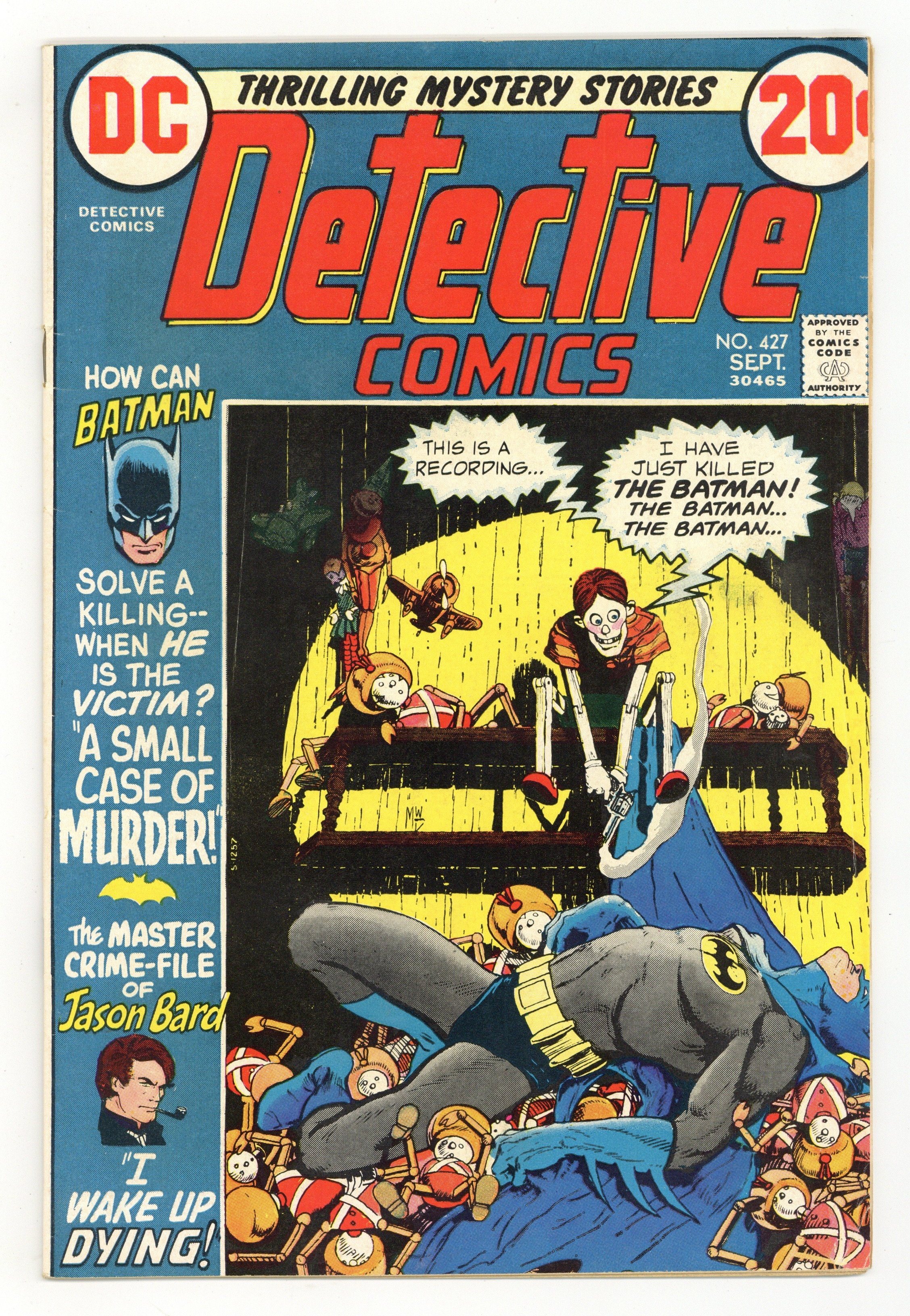 Cover by Mike Kaluta. "A Small Case of Murder!," script by Frank Robbins, pencils by Irv Novick, inks by Dick Giordano; Batman investigates the case of a toy manufacturer murdered by a gun-wielding toy doll. "I Wake Up Dying!," script by Frank Robbins, art by Don Heck; Jason Bard is set up for a killing after being hired to find a gangsters lost wife. 36 pgs., full color. $0.20. Cover price $0.20.