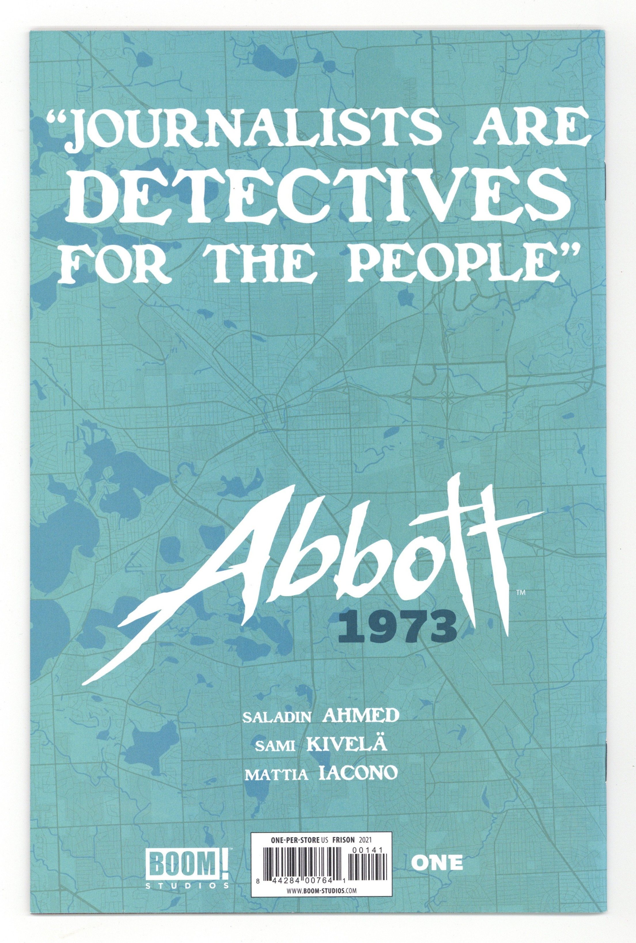 Published Jan 2021 by Boom Studios.$14.00Written by Saladin Ahmed. Art by Sami Kivela. Cover by Jenny Frison. In a new series for fans of Something is Killing the Children and Bitter Root, Saladin Ahmed, the visionary writer behind Miles Morales: Spider-Man, and Sami Kivelä, the acclaimed artist behind Tommy Gun Wizards, reunite for this Must Read supernatural thriller. * Detroit's hardest hitting journalist, Elena Abbott, is trying to make a fresh start at a new newspaper...but her deadly past isn't ready to let go. * The city is days away from the historic election of a Black candidate as their new Mayor, but a vicious new group has emerged to destroy him, targeting anyone who supports his campaign or the change he represents. * That means Abbott, who discovers the group's connection to a dangerous dark magic, has been targeted for certain death - unless she embraces her true power as the Lightbringer to save her city. 32 pages, full color. Cover price $3.99.