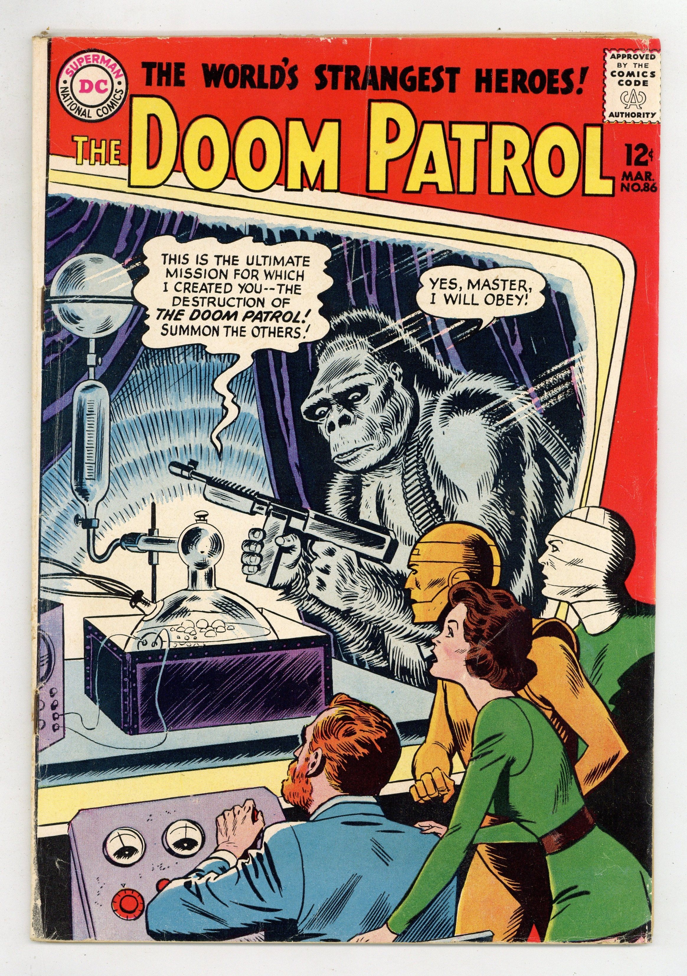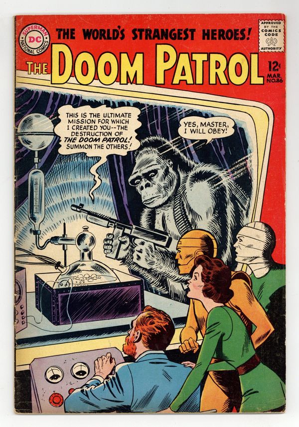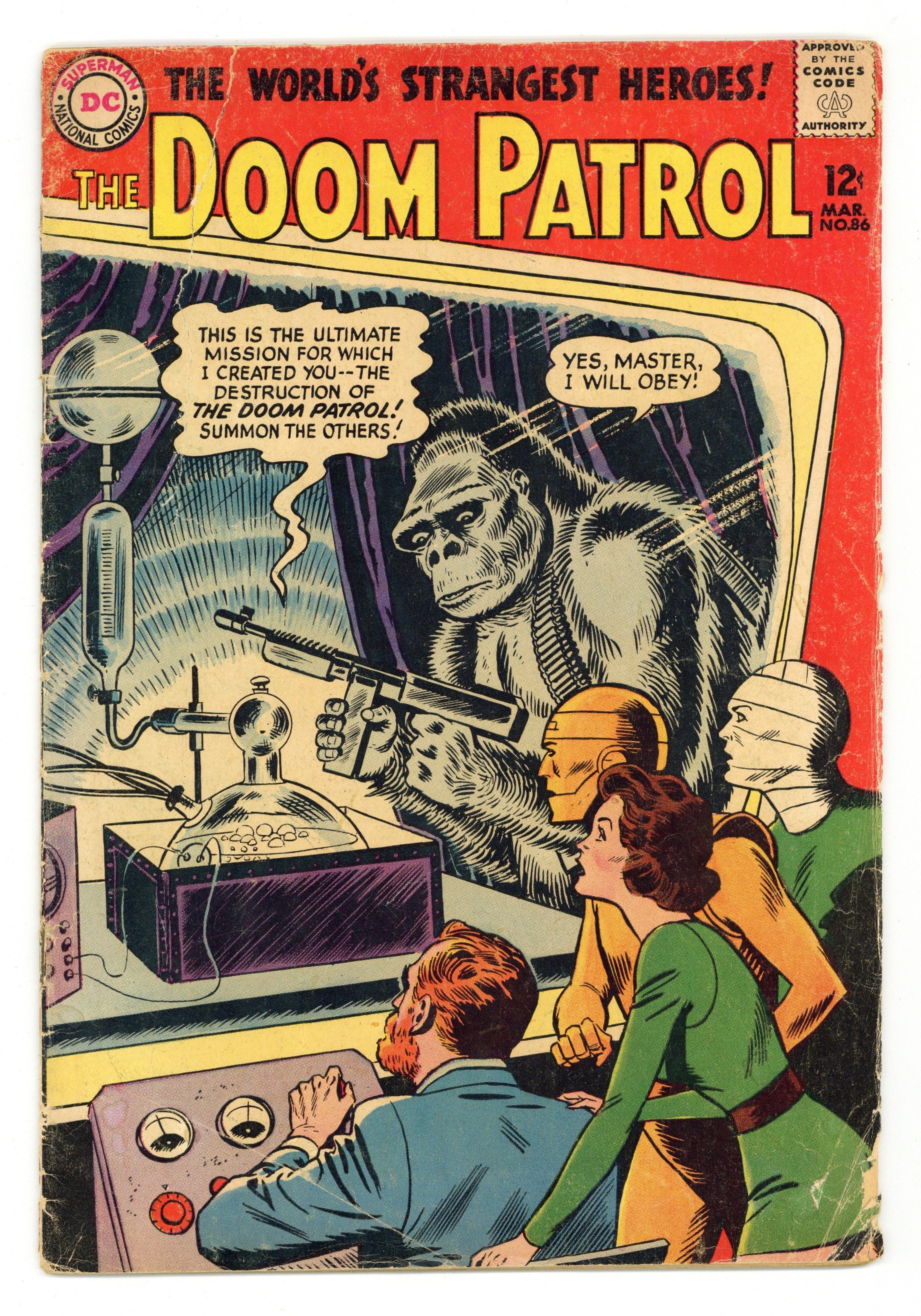 Cover art by Bob Brown. The Brotherhood of Evil (part 1), script by Arnold Drake, art by Bruno Premiani; The Doom Patrol create gifts for The Chief for his birthday. The Trail of the Terrible Titan (part 2), script by Arnold Drake, art by Bruno Premiani; Mr. Morden steals the giant robot Rog and attacks the Doom Patrol in an attempt to join the Brotherhood of Evil. A Medal for Go-Buggy 3!, script and art by Howard Purcell. 36 pgs. $0.12. Cover price $0.12.