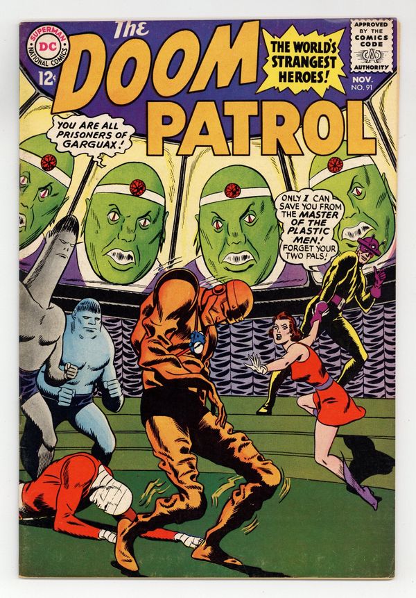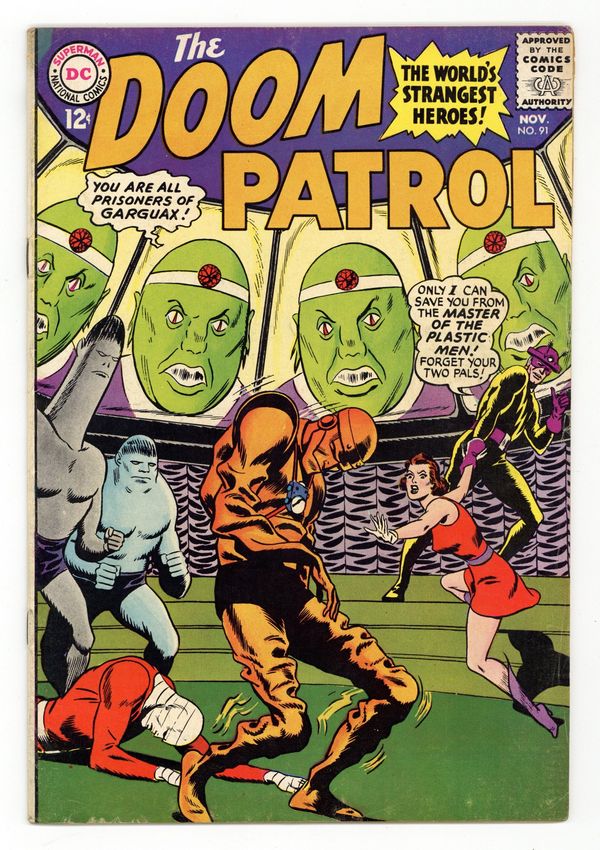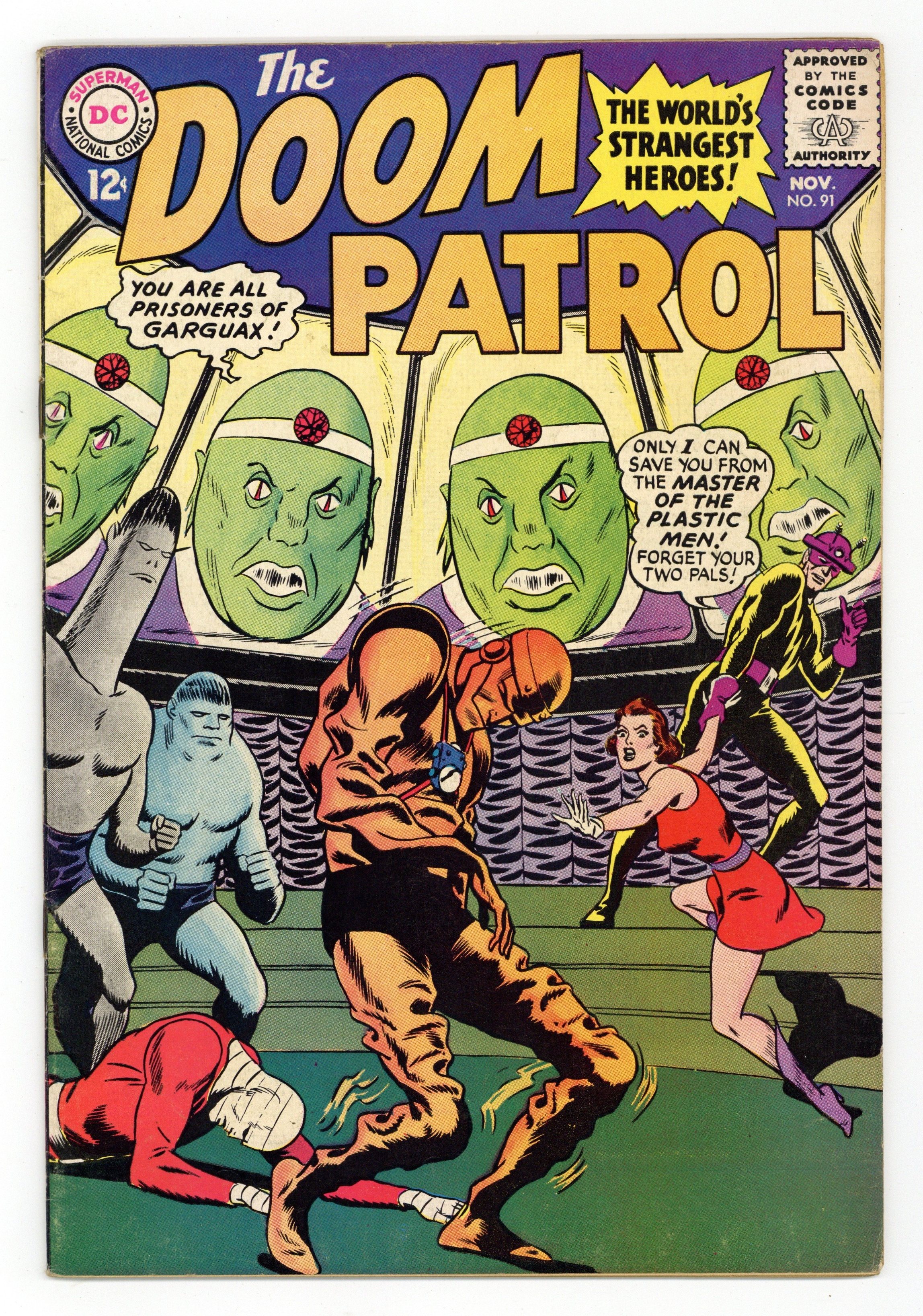 Cover by Bob Brown. Mento--the Man Who Split the Doom Patrol (part 1), script by Arnold Drake, art by Bruno Premiani; The Doom Patrol are called to a prison where a nitro-bomb has been placed to destroy the institution unless the prisoners demands are met; When the Doom Patrol tries to stop the bomb, they are stopped by a man named Mento, who uses his mental power enhancing helmet to dispose of the bomb; Mento expresses his intention to court Rita and tries convince her to leave the Doom Patrol and team up with him. Professor Eureka humor page by Henry Boltinoff. Terror of the Android Master (part 2). Willy and Dilly humor page by Henry Boltinoff. Fortress in the Stratosphere (part 3). Letter to the editor from comic artist Dave Cockrum. 36 pgs., full color. $0.12. Cover price $0.12.