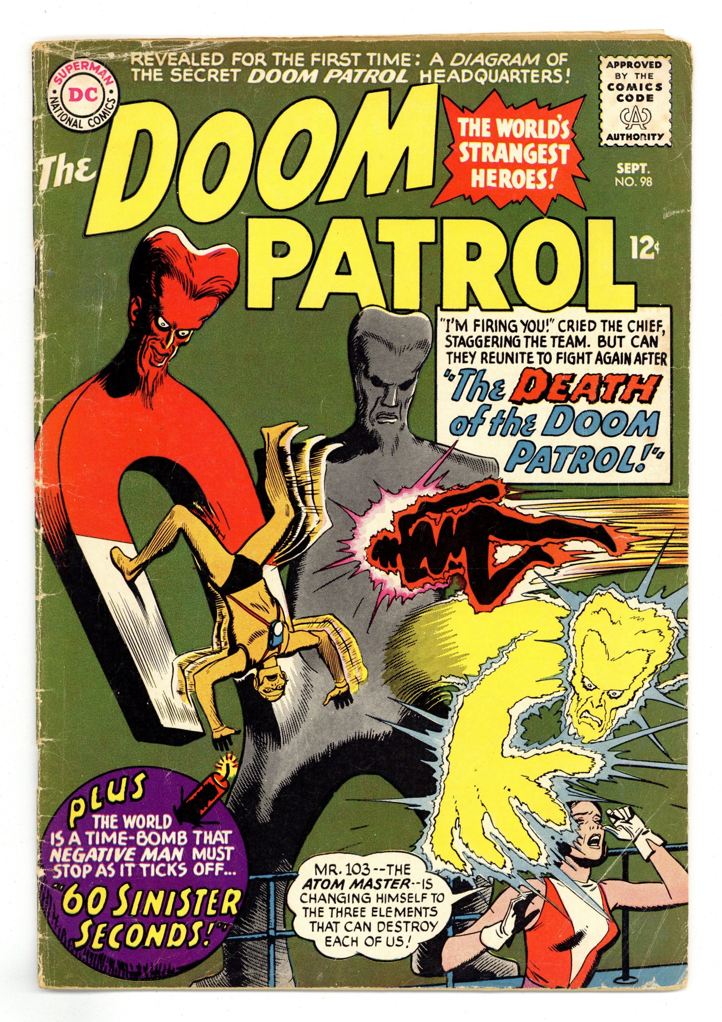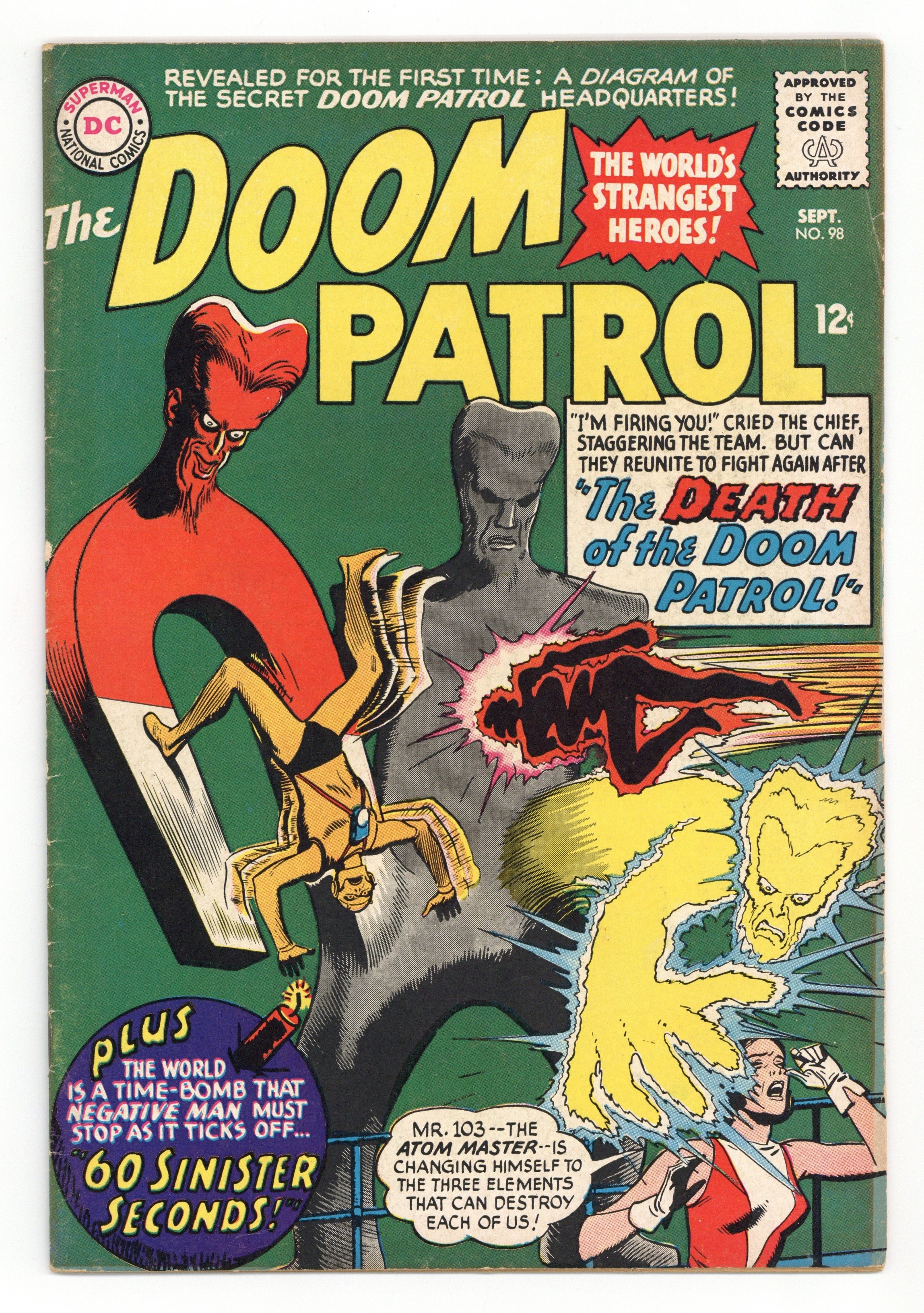 Cover by Bruno Premiani. The Death of the Doom Patrol (part 1), script by Arnold Drake, art by Bruno Premiani; During a training session, the Doom Patrol are called to the control room by the Chief, who explains to the Doom Patrol that he is disbanding the group; He tells them because he considers them nothing but failures and intends to replace them with a brand new team; As the Doom Patrol members leave, Robotman suggests that they continue on without the Chief. It Takes a Chief to Kill a Chief (part 2). 60 Sinister Seconds, script by Arnold Drake, art by Bob Brown; A cabal is paid $4,000,000 to detonate 4 bombs secreted throughout the world simultaneously to precipitate World War III. Little Pete humor page by Henry Boltinoff. Comic writer and publisher Mike Friedrich gets mentioned on the letters page. 36 pgs., full color. $0.12. Cover price $0.12.