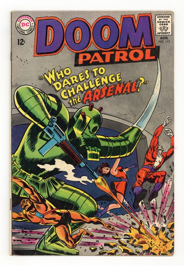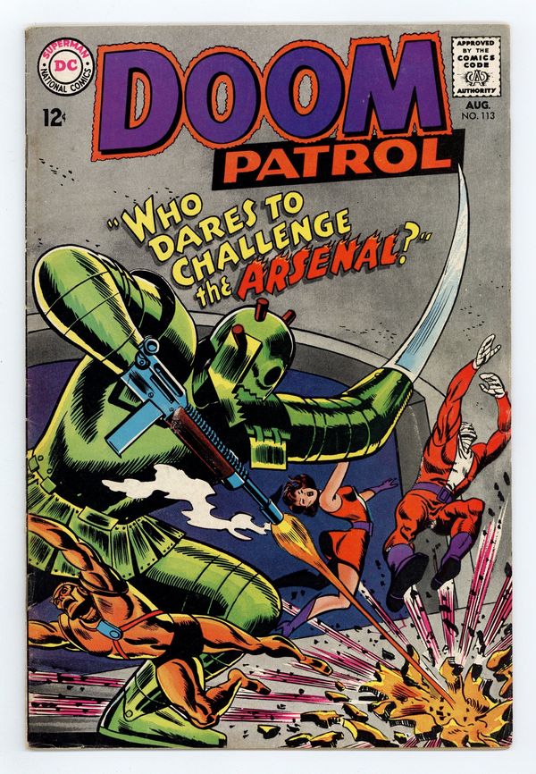 Cover art by Bob Brown. Who Dares to Challenge the Arsenal, script by Arnold Drake, art by Bruno Premiani; Doom Patrol battle Arsenal; the Chief tries to fix Madame Rouge's mixed up brain patterns. Cap's Hobby Hints activity half-page by Henry Boltinoff. Diamonds of Destiny starring Beast Boy, script by Arnold Drake, art by Bruno Premiani. 36 pgs. $0.12. Cover price $0.12.