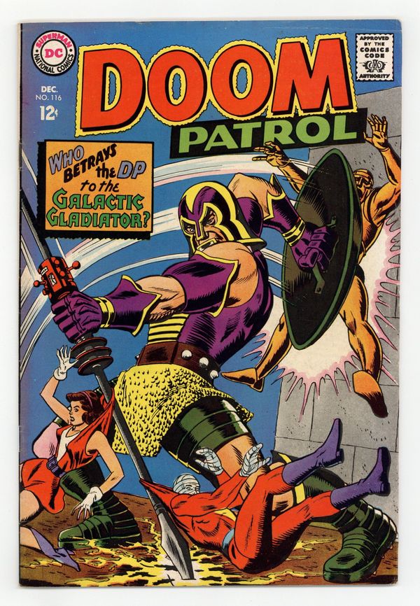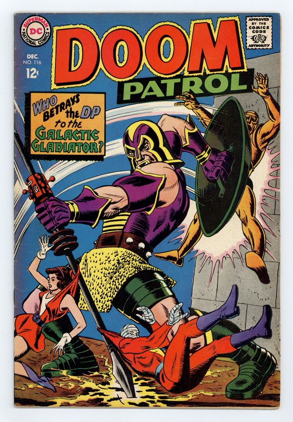 Cover art by Bob Brown. Two to Get Ready... and Three to Die!, script by Arnold Drake, art by Bruno Premiani; Madame Rouge's two personalities battle for domination of her body; The Doom Patrol finally stop the mutants. Moolah humor page by Henry Boltinoff. 36 pgs. $0.12. Cover price $0.12.