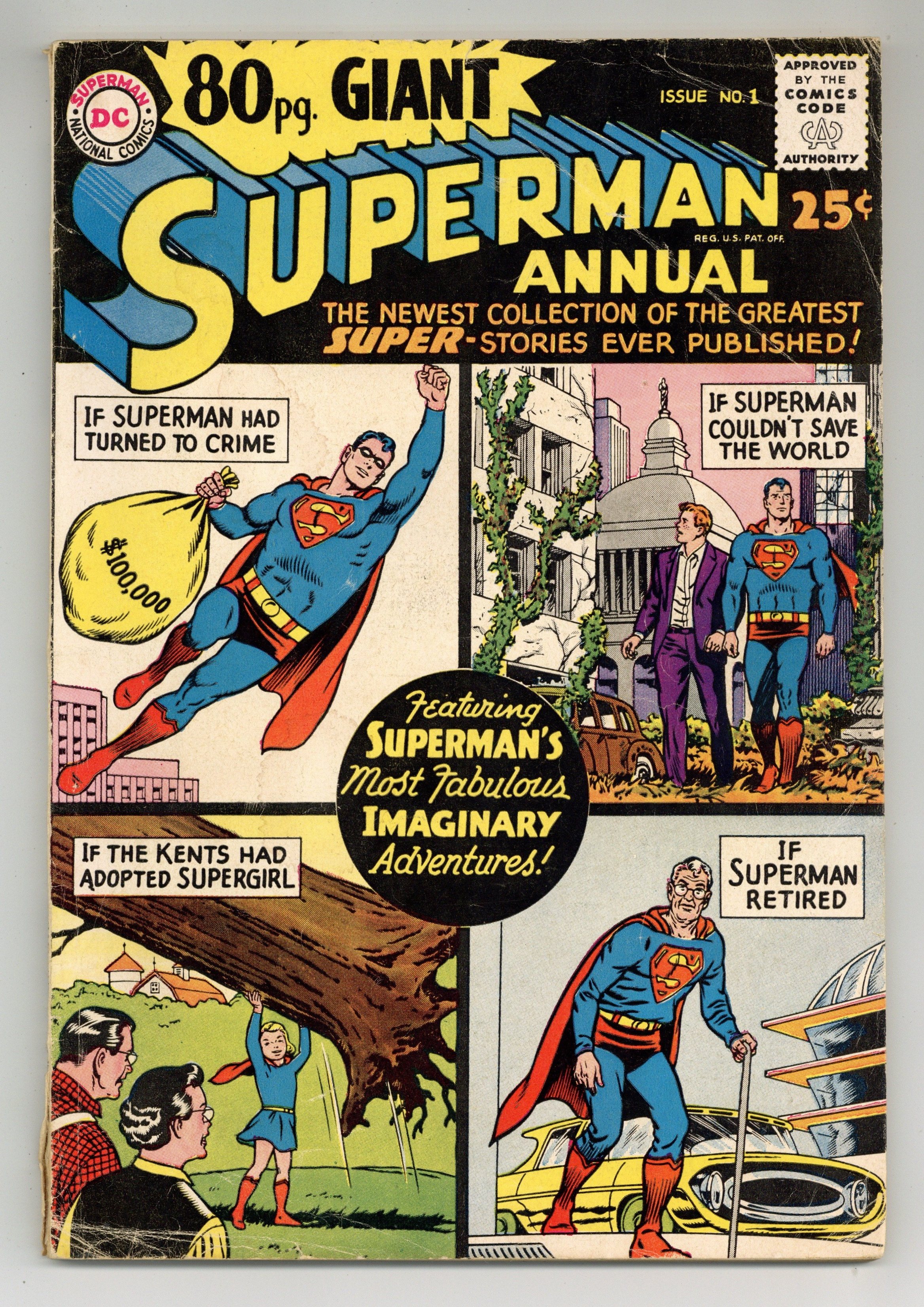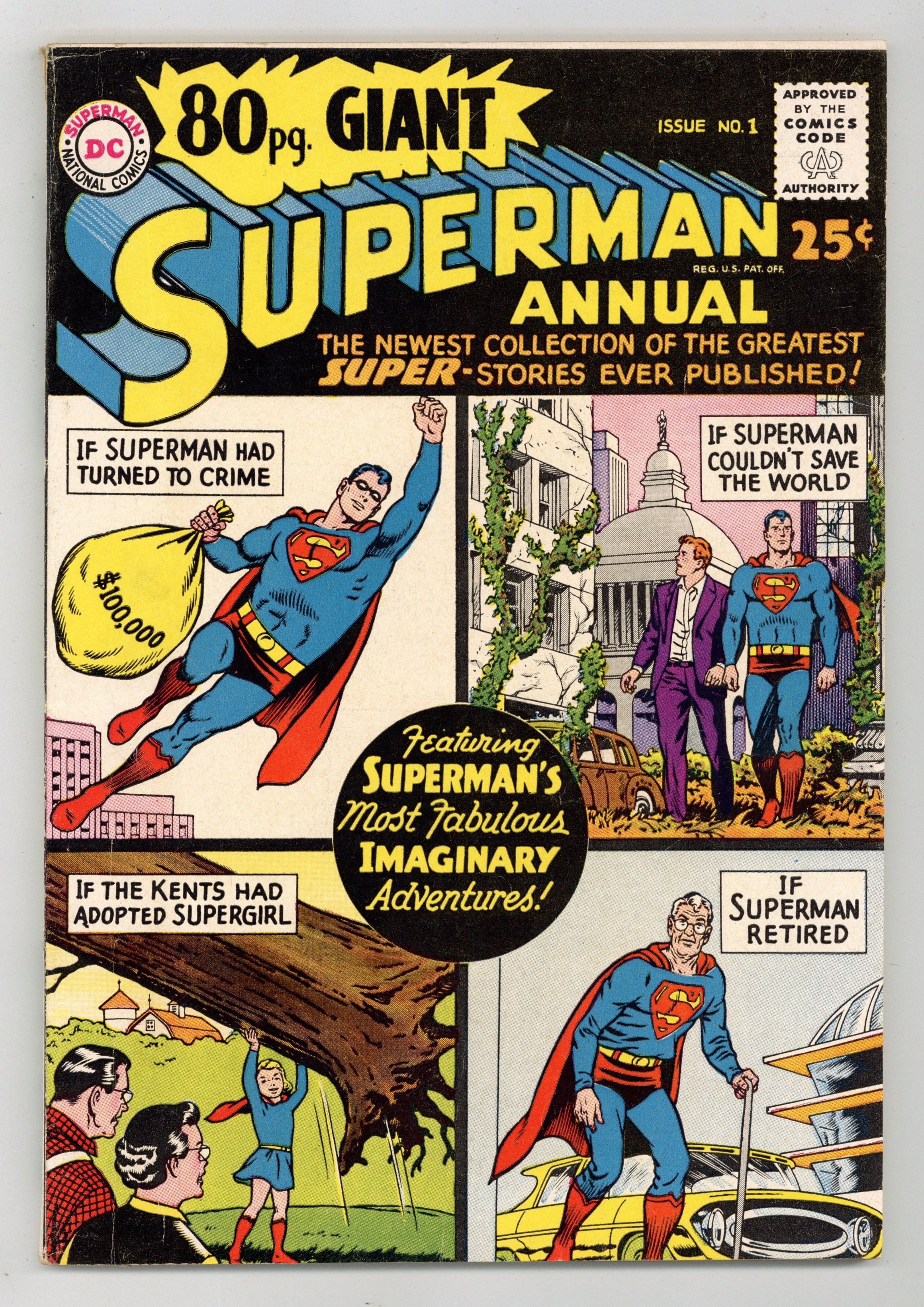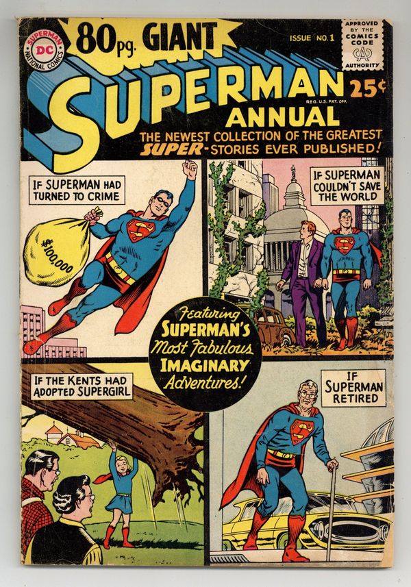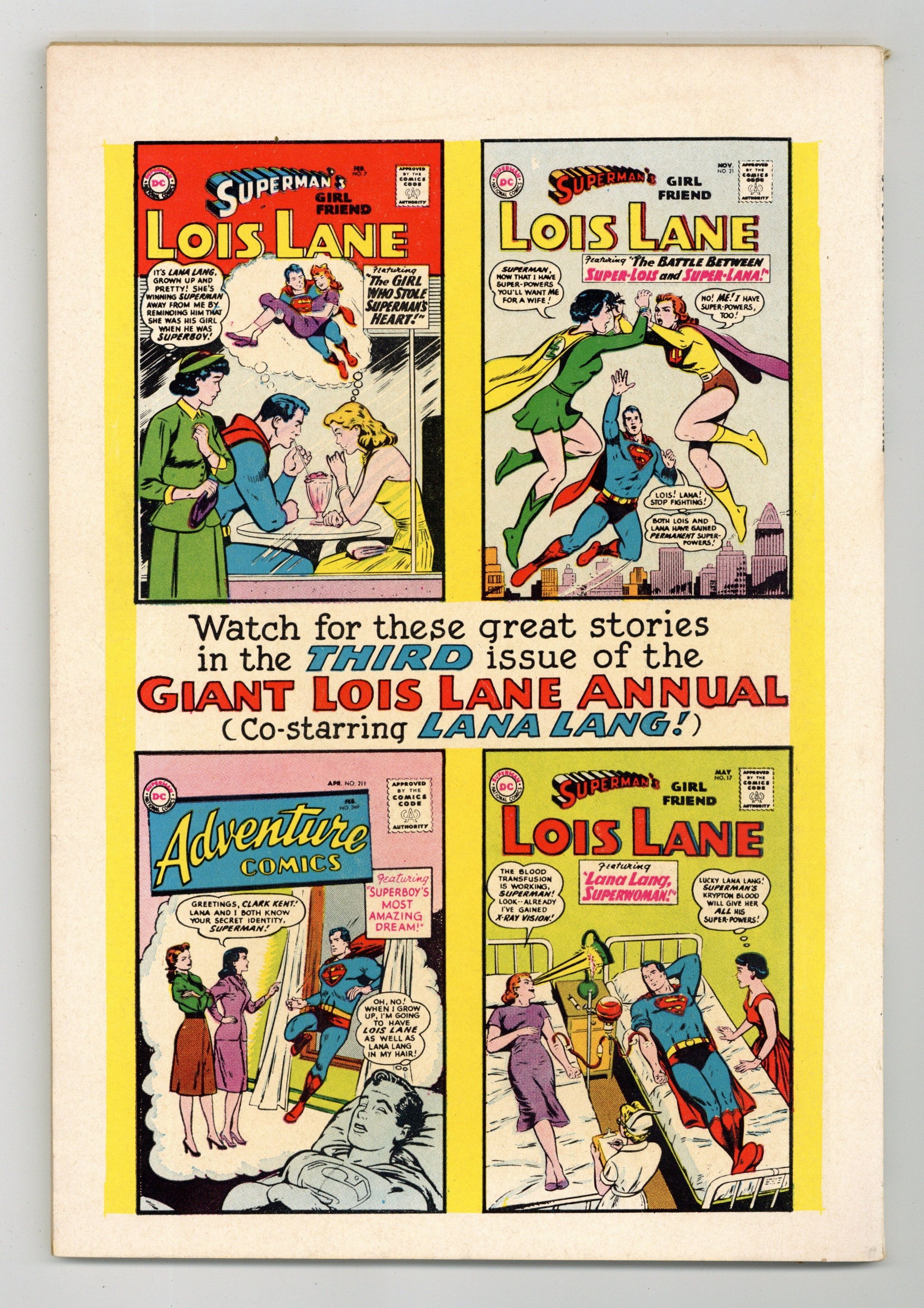 Superman Annual 80-Page Giant; imaginary adventures. All reprints. Cover pencils by Curt Swan, inks by George Klein. Giant Superman Annual ad. "The Revenge of Luthor!", script by Jerry Siegel, art by Al Plastino; Exposure to Red Kryptonite seemingly causes Superman and Superboy to exist simultaneously, Luthor takes advantage by trapping Superboy and forcing Superman to choose between Lois and Lana. "The Old Man of Metropolis!", script by Otto Binder, pencils by Curt Swan, inks by John Forte; Superman inadvertently smashes through the time barrier into the future--but emerges as an old man with no super powers. "Claire Kent, Alias Super-Sister!", script by Otto Binder, art by John Sikela; When Superboy saves a spacecraft from a crash landing, the pilot Shar-La, takes exception to his chauvinistic manner and transforms him into a girl. "The Superman Book That Couldn't Be Finished," script by Otto Binder, pencils by Curt Swan, inks by Ray Burnley; Jimmy is having difficulties finishing his first novel; Superman helps his pal by taking him into the future and bringing back a copy of the finished book. "Ma and Pa Kent Adopt Supergirl!", script by Jerry Siegel, art by Jim Mooney; In a story from before she became the Danvers' daughter, Linda dreams of being adopted by the Kents. "Chapter I: The Super-Brat from Krypton," script by Jerry Siegel, pencils by Curt Swan, inks by John Forte; A freak accident creates a duplicate of Kal-El's rocket including a double of its tiny passenger; On Earth, Kal's doppelganger is adopted by a crooked couple, the Dereks, and becomes Super-Brat. "Chapter 2 The Young Super-Bully," script by Jerry Siegel, pencils by Curt Swan, inks by John Forte; Now a teenager, Super-Bully tries to steal Clark's life but doesn't bargain for Krypto's super-sense of smell as the Dog of Steel is not fooled. "Chapter III Superman vs. Super-Menace!", script by Jerry Siegel, pencils by Curt Swan, inks by John Forte; Now grown to manhood and significantly, immune to Kryptonite, Super-Menace battles the Man of Steel, however on the verge of victory he learns the truth about himself and the evil Dereks. "The Superman Legend" article. Giant Lois Lane Annual #3 ad. 84 pgs., full color. Cover price $0.25.