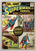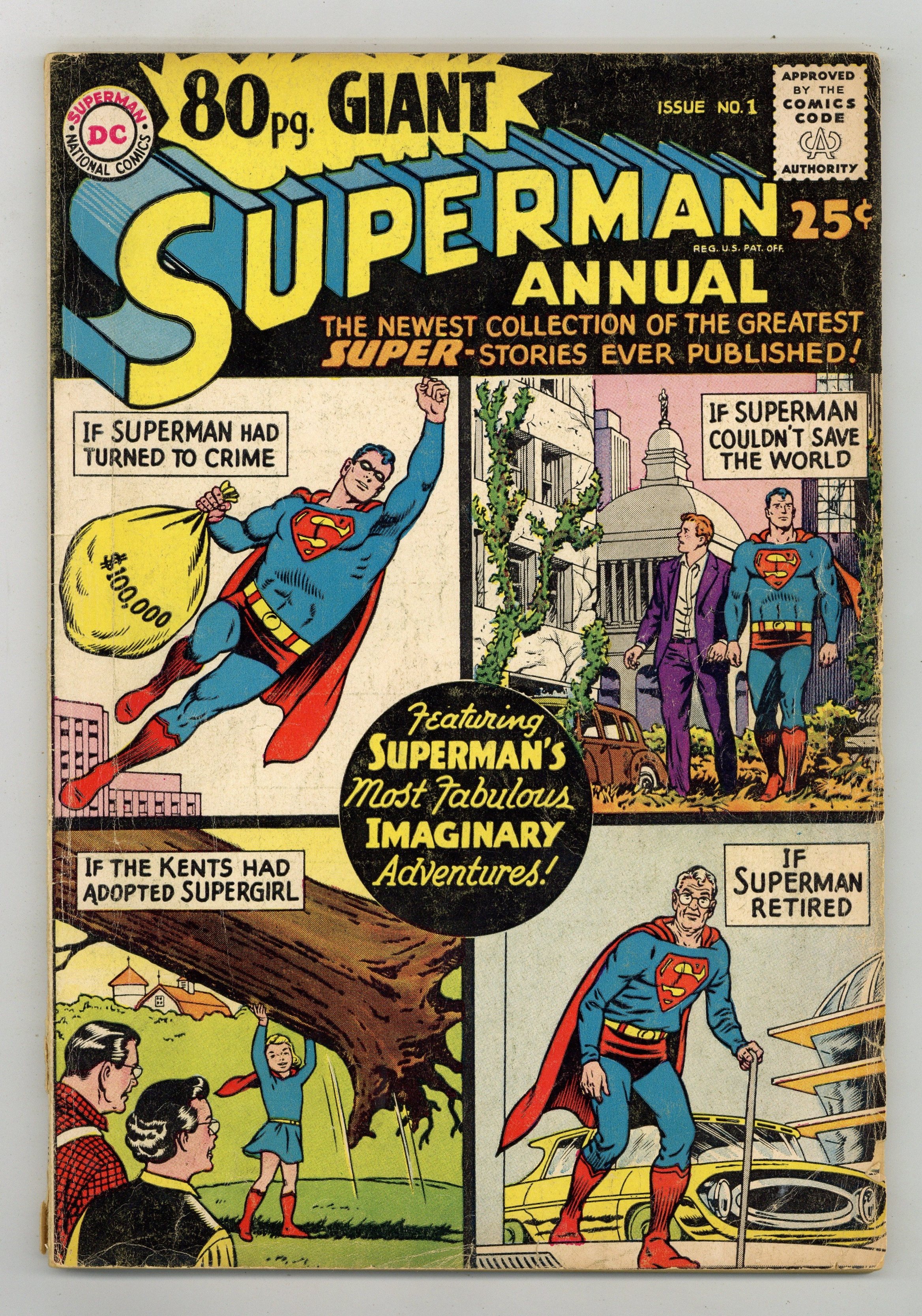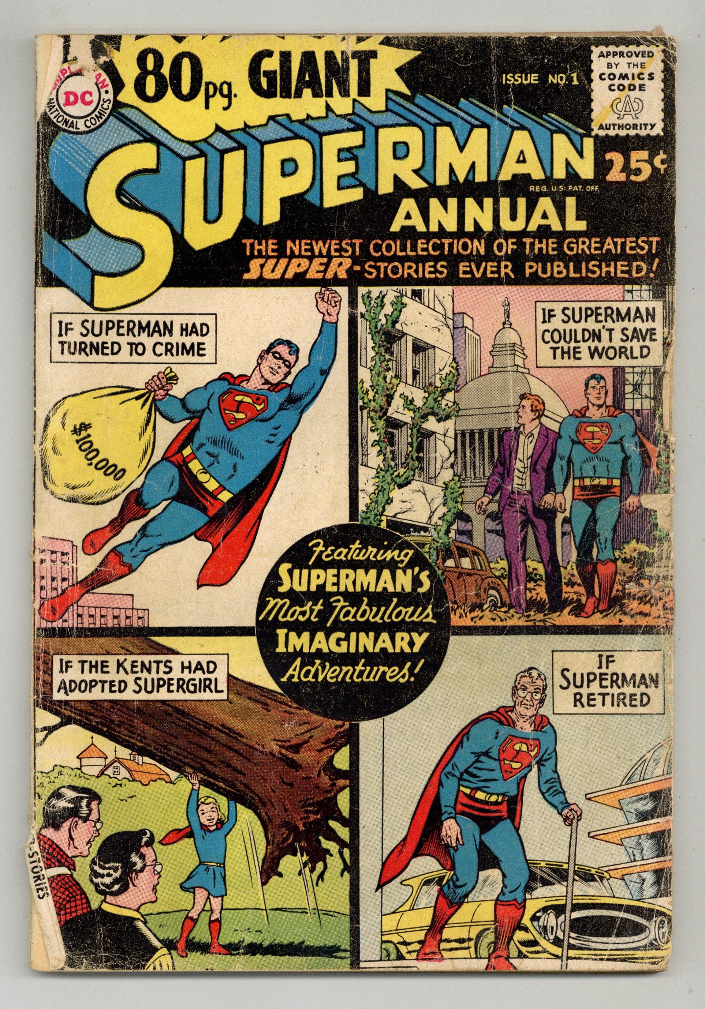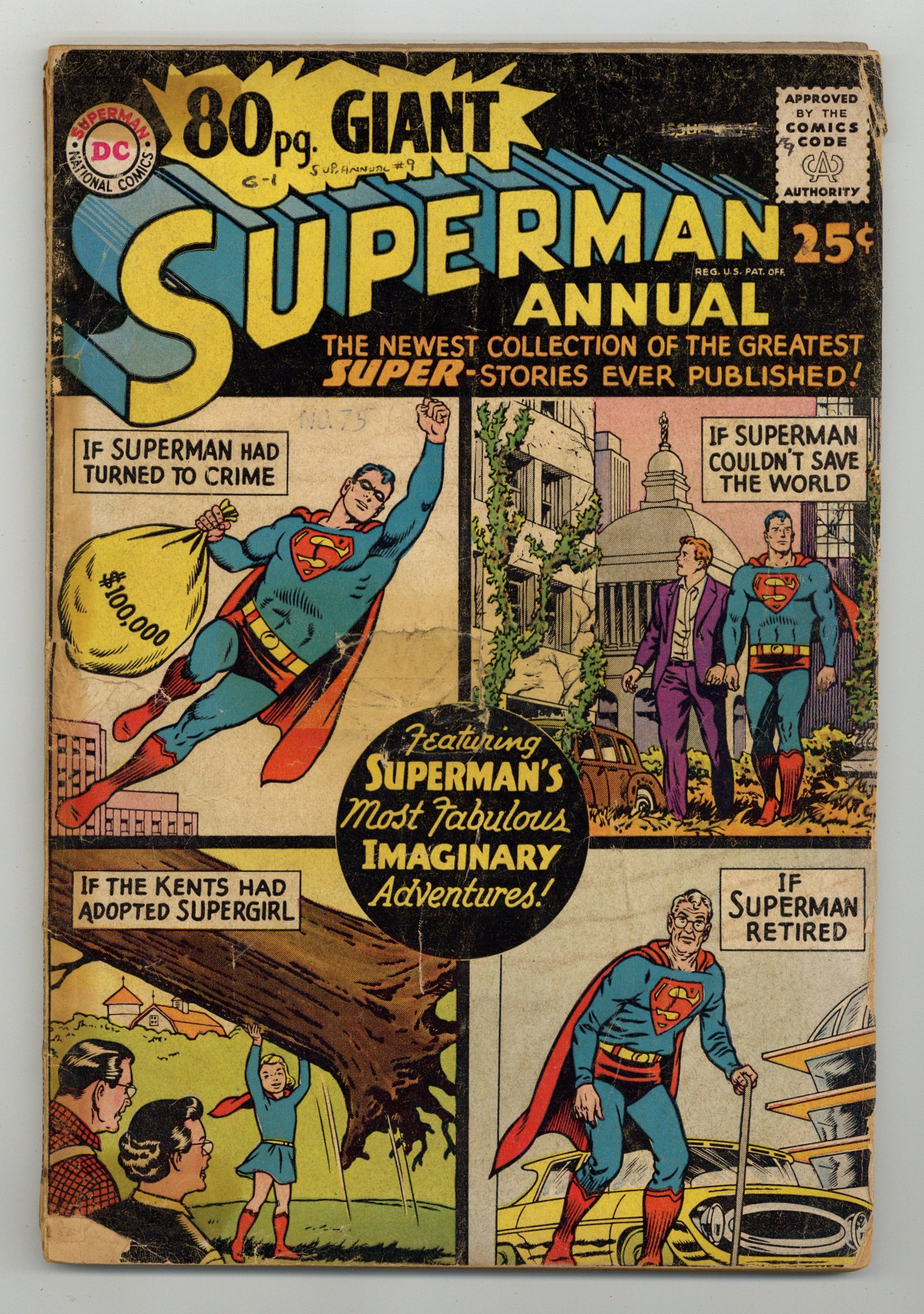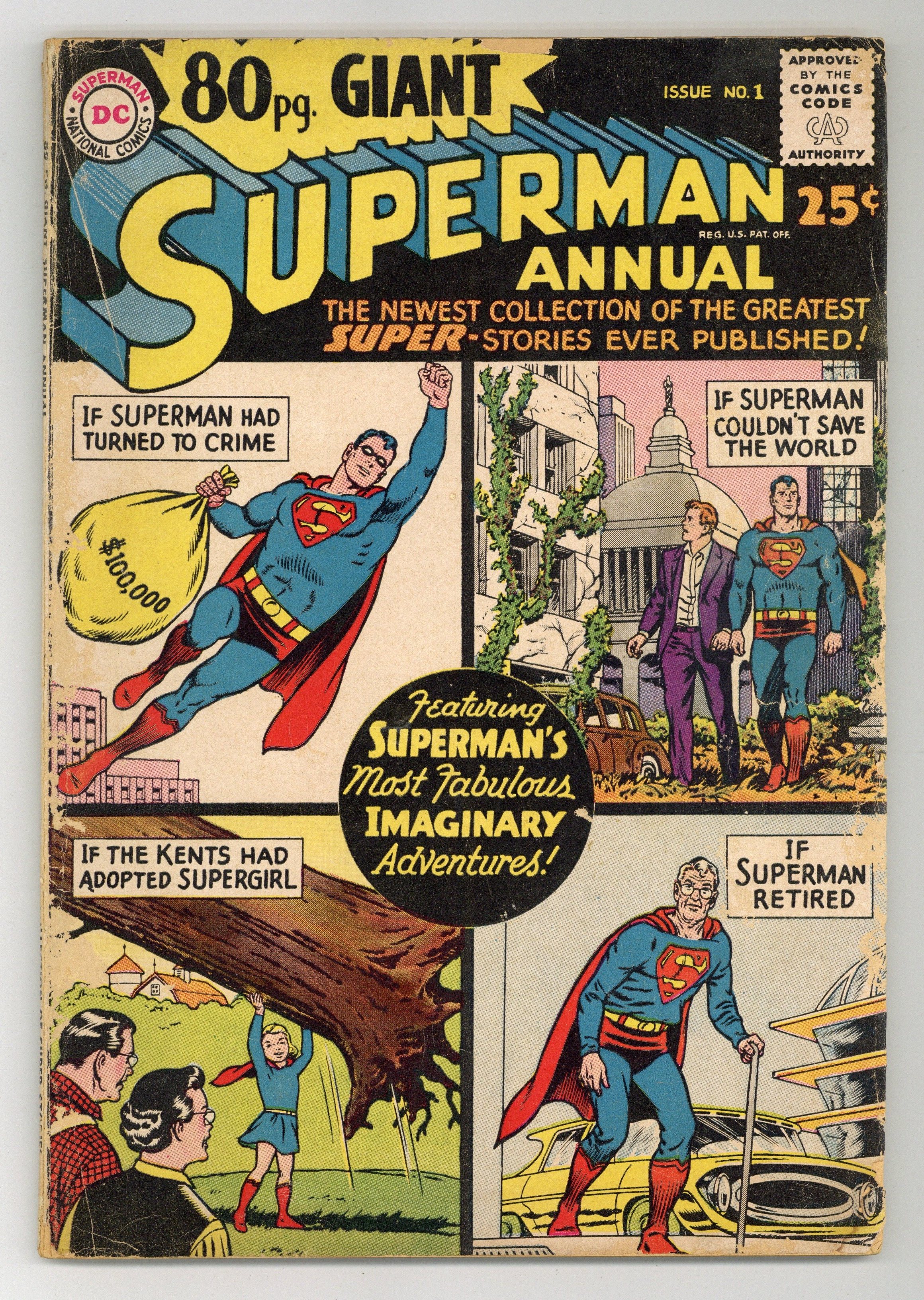Superman Annual 80-Page Giant; imaginary adventures. All reprints. Cover pencils by Curt Swan, inks by George Klein. Giant Superman Annual ad. "The Revenge of Luthor!", script by Jerry Siegel, art by Al Plastino; Exposure to Red Kryptonite seemingly causes Superman and Superboy to exist simultaneously, Luthor takes advantage by trapping Superboy and forcing Superman to choose between Lois and Lana. "The Old Man of Metropolis!", script by Otto Binder, pencils by Curt Swan, inks by John Forte; Superman inadvertently smashes through the time barrier into the future--but emerges as an old man with no super powers. "Claire Kent, Alias Super-Sister!", script by Otto Binder, art by John Sikela; When Superboy saves a spacecraft from a crash landing, the pilot Shar-La, takes exception to his chauvinistic manner and transforms him into a girl. "The Superman Book That Couldn't Be Finished," script by Otto Binder, pencils by Curt Swan, inks by Ray Burnley; Jimmy is having difficulties finishing his first novel; Superman helps his pal by taking him into the future and bringing back a copy of the finished book. "Ma and Pa Kent Adopt Supergirl!", script by Jerry Siegel, art by Jim Mooney; In a story from before she became the Danvers' daughter, Linda dreams of being adopted by the Kents. "Chapter I: The Super-Brat from Krypton," script by Jerry Siegel, pencils by Curt Swan, inks by John Forte; A freak accident creates a duplicate of Kal-El's rocket including a double of its tiny passenger; On Earth, Kal's doppelganger is adopted by a crooked couple, the Dereks, and becomes Super-Brat. "Chapter 2 The Young Super-Bully," script by Jerry Siegel, pencils by Curt Swan, inks by John Forte; Now a teenager, Super-Bully tries to steal Clark's life but doesn't bargain for Krypto's super-sense of smell as the Dog of Steel is not fooled. "Chapter III Superman vs. Super-Menace!", script by Jerry Siegel, pencils by Curt Swan, inks by John Forte; Now grown to manhood and significantly, immune to Kryptonite, Super-Menace battles the Man of Steel, however on the verge of victory he learns the truth about himself and the evil Dereks. "The Superman Legend" article. Giant Lois Lane Annual #3 ad. 84 pgs., full color. Cover price $0.25.