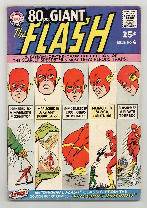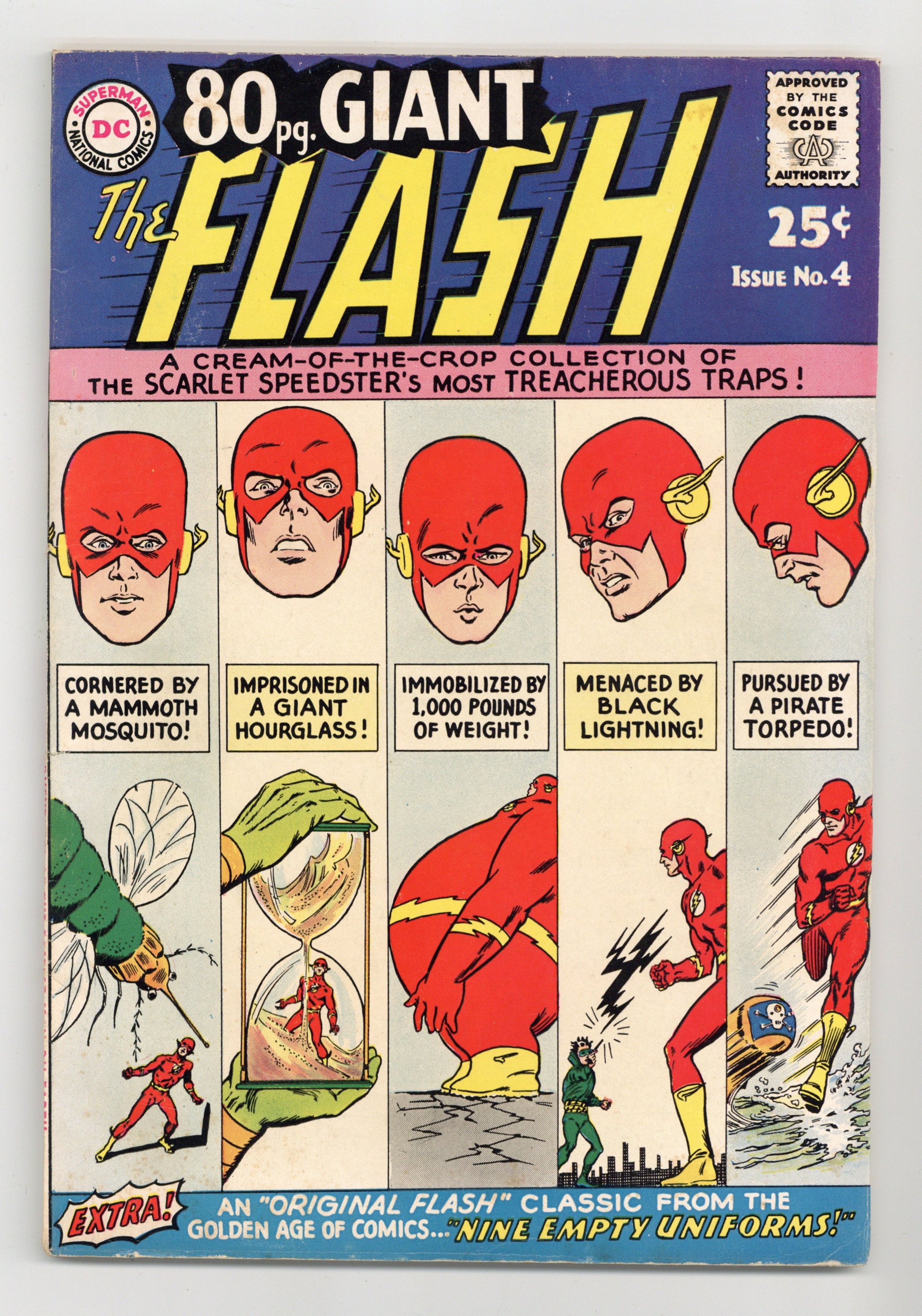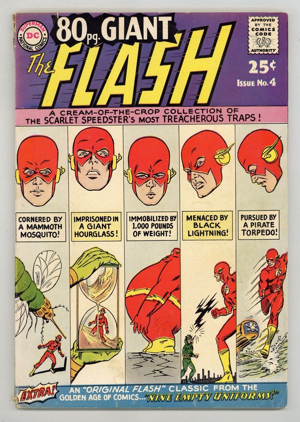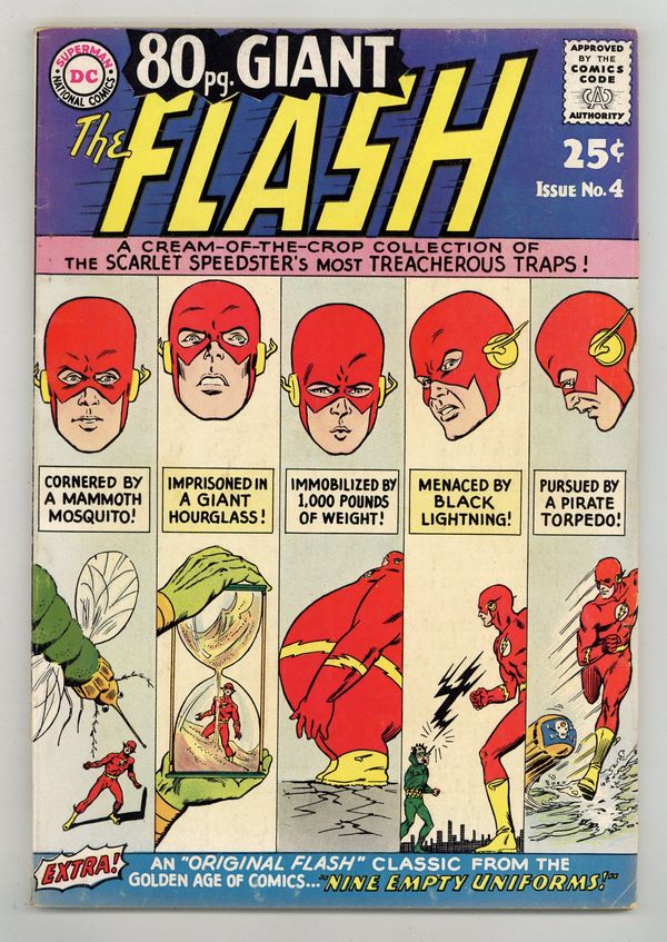 Flash reprints. Cover pencils by Carmine Infantino, inks by Murphy Anderson. "Around the World in 80 Minutes!", script by Robert Kanigher, pencils by Carmine Infantino, inks by Joe Giella; Police scientist Barry Allen invents a radio watch which picks up S.O.S. calls from many different countries, in order for him to avert these catastrophes, he must literally race around the world in eighty minutes. Ad for Green Lantern and Justice League of America. "Giants of the Time-World!", script by Robert Kanigher, pencils by Carmine Infantino, inks by Frank Giacoia; When Iris West disappears while on an assignment, The Flash follows her into another dimension. "The Master of Mirrors," script by John Broome, pencils by Carmine Infantino, inks by Joe Giella; Scudder, a small time criminal, discovers he can solidify images from his trick mirrors, he then uses this knowledge to commit crimes as The Mirror Master. "Nine Empty Uniforms!", script by Robert Kanigher, pencils by Carmine Infantino, inks by Frank Giacoia; Jay Garrick and The Flash help aging baseball team, The Bobtails, regain their confidence. Flash's Rogues' Gallery illustration, pencils by Carmine Infantino, inks by Murphy Anderson. "The Challenge of the Weather Wizard!", script by John Broome, pencils by Carmine Infantino, inks by Murphy Anderson; Escaped criminal Mark Mardon reaches his brother Clyde's house to lie low, however, on entering finds his brother dead. Detective Comics/Batman ad. "The Day Flash Weighed 1000 Pounds!", script by John Broome, pencils by Carmine Infantino, inks by Joe Giella; Grodd, the Super-Gorilla has seemingly died in Gorilla City, in reality he has found a way to take over the mind of a human being (William Dawson); As Dawson, he invents a gun which causes The Flash to absorb vast amounts of moisture from the air, bulking him up to 1000 pounds in weight. The Flash ad. Pinup of Barry ("Flash") Allen, Jay ("Flash") Garrick, and Wally ("Kid Flash") West, pencils by Carmine Infantino, inks by Murphy Anderson. 84 pgs., full color. Cover price $0.25.