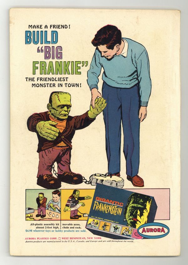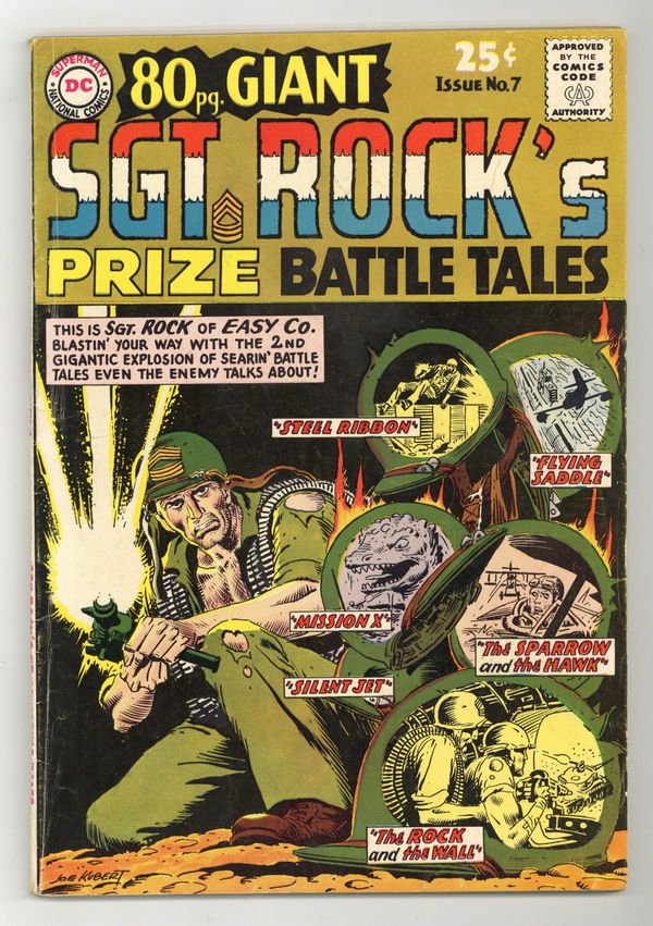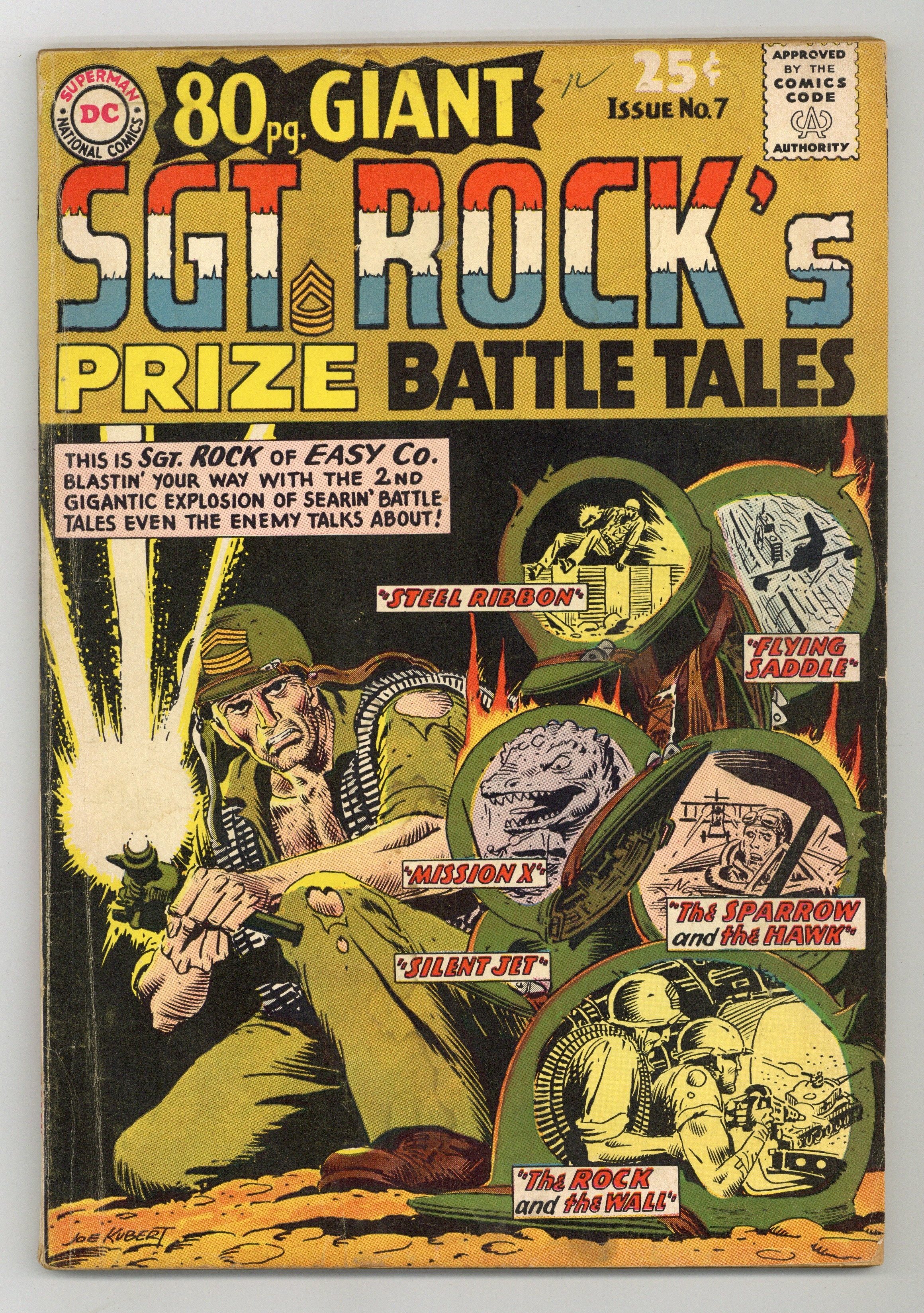 Sgt. Rock's Prize Battle Tales. All reprints. Cover art by Joe Kubert. "The Rock and the Wall!", script by Robert Kanigher, art by Joe Kubert; Joe Wall, the "Wall" of Easy learns that walls may fall but Rocks do not. Ad for Showcase comic with G. I. Joe. "Flying Saddle," art by Irv Novick; Cowboy Bob Rivers can ride any horse, but on enlisting, he flies planes as if they were bucking broncos. Pin-up depicting six mock-up covers of G.I. Combat, Our Fighting Forces, All American Men of War, P.T. Boat Skipper Capt. Storm, Star Spangled War Stories, and Our Army at War, art by Joe Kubert. "The Steel Ribbon!", script by Robert Kanigher, art by Joe Kubert; Medal bands are made of silk, but the men they are awarded to are made of steel. Star Spangled War Stories/G.I. Combat ad. "The Sparrow and the Hawk!", script by Robert Kanigher, art by Russ Heath; The American Sparrow battles the German Hawk for supremacy in the air over France in W.W.1. 80 Page Giant Magazine Batman ad. "Mission X!", script by Robert Kanigher, pencils by Ross Andru, inks by Mike Esposito; Marty and The Professor land on a mysterious island populated by giant animals, as the island finally sinks beneath the waves they make their escape in an oversized turtle egg shell. 80 Page Giant Magazine Superman ad. "The Silent Jet," script by Robert Kanigher, art by Joe Kubert; Although planes make many noises, when Nick Brady comes down in the desert he fights enemy horsemen in silence. Our Army at War ad. Gigantic Frankenstein Aurora model kit ad. 84 pgs., full color. Cover price $0.25.