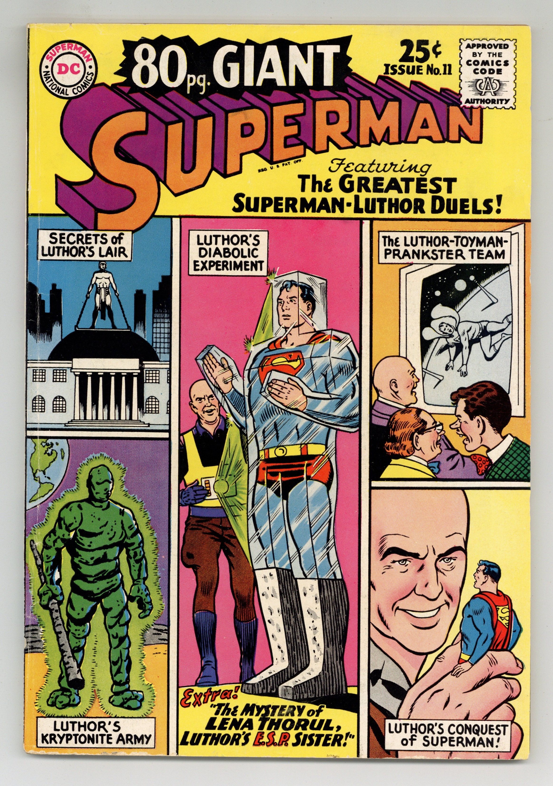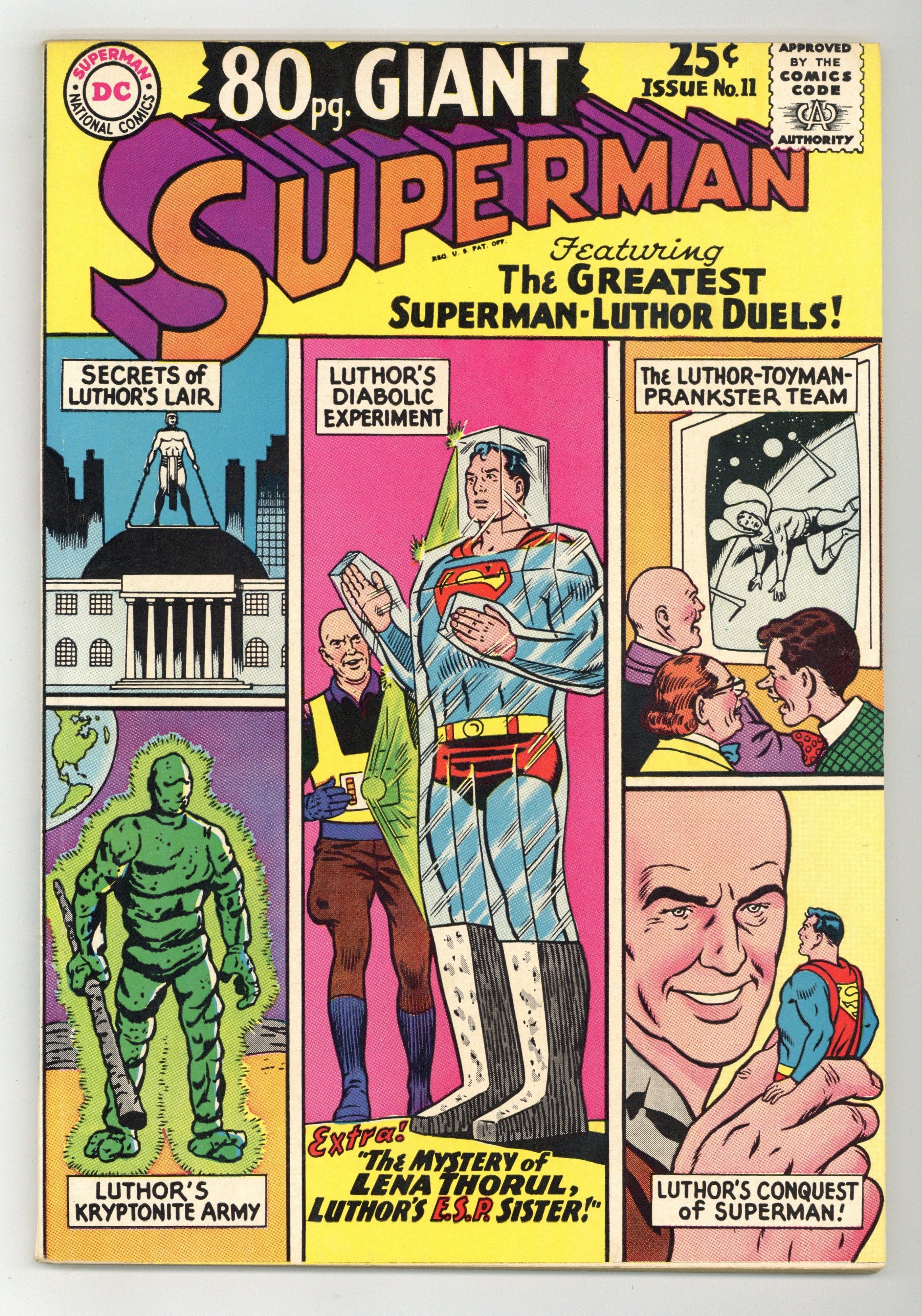 Superman 80 pg. Giant featuring the Greatest Superman-Luthor Duels! All reprints. Cover pencils by Curt Swan, inks by George Klein. "The Kryptonite Man!", script by Otto Binder, art by Al Plastino; Luthor takes a liquid kryptonite serum which makes it impossible for Superman to get near him; Superman makes a lead suit to protect himself, but Luthor has discovered a way to turn lead into glass. "The Story Behind This Cover" illustration, pencils by Curt Swan, inks by George Klein; Swan's unused cover for Superman 175. G. I. Joe toy ad. "The Impossible Mission!", script by Jerry Siegel, art by George Papp; The Boy of Steel traverses the time barrier and attempts to thwart the assassination of Abraham Lincoln, but he encounters an adult Lex Luthor. Cheerios ad featuring Rocky and Bullwinkle. "The Terrible Trio!", script by Bill Woolfolk, pencils by Wayne Boring, inks by Stan Kaye; When the terrible trio team up to combat Superman, the Man of Steel is guaranteed triple-trouble. "Superman's Super Vision" character profile. The Superman Family illustration, pencils by Curt Swan and John Forte (Legion of Super-Heroes figures only), inks by George Klein. "The Conquest of Superman!", script by Bill Finger, pencils by Curt Swan, inks by John Forte; Luthor seemingly defeats Superman using artificial kryptonite. "Key to Superman Family Portrait" article. "The Army of Living Kryptonite Men!", script by Jerry Siegel, art by George Papp; Luthor attacks with animated Kryptonite; Superboy is helped by Lana and Lightning Lad. "Superman in Superman Land," script by Bill Finger, pencils by Wayne Boring, inks by Stan Kaye; Clark, Lois, and Jimmy visit the theme park "Superman Land"; Amid the entertainments, however, lurks danger in the guise of Lex Luthor. Batman 80 Page Giant Magazine ad. "The Curse of Lena Thorul!", script by Jerry Siegel, art by Kurt Schaffenberger; In the New England town of Cardiff, Lois meets a girl who seems to be a modern-day witch. Glossary of Kryptonian Names, pencils by Curt Swan, inks by George Klein. 84 pgs., full color. Cover price $0.25.