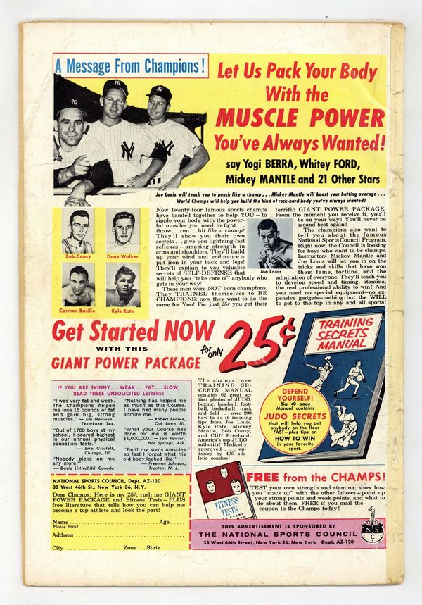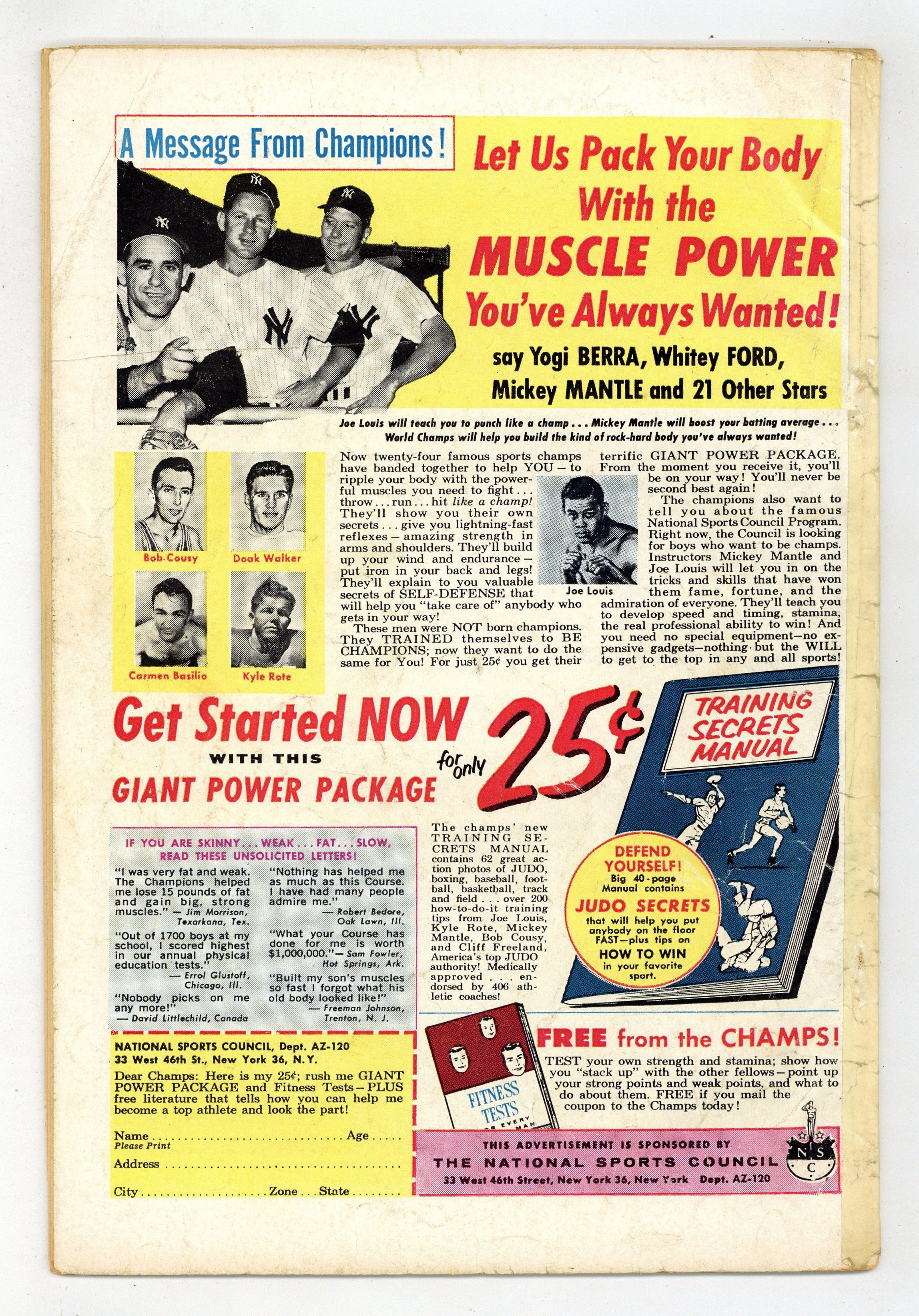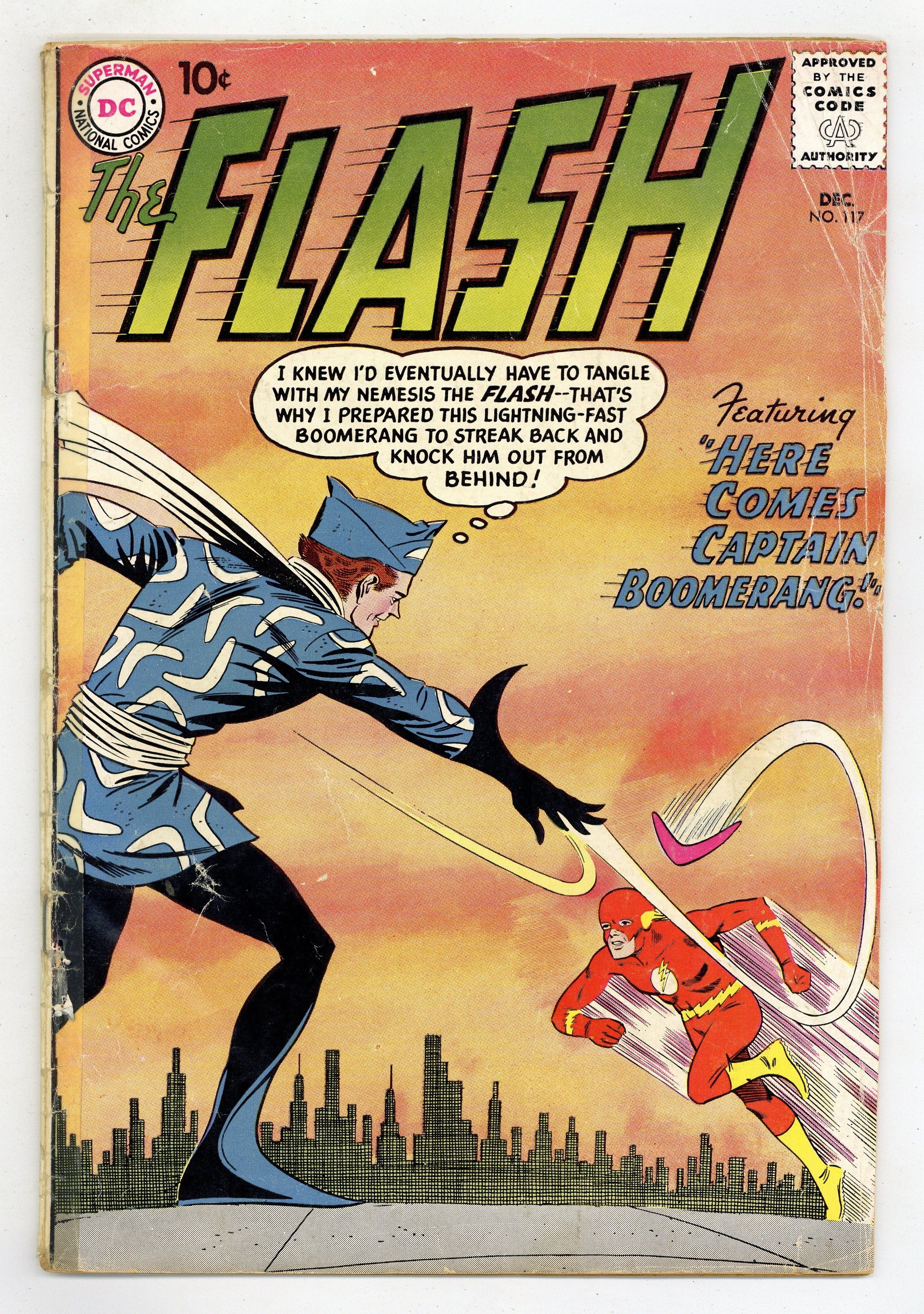 Cover pencils by Carmine Infantino, inks by Joe Giella. First appearance of Captain Boomerang in Here Comes Captain Boomerang!, script by John Broome, pencils by Carmine Infantino, inks by Murphy Anderson; W.W. Wiggins, the head of a game company, hires Digger Harkness to be his boomerang expert; Harkness becomes Captain Boomerang, commits crimes, and battles Flash. The Madcap Inventors of Central City!, script by Gardner Fox, pencils by Carmine Infantino, inks by Joe Giella; Winky, Blinky, and Noddy build a machine and start an inventing business. Letter to the editor from Fox himself! Ad for Giant Superman Annual. Comparative Speed Records fact page. Training Secrets Manual ad featuring Bob Cousy, Doak Walker, Carmen Basilio, and Kyle Rote. 36 Pages, Full Color. Cover price $0.10.
