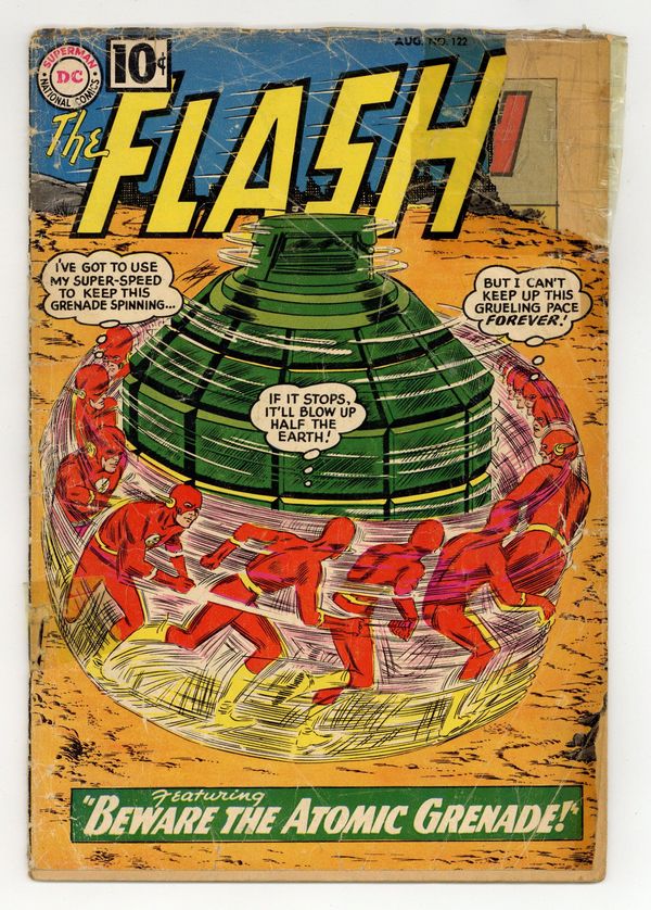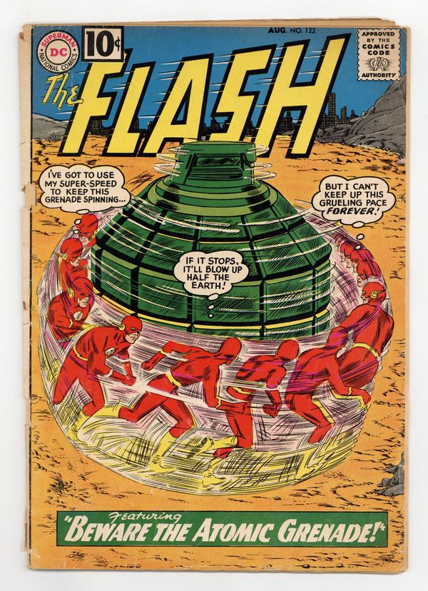 Cover pencils by Carmine Infantino, inks by Murphy Anderson. First appearance of Roscoe "The Top" Dillon in Beware the Atomic Grenade!, script by John Broome, pencils by Carmine Infantino, inks by Joe Giella; Fashion designer Anton Previn gives Iris a make-over while Flash battles a new villain, The Top. Ad for Giant Superman Annual #3. Ad for Special Giant Issue of Secret Origins. Amazing Speeds fact page. Ad for Giant Batman Annual. Letter from super fan Paul Gambaccini. The Face Behind the Mask!, script by John Broome, pencils by Carmine Infantino, inks by Joe Giella; Silver Mask, a boy singer, is being blackmailed by Harry who knows that he used to be part of a gang. 36 Pages, Full Color. Cover price $0.10.