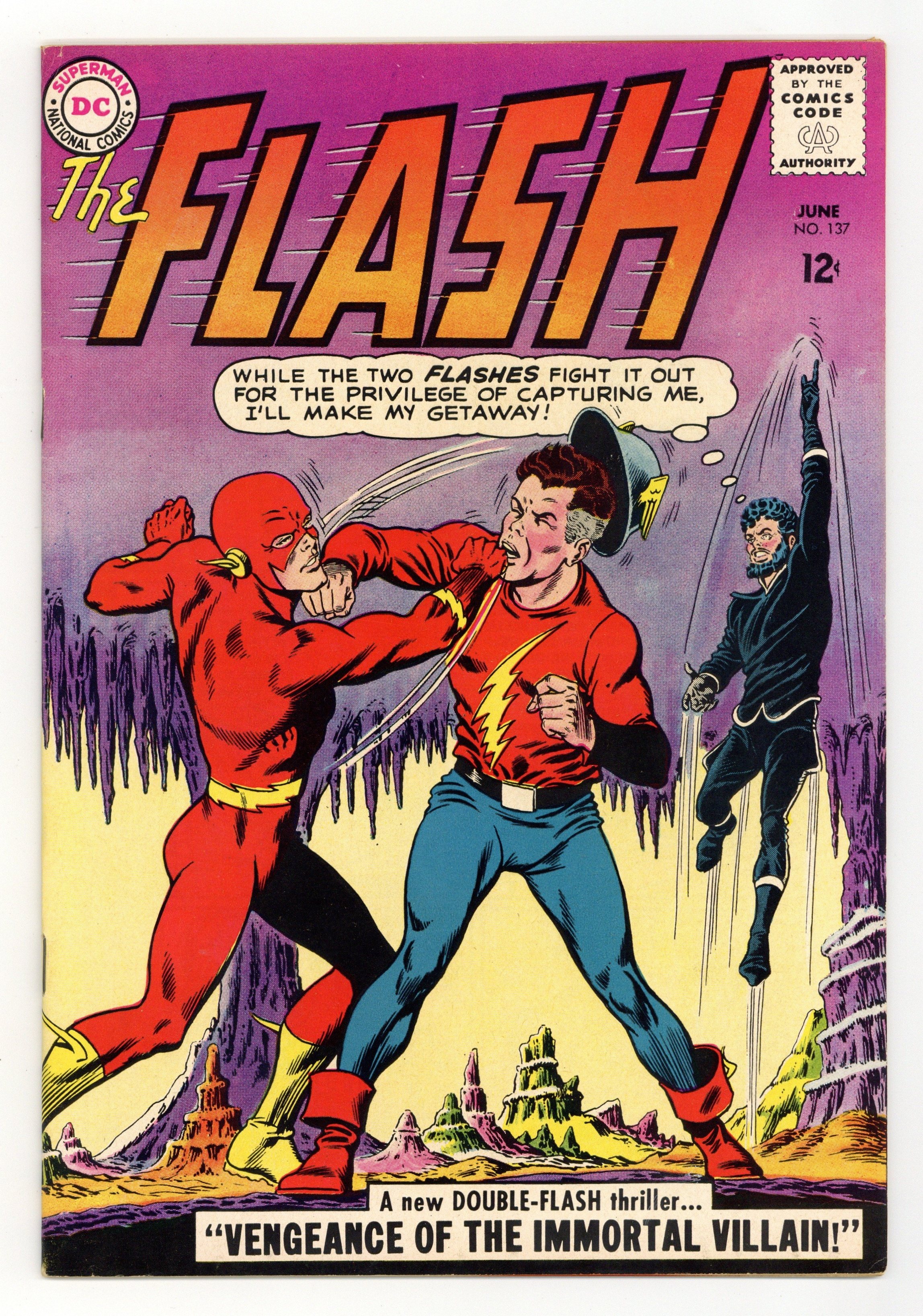 Cover pencils by Carmine Infantino, inks by Murphy Anderson. Not Wanted: High School Dropouts! public service announcement, script by Jack Schiff, art by Sheldon Moldoff. Golden Age Flash (Earth-2) crossover and Justice Society of America cameo in Vengeance of the Immortal Villain!, script by Gardner Fox, pencils by Carmine Infantino, inks by Joe Giella; Vandal Savage tries to exact vengeance on the retired Justice Society; Barry goes to Earth-2 to help Jay free the other JSA members. What's The Difference Between fact page. Amazing Speeds! filler page written by Julius Schwartz. Letters to the editor from fan writer Larry Herndon, letter hack Paul Gambaccini, and comic writer E. Nelson Bridwell. 36 Pages, Full Color. Cover price $0.12.
