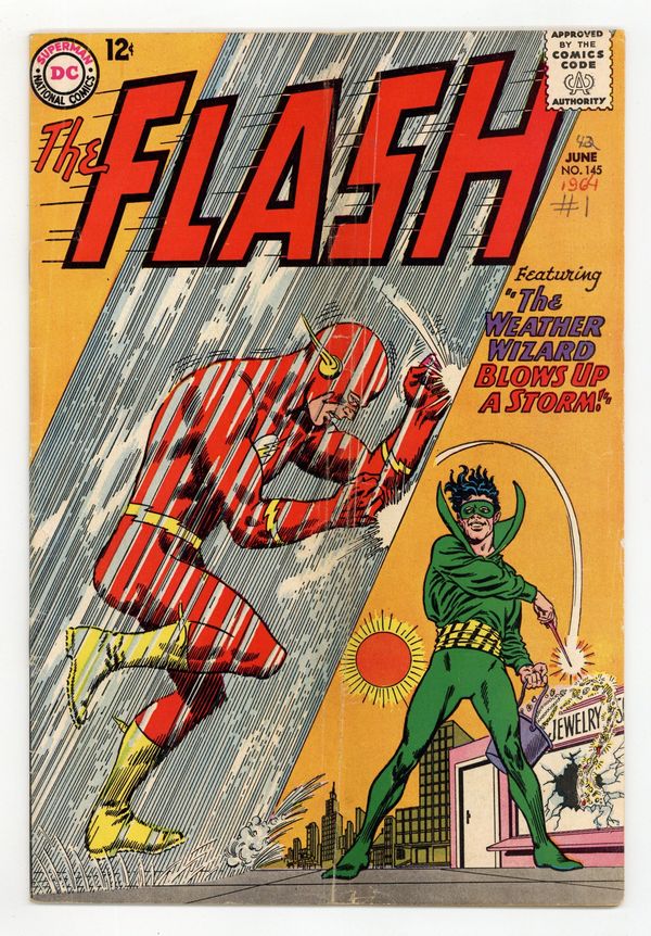 Tags: Flash$18.00Cover pencils by Carmine Infantino, inks by Murphy Anderson. The Weather Wizard Blows Up A Storm!, script by Gardner Fox, pencils by Carmine Infantino, inks by Joe Giella; A student's science fair project can predict the moves of the Weather Wizard and gives Flash an assist in stopping his latest crime spree. Girl From the Super-Fast Dimension!, script by Gardner Fox, pencils by Carmine Infantino, inks by Joe Giella; Doralla Kon has travelled to Earth from the planet Alkomar; She has super-speed on Earth but she also emits a radiation that causes explosions. Ad for new look Batman. Giant Superboy Annual ad. Flash subscription ad. Showcase Presents I-Spy ad. Amazing Speeds! fact page. 36 Pages, Full Color. Cover price $0.12.