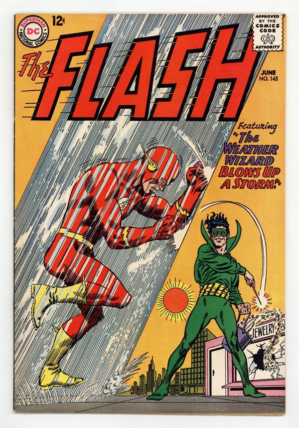 Cover pencils by Carmine Infantino, inks by Murphy Anderson. The Weather Wizard Blows Up A Storm!, script by Gardner Fox, pencils by Carmine Infantino, inks by Joe Giella; A student's science fair project can predict the moves of the Weather Wizard and gives Flash an assist in stopping his latest crime spree. Girl From the Super-Fast Dimension!, script by Gardner Fox, pencils by Carmine Infantino, inks by Joe Giella; Doralla Kon has travelled to Earth from the planet Alkomar; She has super-speed on Earth but she also emits a radiation that causes explosions. Ad for new look Batman. Giant Superboy Annual ad. Flash subscription ad. Showcase Presents I-Spy ad. Amazing Speeds! fact page. 36 Pages, Full Color. Cover price $0.12.