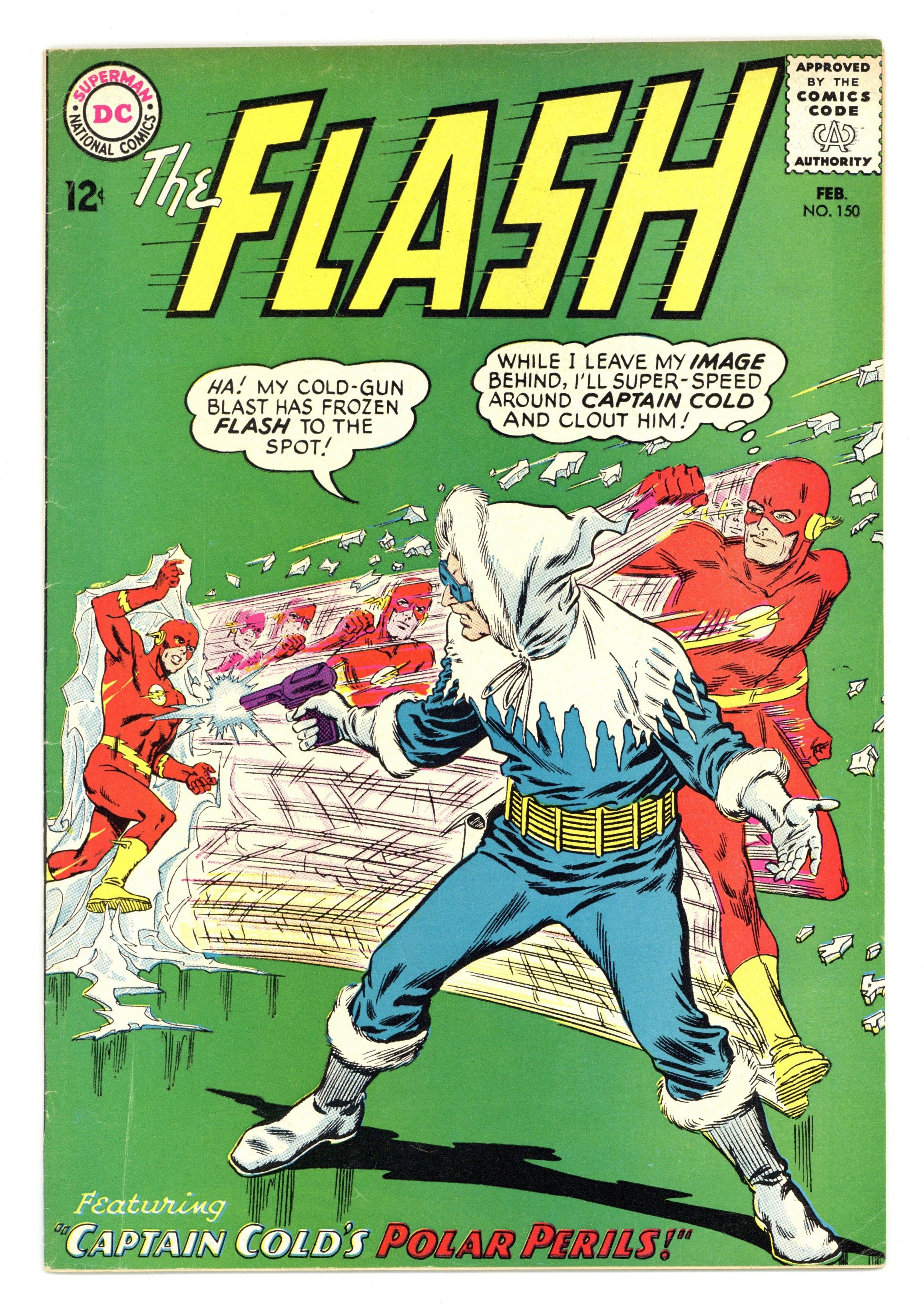 Cover pencils by Carmine Infantino, inks by Murphy Anderson. Captain Cold's Polar Perils, script by Gardner Fox, pencils by Carmine Infantino, inks by Murphy Anderson; Flash battles a frost giant. Amazing Speeds fact page by Julius Schwartz, pencils by Morris Waldinger, inks by Tom Nicolosi. The Touch-and-Steal Bandits, script by Gardner Fox, pencils by Carmine Infantino, inks by Joe Giella; Flash tests the limits of his speed, unleashing an unforeseen menace. Letter from future Flash writer Cary Bates. Dont Give Fire a Place to Start public service announcement starring Superboy. Superman products ad. Ad for Giant Superman, Giant Batman, and Giant Sgt. Rocks Prize Battle Tales. Ad for Gigantic Frankenstein assembly kit from Aurora. 36 Pages, Full Color. Cover price $0.12.