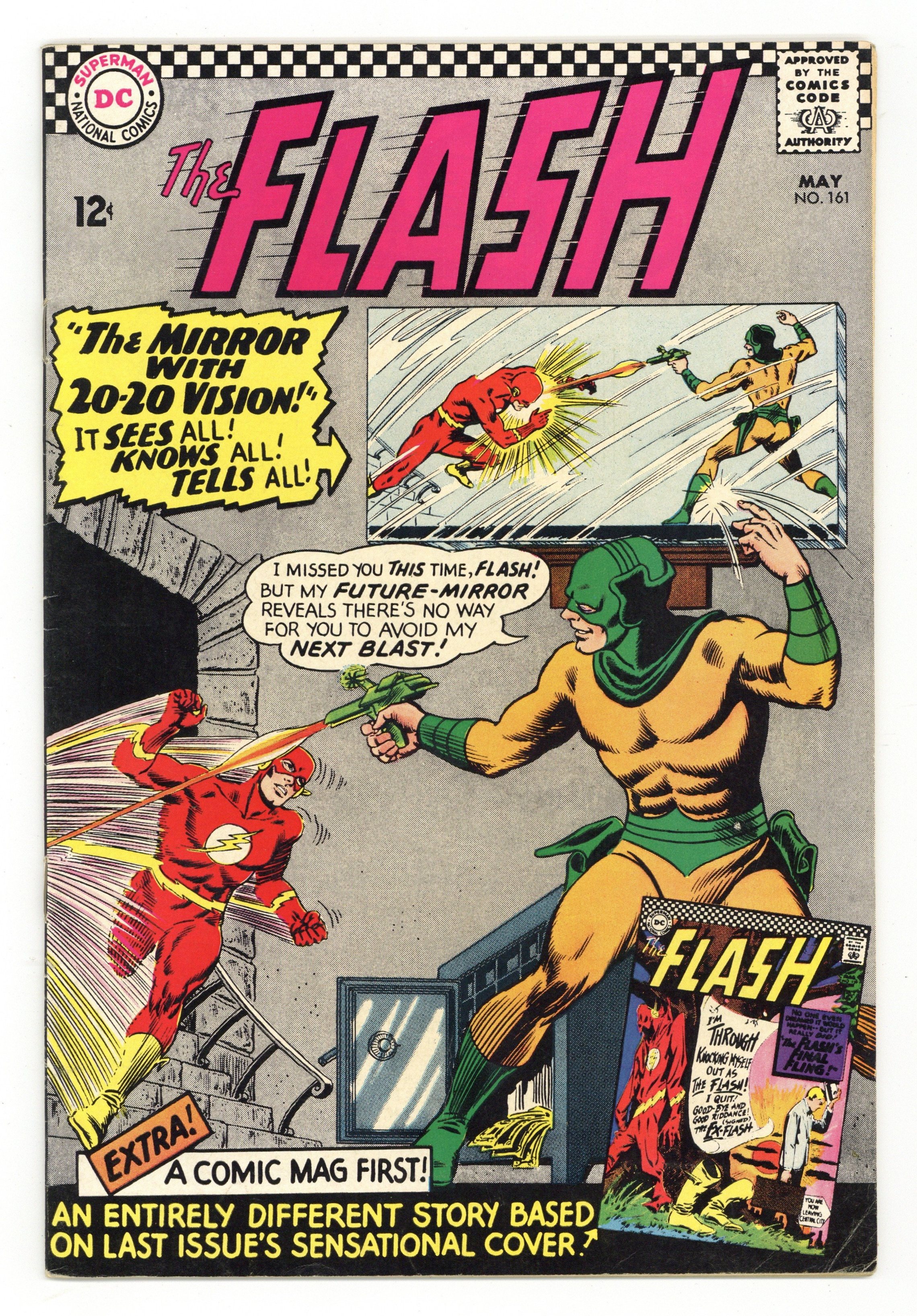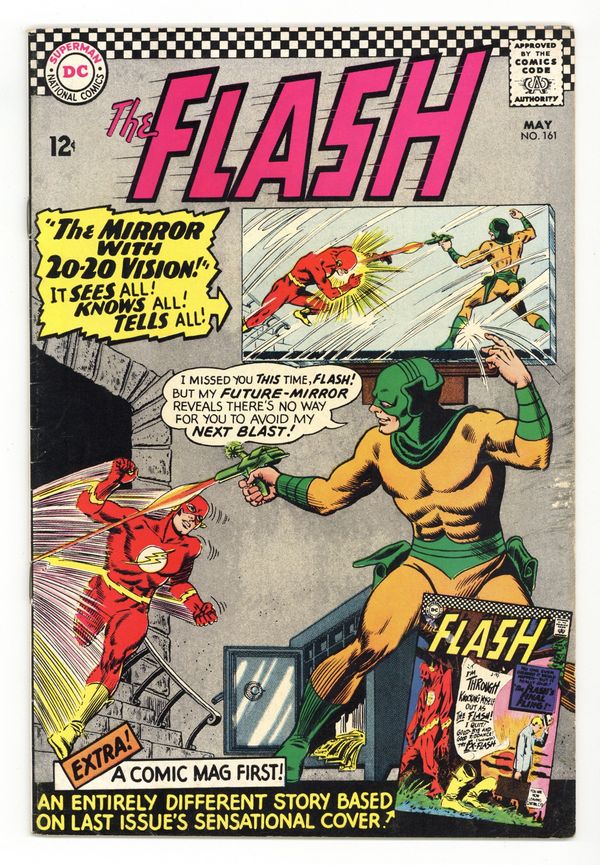 Cover pencils by Carmine Infantino, inks by Murphy Anderson. Case of the Curious Costume, script by Robert Kanigher, pencils by Carmine Infantino, inks by Joe Giella; based on the cover of issue 159 (in which Barry quit being The Flash), but it's written by Robert Kanigher instead of John Broome (who scripted 159); this was just one of Julius Schwartz's many cool ideas as longtime editor at DC. Mirror with the 20-20 Vision, script by Gardner Fox, pencils by Carmine Infantino, inks by Joe Giella; Mirror Master invents a mirror that allows him to see 20 seconds into the future. Superman TV show ad. Caps Hobby Hints strip by Henry Boltinoff. 80 pg. Giant Superboy ad. Full page Cheerios ad with Rocky and Bullwinkle. Ad for Brave and the Bold and Batman. G.I. Joe Club ad. Back cover ad for Aurora Batman, Superboy, Superman, and Wonder Woman model kits. 36 Pages, Full Color. Cover price $0.12.