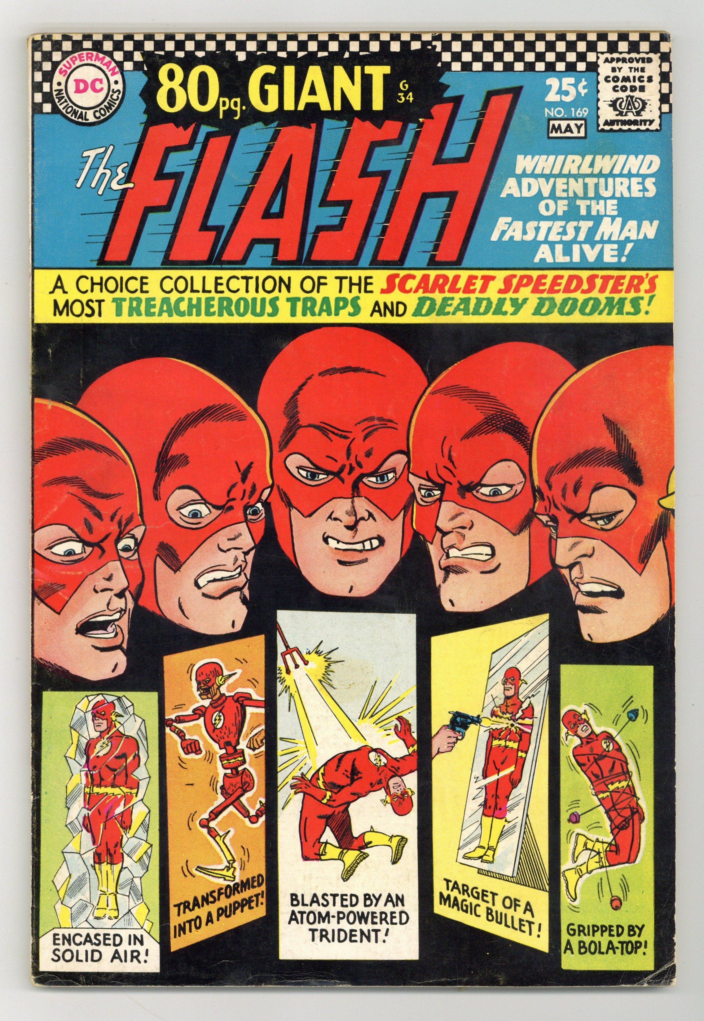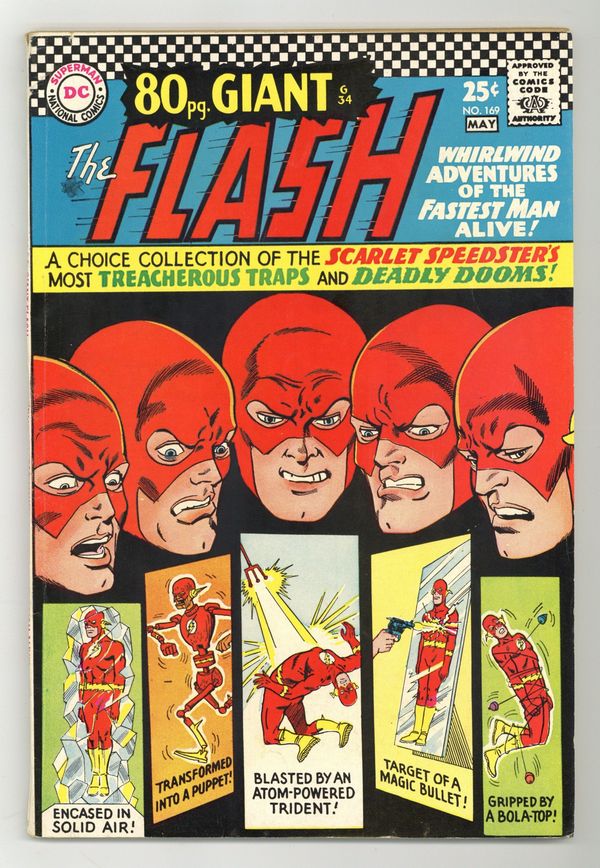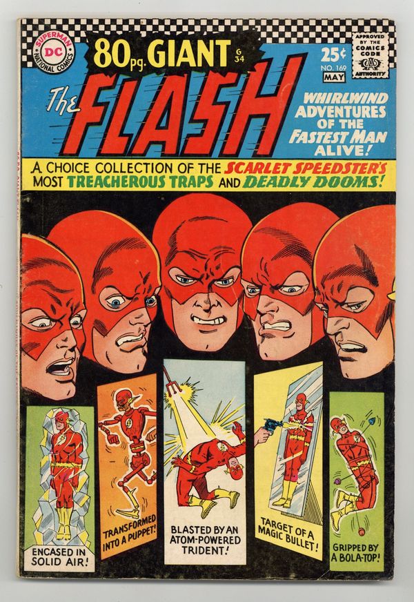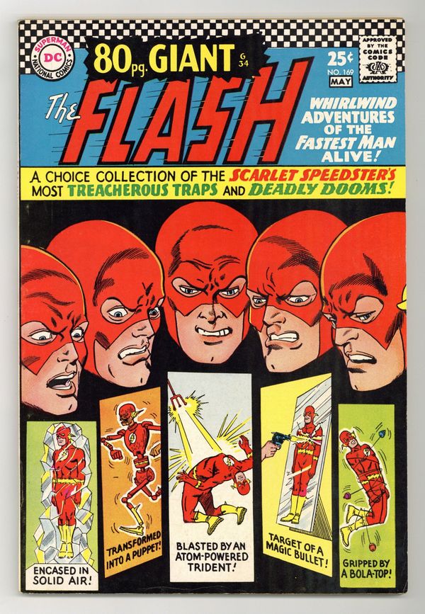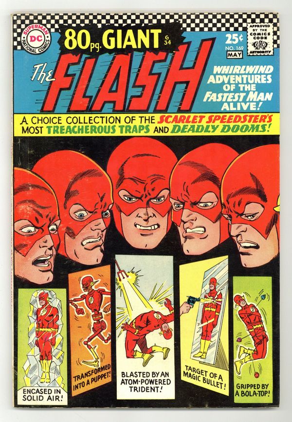 Cover pencils by Carmine Infantino, inks by Joe Giella. 80-page Giant G-34. "How I Draw The Flash," a two-page feature by Carmine Infantino. Flash stories reprinted in this issue are: 1) "Beware the Atomic Grenade!"; 2) "The Mirror Master's Magic Bullet!"; 3) "The Man Who Claimed the Earth!", in which a spaceman lands on Earth and decrees the planet to be a colony of his native world; 4) "Return of the Super-Gorilla!"; and "Plight of the Puppet-Flash!", which which Abra Kadabra turns Flash into a puppet. All stories drawn by Carmine Infantino with inks by Murphy Anderson or Joe Giella. Green Lantern ad. Atom ad. 84 Pages, Full Color. Cover price $0.25.