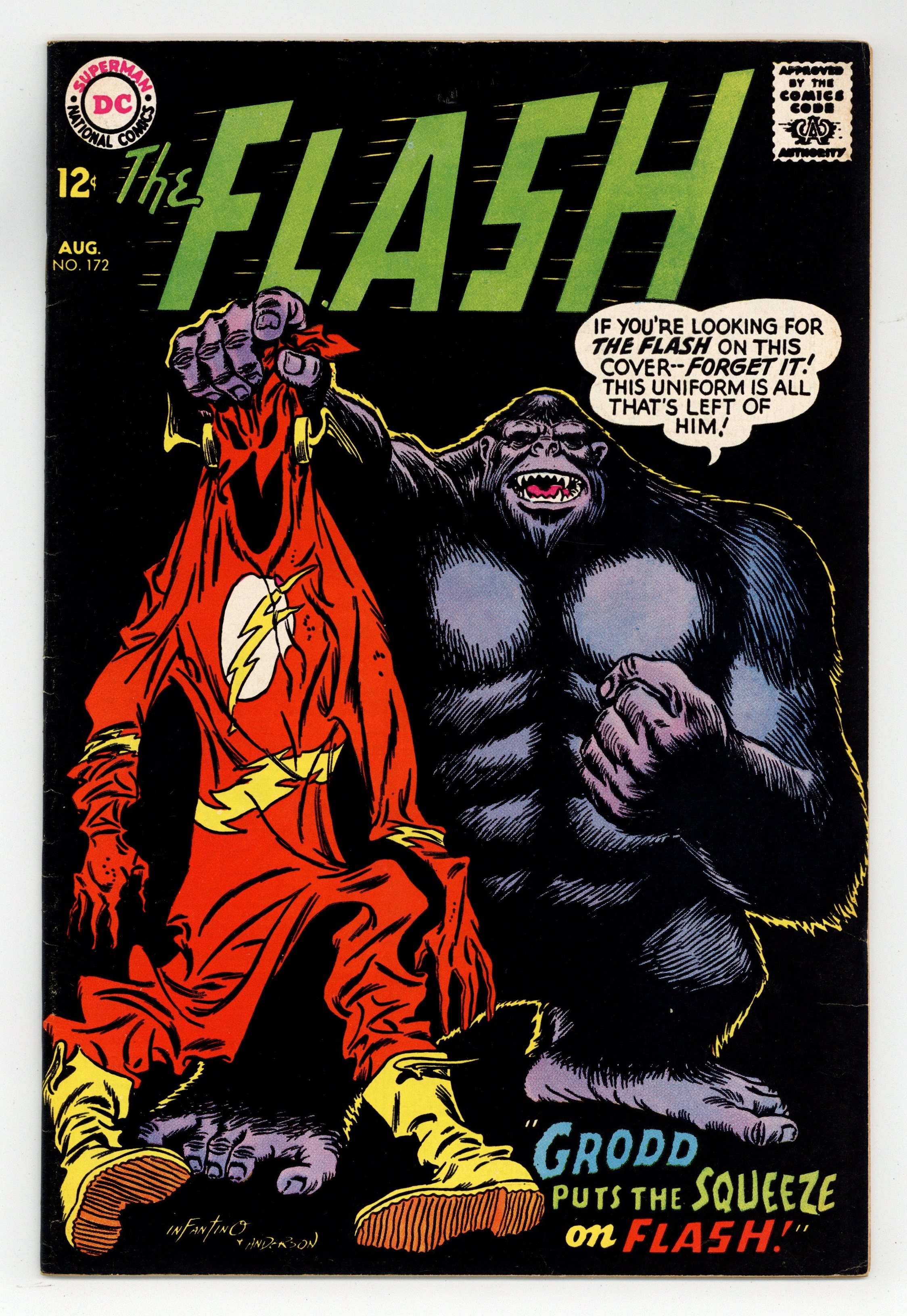 Cover pencils by Carmine Infantino, inks by Murphy Anderson. Grodd Puts the Squeeze on the Flash, script by John Broome, pencils by Carmine Infantino, inks by Sid Greene; Gorilla Grodd speeds up the citizens of Central City and uses them to force Flash to free him from his prison in Gorilla City. The Machine-Made Robbery!, script by John Broome, pencils by Carmine Infantino, inks by Sid Greene; Three criminals use Professor West's new computer to plan the perfect crime. Lone Ranger Aurora model kit ad. Batman 194 ad. 80 pg. Palisades Amusement Park ad with Superman. Giant Jimmy Olsen ad. 36 Pages, Full Color. Cover price $0.12.