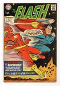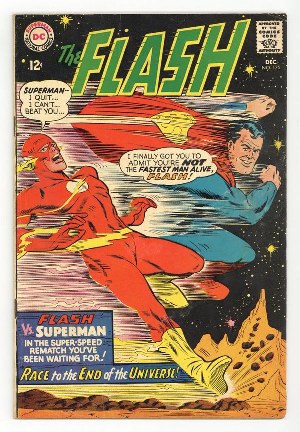 Cover pencils by Carmine Infantino, inks by Mike Esposito. The Race to the End of the Universe, script by E. Nelson Bridwell, pencils by Ross Andru, inks by Mike Esposito; Rokk and Sorban, two aliens who once encountered Superman and Batman, force Superman and The Flash to a rematch race.; Superman soon realizes the aliens are not who they seem to be, and the two help each other escape traps along the race and reach the finish line together, after which they unmask the aliens as Abra Kadabra and Professor Zoom; the second Flash/Superman race; marks a new era for The Flash as Carmine Infantino steps down as longtime penciler; he went on to become the editorial director for DC and then publisher, returning to the title as penciler in 1985. Letter to the editor from Infantino himself! Bob Hope, Scooter, and Fox and Crow ad. Mattels Major Matt Mason ad. Letter from comics historian Peter Sanderson. Cap's Hobby Hints strip by Henry Boltinoff. 36 Pages, Full Color. Cover price $0.12.