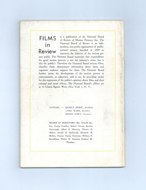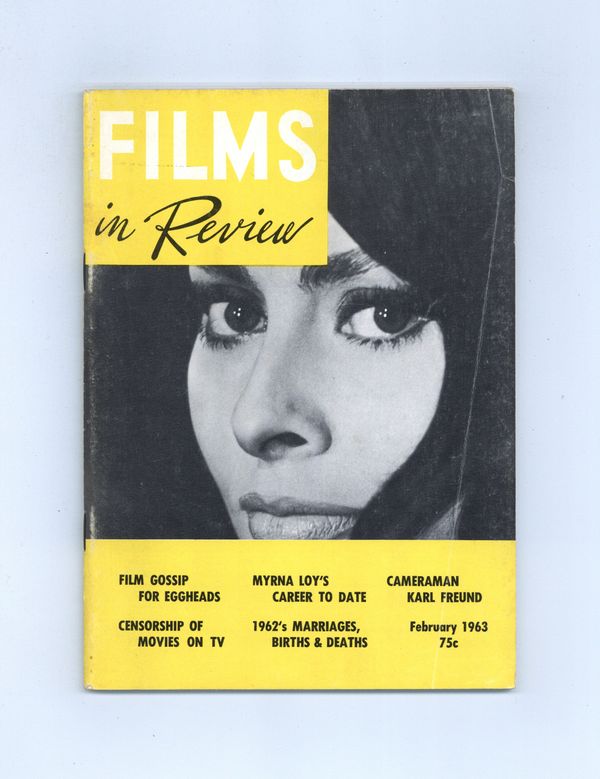 Published Feb 1963 by National Board of Review of Motion Pictures Inc..$16.00Volume 14, Issue 2 - February, 1963. Film in Review is a publication of the National Board of Review of Motion Pictures, Inc, an independent, non-profit organization of public citizens founded in 1909 to represent the interests of the motion picture public. This National Board further assists the development of the motion picture as a source of entertainment, as education, and as art, by providing media for the expression of the public's opinion about films and their cultural and social effects. This issue includes a Long 24-page article about Myrna Loy complete with her filmography, and heavily illustrated with black and white photos. Also includes movie reviews for classics such as "The Bad Sleep Well", "Days of Wine and Roses", "Five Miles to Midnight", "Thirty Years of Fun", and others. Plus movie reviews and letters. 5 1/2-in. x 7 1/2-in., 70 pages, B&W. Cover price $0.75.