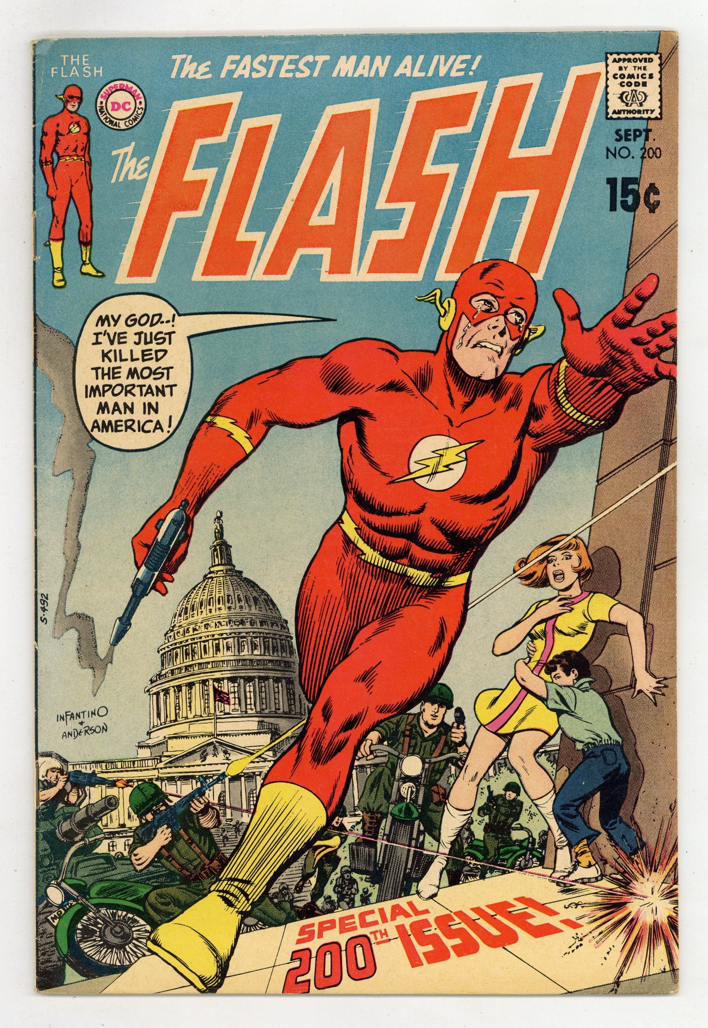 Cover pencils by Carmine Infantino, inks by Murphy Anderson. Count 200--and Die, script by Robert Kanigher, pencils by Irv Novick, inks by Murphy Anderson; a foreign spy named Dr. Lu brainwashes Flash into believing hes taking hairspray to his wife when what hes really doing is attempting to assassinate the president. Cameos by the Top, the Pied Piper, Captain Cold, Captain Boomerang, Heat-Wave, and the Mirror Master. Letter to the editor from comics writer Martin Pasko. DC questionnaire. Palisades Amusement Park ad with Batman, Superman, and Wonder Woman. Binky and Top Guns of the West ad. 36 Pages, Full Color. Cover price $0.15.