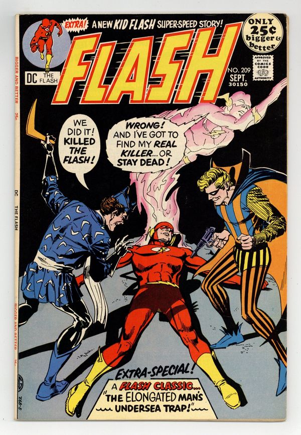 Cover art by Dick Giordano. Beyond the Speed of Life, script by Cary Bates, pencils by Irv Novick, inks by Dick Giordano; Flash is pulled into another plane of existence to help fight the Devourer, leaving his physical body behind; Trickster and Captain Boomerang think they are responsible for Flash's "apparent" death. Coincidence Can Kill!, script by Steve Skeates, pencils by Dick Dillin, inks by Dick Giordano; Kid Flash gets gassed by his costume ring. Letters to the editor from comics writers Martin Pasko and Mike Barr. Giordano cover. Flash Facts filler page about lightning flashes, a radiosonde, a stroboscope and the jet stream. Elongated Man's Undersea Trap, script by John Broome, pencils by Carmine Infantino, inks by Joe Giella; Elongated Man goes on a honeymoon with his new bride, debutante Sue Dearbon; reprinted story. 52 Pages, Full Color. Cover price $0.25.