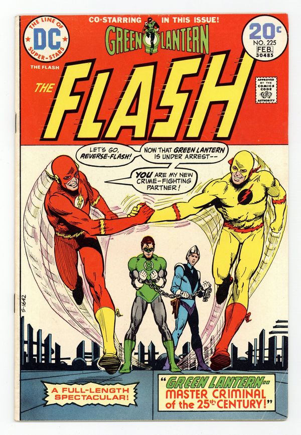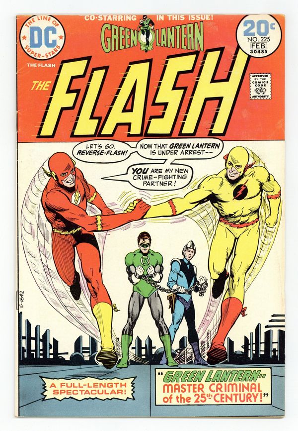 Tags: Flash$26.50Cover art by Nick Cardy. Green Lantern...Master Criminal of the 25th Century, script by Cary Bates, pencils by Irv Novick, inks by Dick Giordano; When a weird alien horse from the future starts to destroy the Earth in the present, Flash and Green Lantern travel to the future to team up with Professor Zoom to try to stop it. Short essay about the Comicmobile, created by Sol Harrison to deliver comics. Letter from noted letter hack Guy Lillian III. Rudolph the Red Nosed Reindeer tabloid ad. 100 Page Batman and Witching Hour ad. See-Action Football Game ad in strip form. 36 Pages, Full Color. Cover price $0.20.