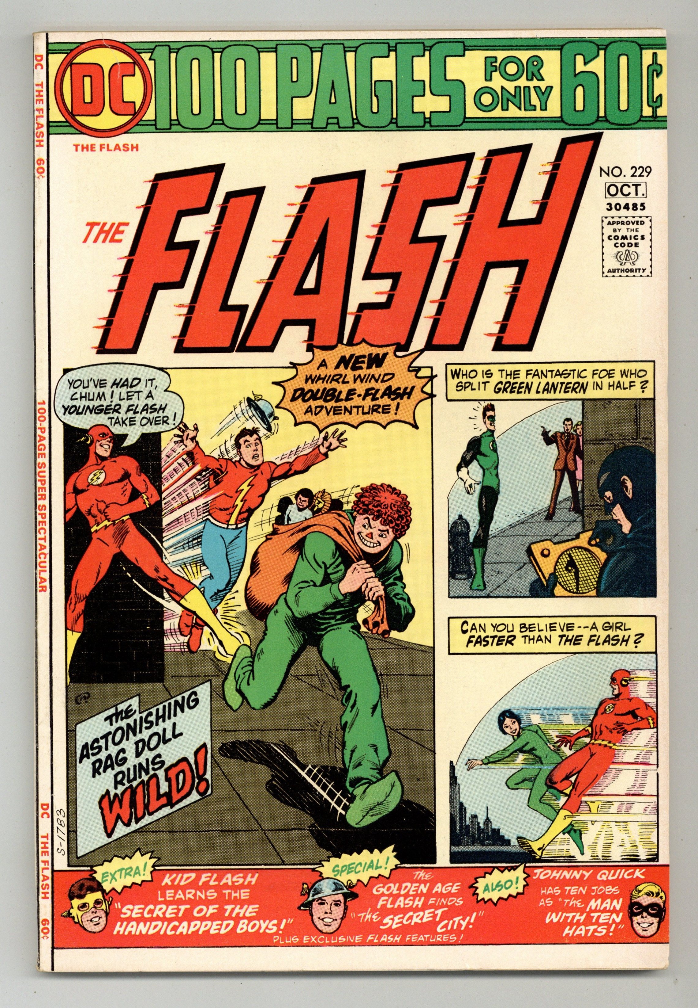 100-page giant. Cover art by Nick Cardy. Flash and the Golden Age Flash team up in the new story The Rag Doll Runs Wild!, script by Cary Bates, pencils by Irv Novick, inks by Frank McLaughlin; Barry Allen travels to Earth-2 when Joan Garrick contacts him and tells him that Jay is acting strangely; the two Flashes stop The Thinker and Rag Doll who are on a crime spree. The other stories in this 100-page special are reprints. Half a Green Lantern Is Better Than None!, script by John Broome, pencils by Gil Kane, inks by Sid Greene; Black Hand has created a device to store Green Lantern's ring energy and tries to use that energy to imprison Green Lantern in another dimension. Pinup including all three Flashes. Find-a-Word Flash puzzle. Secret of the Handicapped Boys! starring Kid Flash, script by John Broome, pencils by Carmine Infantino, inks by Joe Giella. Trivia questions on Flash history and foes. The Man Who Wore Ten Hats! starring Johnny Quick, script by Bill Finger, pencils by Mort Meskin, inks by George Roussos. The Secret City starring Jay Garrick, script by Robert Kanigher, pencils by Carmine Infantino, inks by Frank Giacoia. Girl From the Super-Fast Dimension! starring Barry Allen, script by Gardner Fox, pencils by Carmine Infantino, inks by Joe Giella. 100 Pages, Full Color. Cover price $0.60.