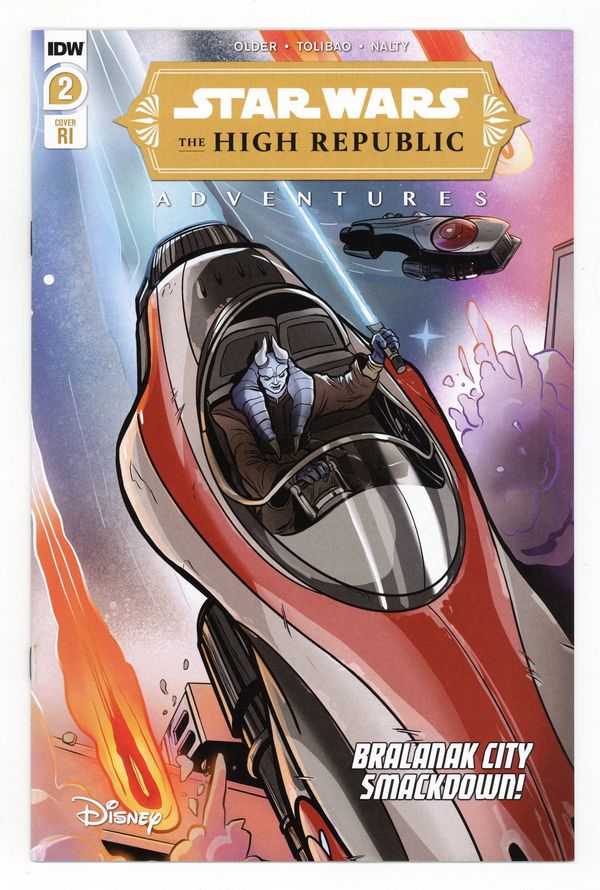 Limited 1 for 10 Retailer Incentive Variant Cover. Written by Daniel Jose Older. Art by Harvey Tolibao. Cover by Yael Nathan. Flaming destruction has come to Trymant IV! Childhood best friends Zeen and Krix try to find safety, while Yoda's Padawans, Lula, Farzal, and Qort are trying to evacuate the citizens, but the Nihil ship won't let anyone onboard. And when a massive battle breaks out, Krix and Zeen get torn apart! Writer Daniel José Older, bestselling author of Star Wars: Last Shot, and artist Harvey Tolibao bring IDW into The High Republic, a massive publishing crossover spanning comics and prose! 28 pages, full color. Cover price $3.99.