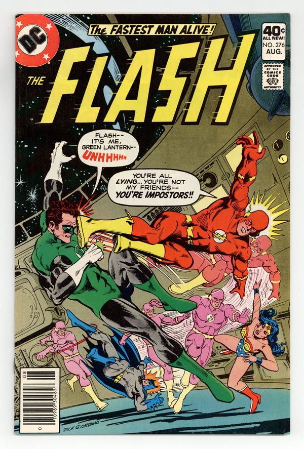 Cover art by Dick Giordano. Freakout!, script by Cary Bates, pencils by Alex Saviuk, inks by Frank Chiaramonte; As Iris West-allen is killed at a party, Barry is given a dose of angel dust by an unknown person and hallucinates that he beats Clive Yorkin to death; Barry recuperates in a hospital and then goes on a rampage when his Justice League comrades refuse to help him bring Iris back from the dead; Entire story may be a drug-induced hallucination in Flash's mind; part of the story certainly is. O.J. Simpson Spot-bilt shoe ad. Jonah Hex and Superman 100-pager ad. Pete Rose Batting Practice sporting good ad. All-Out War ad. Super-hero shirts ad. Superman 338 ad. Hembeck strip. 36 Pages, Full Color. Cover price $0.40.