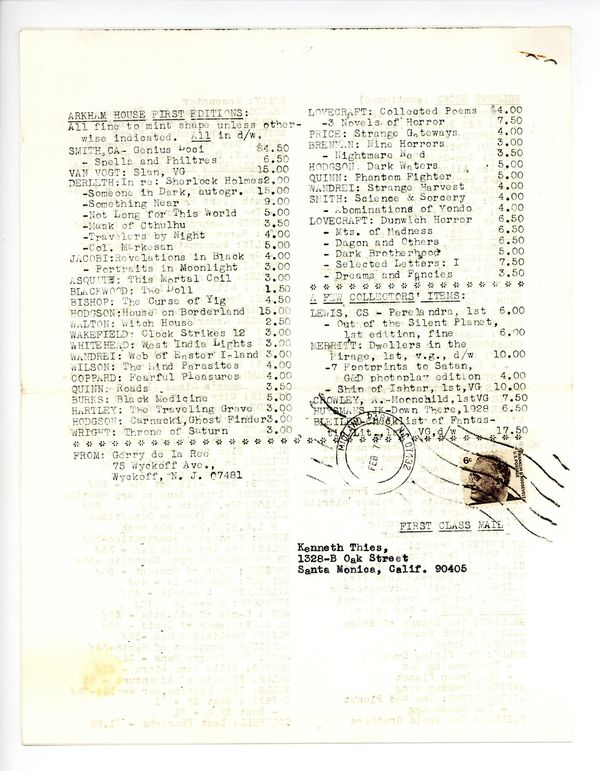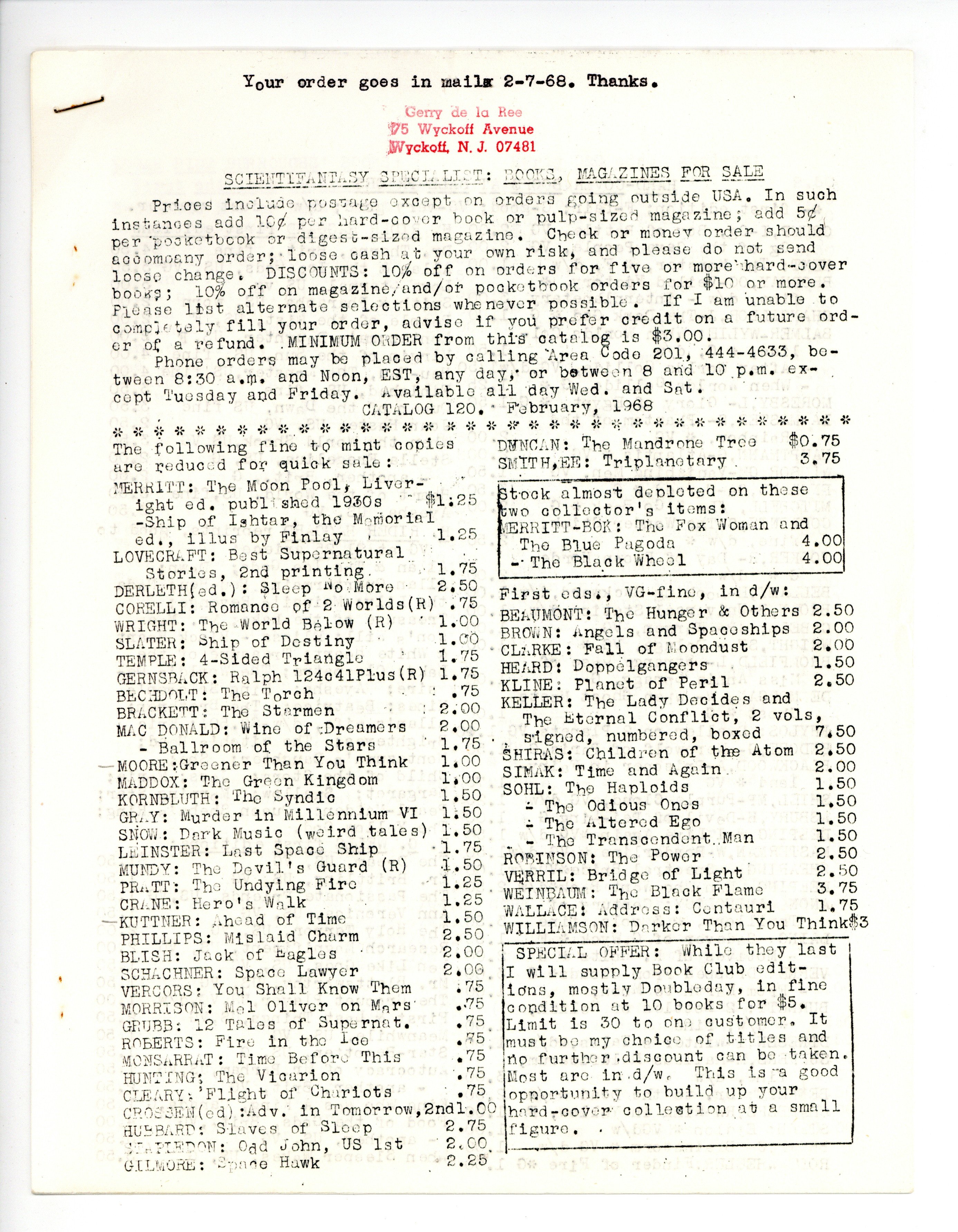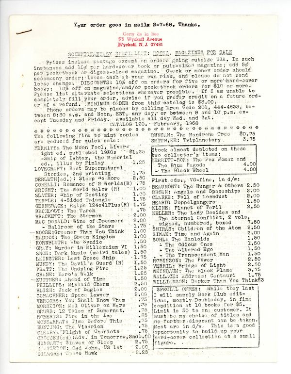 Catalog 120 - February 1968. Selection of Science Fiction and Weird Fantasy books and magazines offered by Gerry de la Ree, noted fan, collector, and small press publisher. Xeroxed, typed catalog of hardcovers, paperbacks, and magazines. 8.5" x 11". 8 pages.