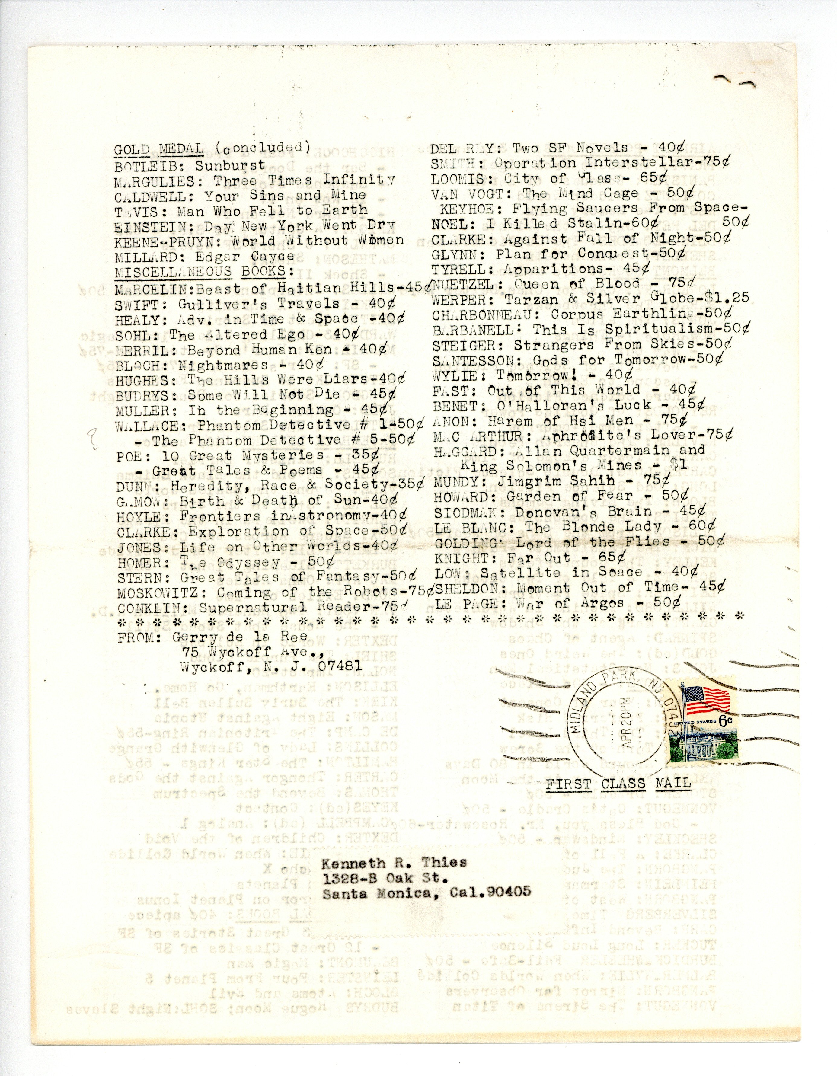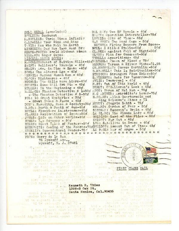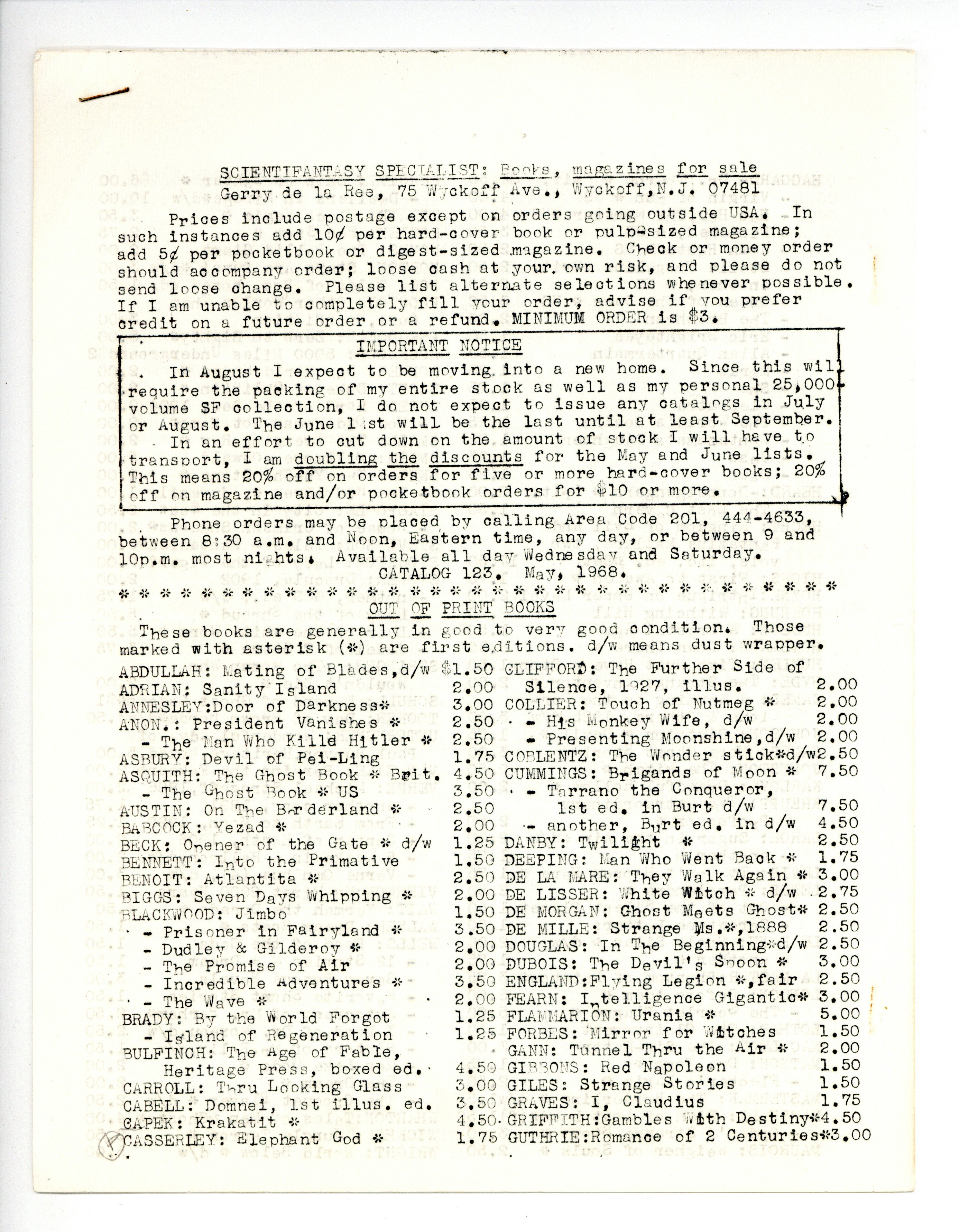 Catalog 123 - May 1968. Selection of Science Fiction and Weird Fantasy books and magazines offered by Gerry de la Ree, noted fan, collector, and small press publisher. Xeroxed, typed catalog of hardcovers, paperbacks, and magazines. 8.5" x 11". 8 pages.