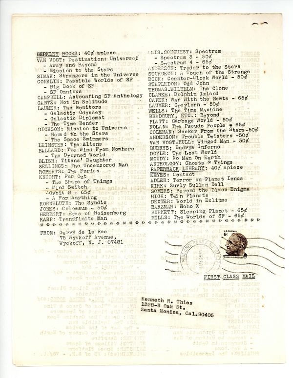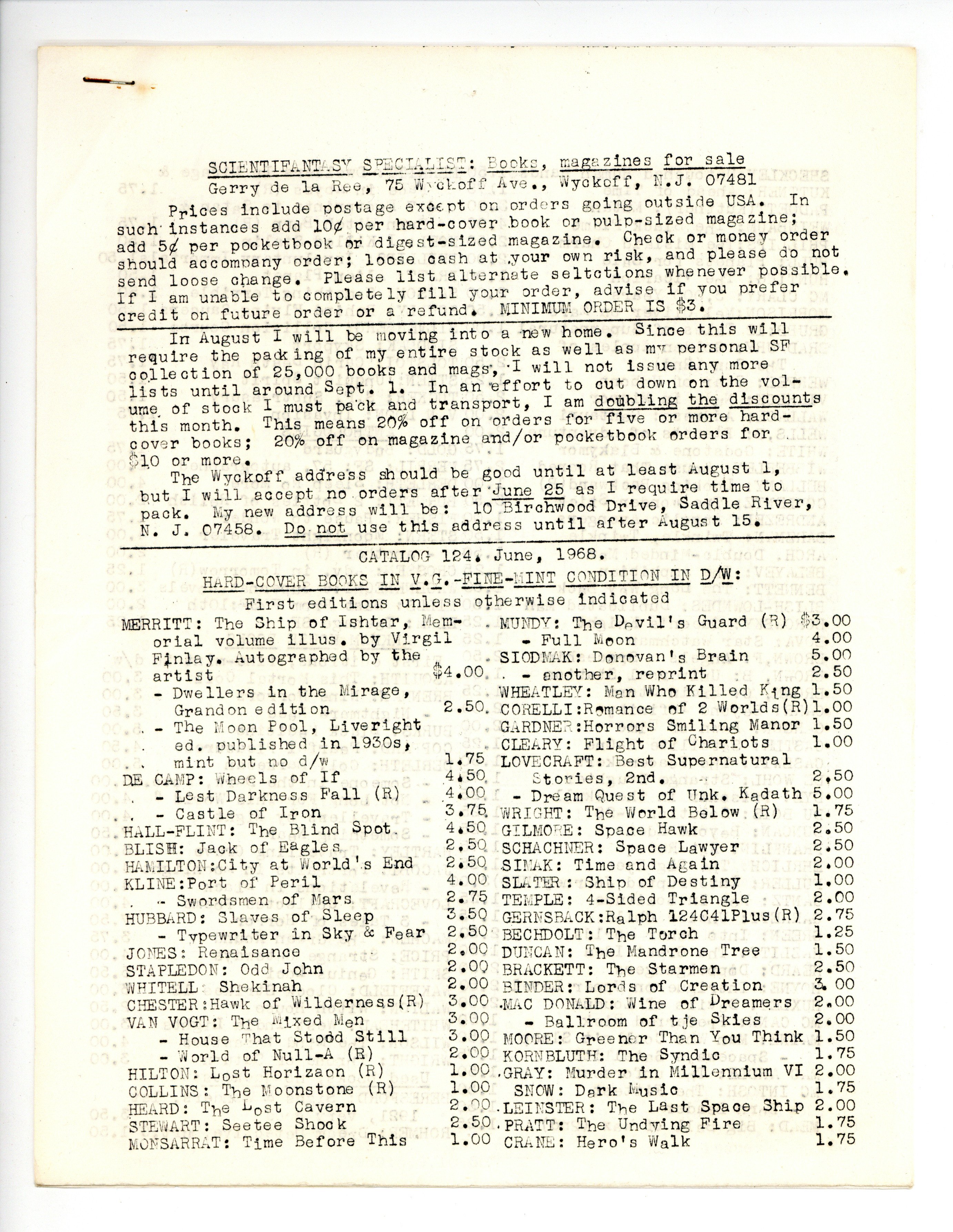 Catalog 124 - June 1968. Selection of Science Fiction and Weird Fantasy books and magazines offered by Gerry de la Ree, noted fan, collector, and small press publisher. Xeroxed, typed catalog of hardcovers, paperbacks, and magazines. 8.5" x 11". 8 pages.