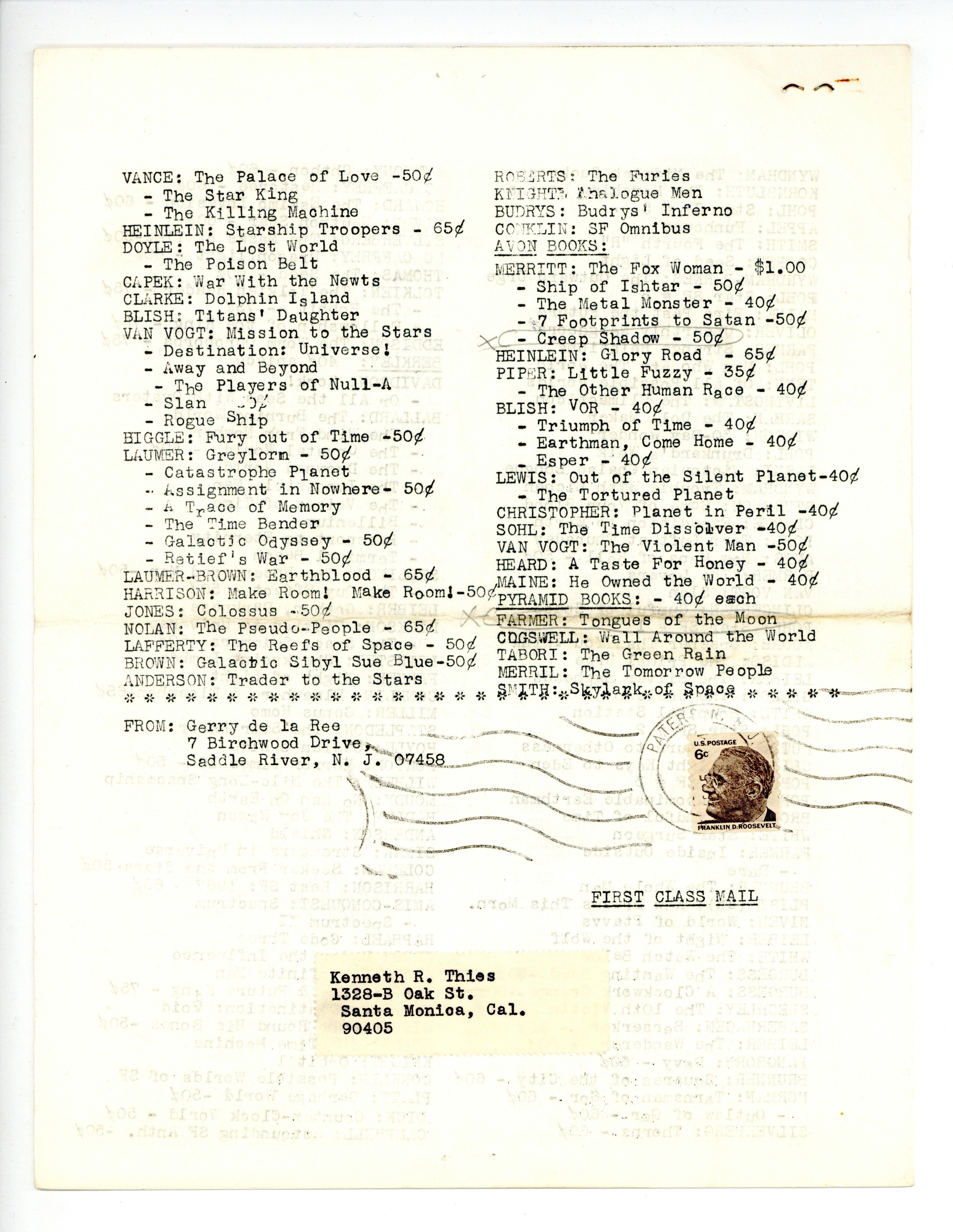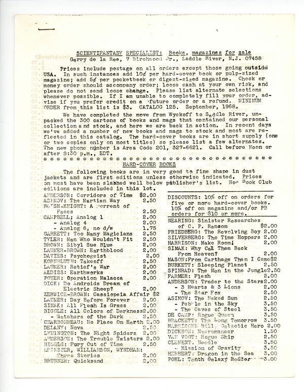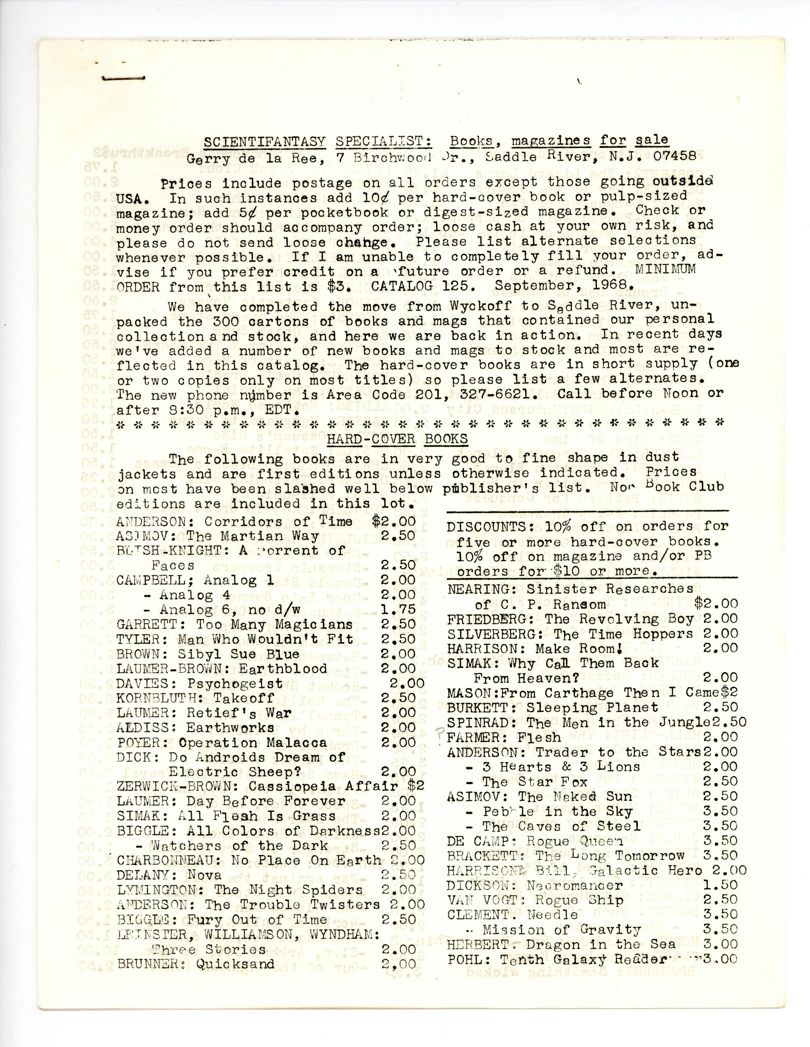 Catalog 125 - September 1968. Selection of Science Fiction and Weird Fantasy books and magazines offered by Gerry de la Ree, noted fan, collector, and small press publisher. Xeroxed, typed catalog of hardcovers, paperbacks, and magazines. 8.5" x 11". 8 pages.