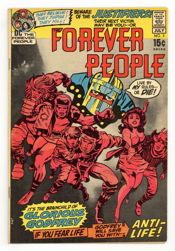 Cover pencils by Jack Kirby, inks by Vince Colletta. Life vs. Anti-Life!, script and pencils by Jack Kirby, inks by Vince Colletta; Glorious Godfrey captures the Forever People. Letters to the editor from dark fantasy/science fiction writer Harlan Ellison and comics writer Martin Pasko. 32 pgs. $0.15. Cover price $0.15.