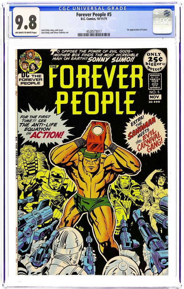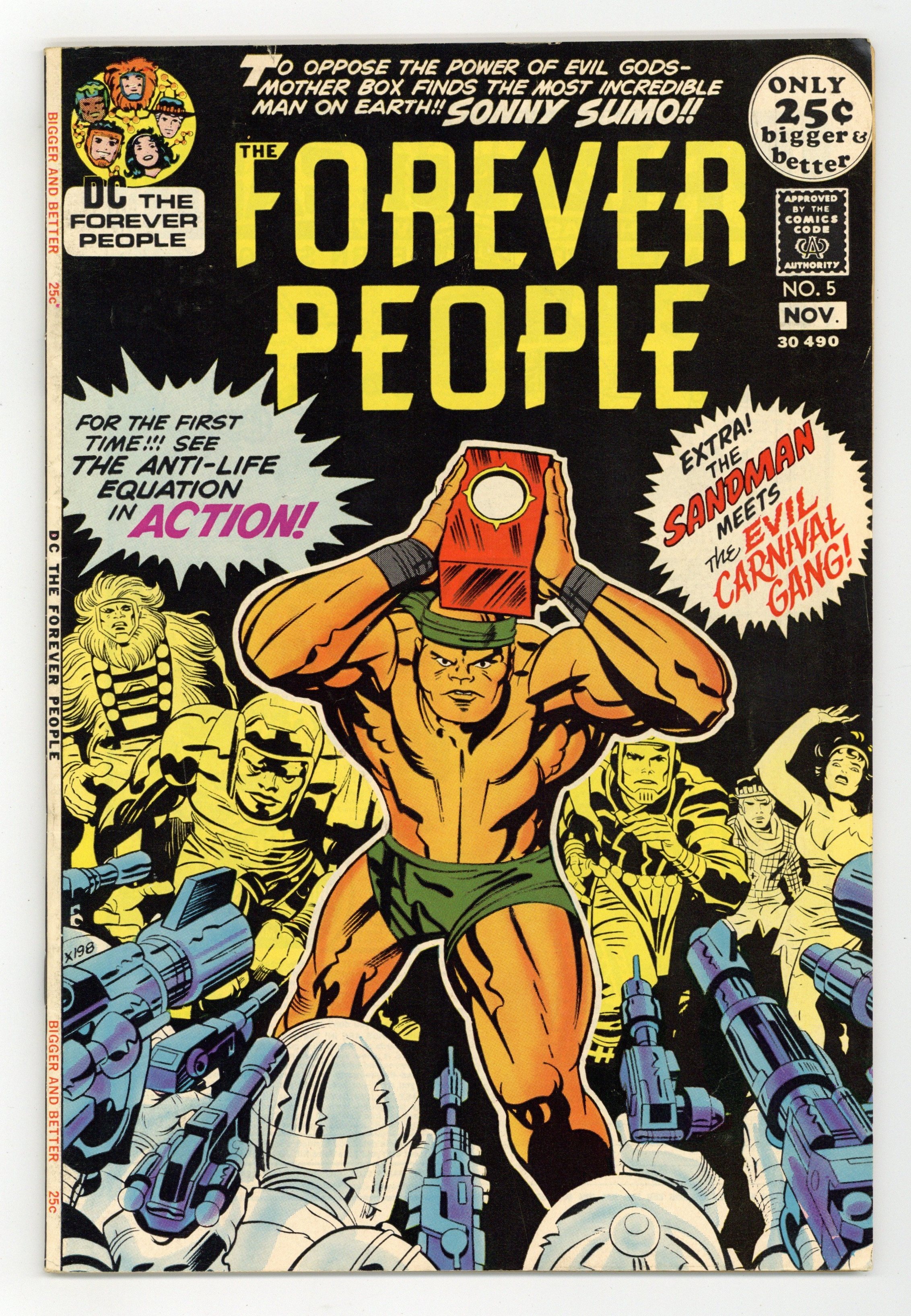 Cover pencils by Jack Kirby, inks by Mike Royer. Sonny Sumo, script and pencils by Jack Kirby, inks by Vince Colletta; Mother Box brings Sonny Sumo to Happyland to rescue the Forever People from Desaad. Adventure Comics #84 ad with Sandman, pencils by Jack Kirby, inks by Joe Simon. Crime Carnival!, script and pencils by Jack Kirby, inks by Joe Simon; Sandman and Sandy must solve a series of unusual crimes being committed by members of the Mammoth Circus, who seem to always elude members of the Police with a getaway car that converts into a truck. Introducing Lonar featuring The Young Gods of Supertown, script and pencils by Jack Kirby, inks by Vince Colletta; Lonar frees Thunderer from suspended animation. 48 pgs. $0.25. Cover price $0.25.