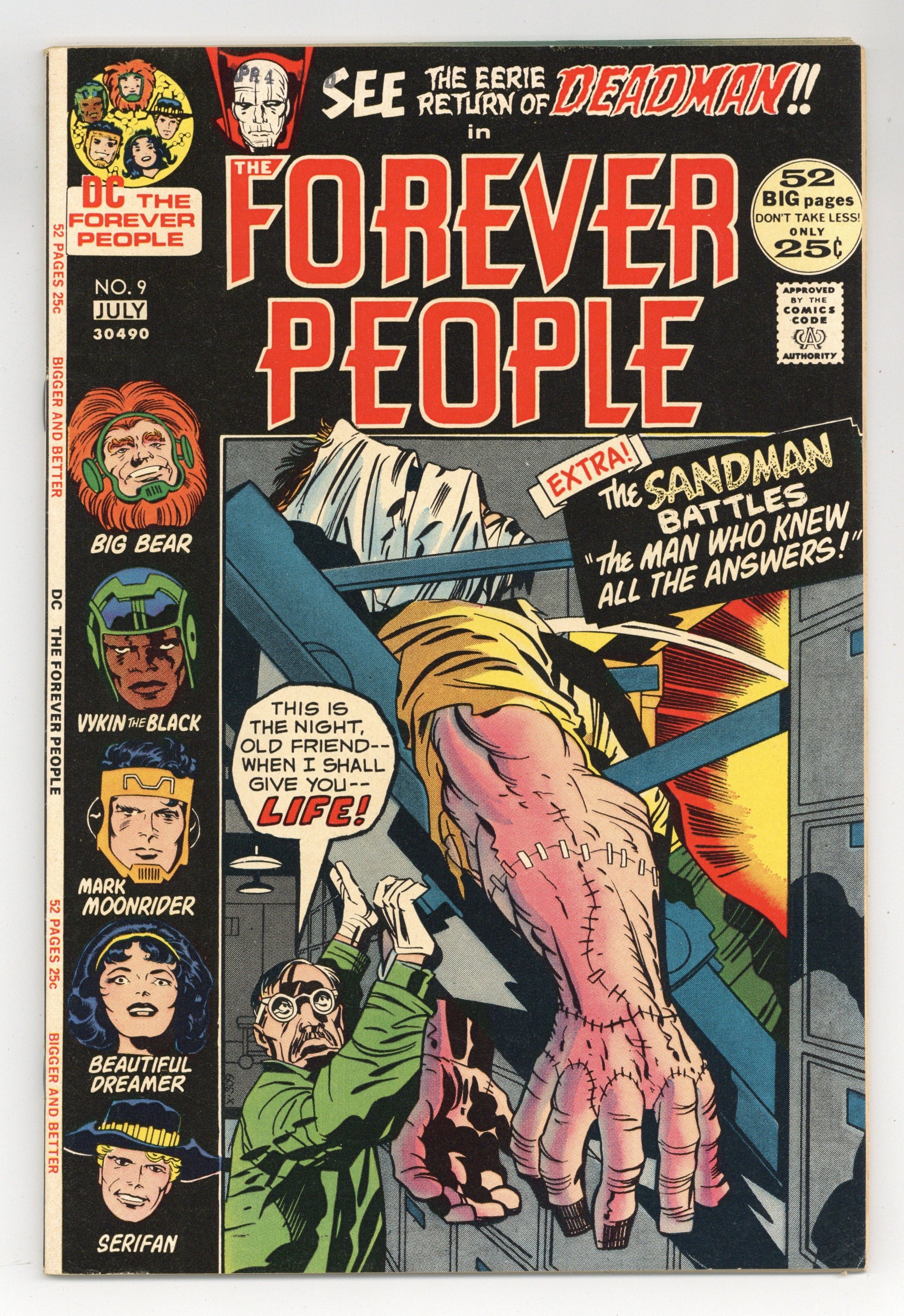 Cover pencils by Jack Kirby, inks by Mike Royer. Monster in the Morgue!, script and pencils by Jack Kirby, inks by Mike Royer; "Doc" Gideon steals one of Serafan's capsules to use it to re-animate a corpse made of assorted body parts; Deadman turns up at a séance and contacts the Forever People. Adventure Comics #74 with Sandman, pencils by Jack Kirby. The Man Who Knew All the Answers!, script and pencils by Jack Kirby; Sandman and Sandy face the threat of a scientist who has invented a machine whose revitalizing vibrations allow a man to develop his unused brain cells, tripling his thinking power! 48 pgs. $0.25. Cover price $0.25.