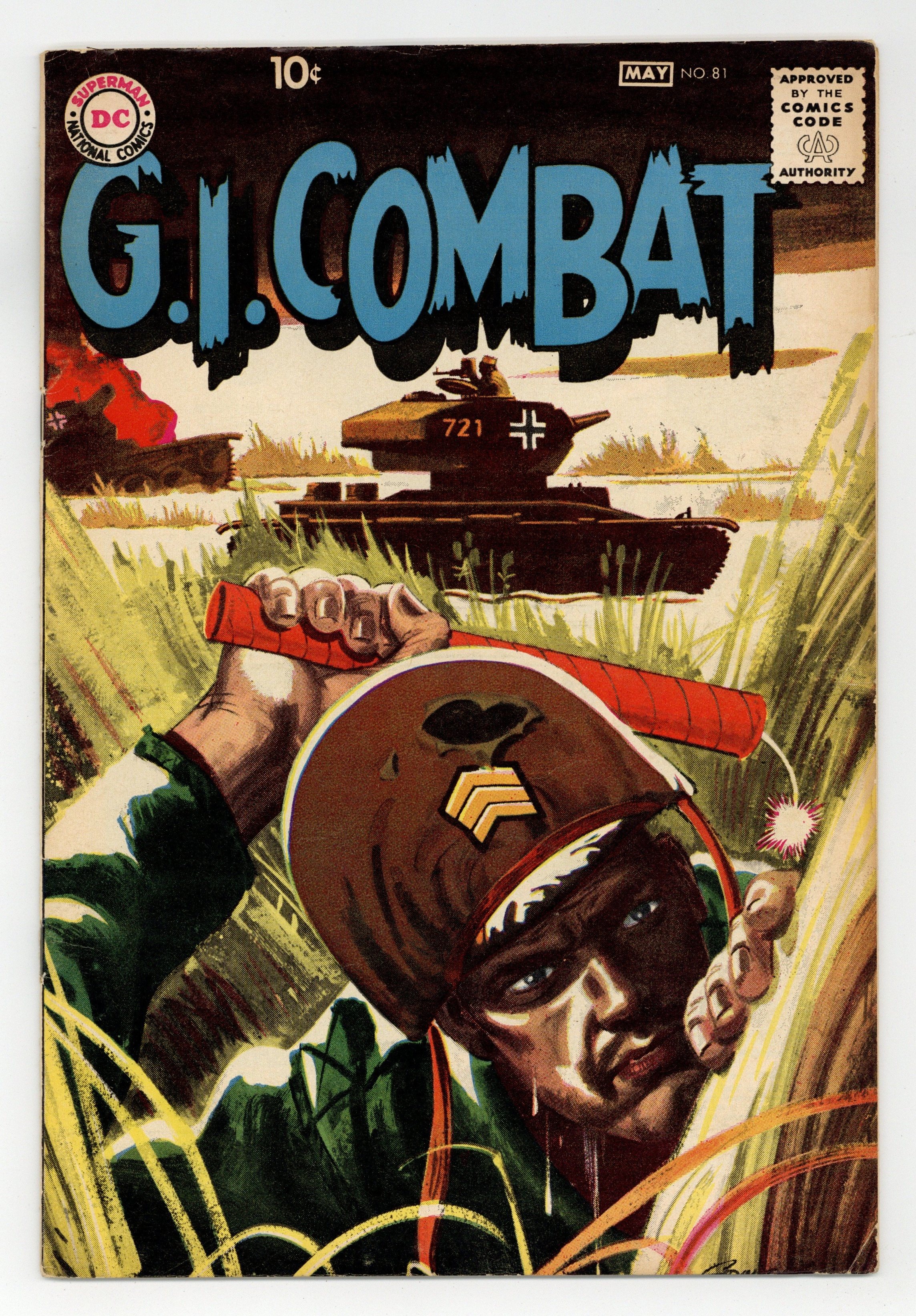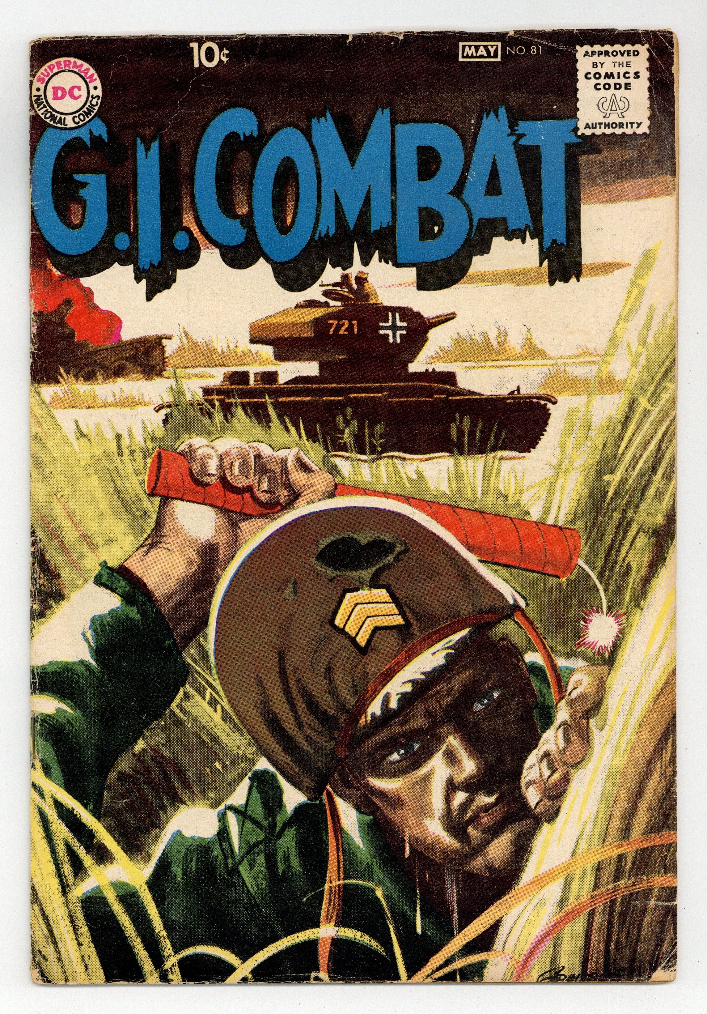 Cover by Jerry Grandenetti and Jack Adler (washtone). Written by Robert Kanigher and Bob Haney. Art by Jerry Grandenetti, Jack Abel, Ross Andru and Mike Esposito. In this issue: "Jump for Glory!" by Robert Kanigher and Jerry Grandenetti; "Tiger in Town!" by Bob Haney and Jack Abel; "Fire Lane!" by Haney, Ross Andru and Mike Esposito; 2-pager "The Thunderbolts...Battle Story of the 11th Armored Division"; and half-pager "Service Squadron Six." 36 Pages, Full Color. Cover price $0.10.