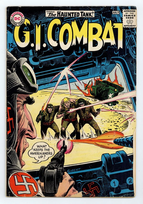 $18.50Cover by Joe Kubert. Written by Robert Kanigher and Kin Platt. Art by Joe Kubert and Jack Abel. Jeb is ordered to capture some German tankers and return with the prisoners for interrogation. When a tank shell briefly knocks him unconscious, he believes he's fighting in the Civil War in "Two-Sided War!" by Robert Kanigher and Joe Kubert. Starring the Haunted Tank, Jeb Stuart, Arch Asher, Rick Rawlins, Slim Stryker and General J.E.B. Stuart (ghost). Plus: "Boobytrap Souvenir" by Kin Platt and Jack Abel. And: 2-pager "Power for Peace...Battle Story of the 29th Bombardment Group." 36 Pages, Full Color. Cover price $0.12.