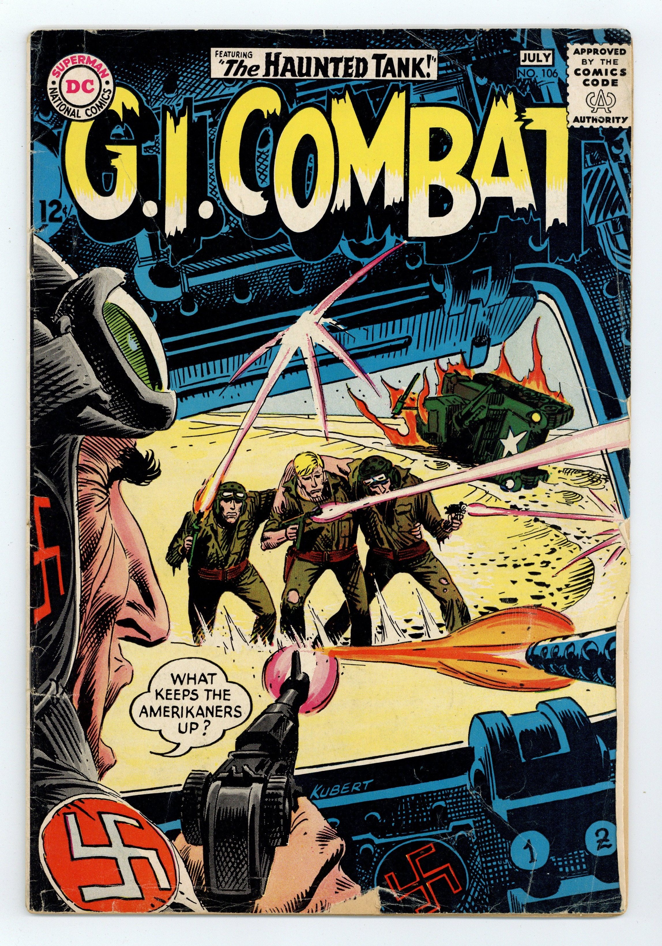 Cover by Joe Kubert. Written by Robert Kanigher and Kin Platt. Art by Joe Kubert and Jack Abel. Jeb is ordered to capture some German tankers and return with the prisoners for interrogation. When a tank shell briefly knocks him unconscious, he believes he's fighting in the Civil War in "Two-Sided War!" by Robert Kanigher and Joe Kubert. Starring the Haunted Tank, Jeb Stuart, Arch Asher, Rick Rawlins, Slim Stryker and General J.E.B. Stuart (ghost). Plus: "Boobytrap Souvenir" by Kin Platt and Jack Abel. And: 2-pager "Power for Peace...Battle Story of the 29th Bombardment Group." 36 Pages, Full Color. Cover price $0.12.